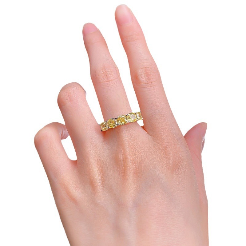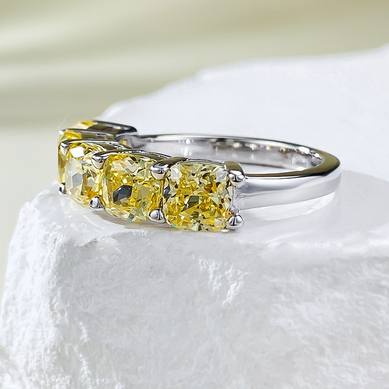 慕景珠宝S925银新品5*5mm肥方黄钻五颗石戒指女欧美跨境款
