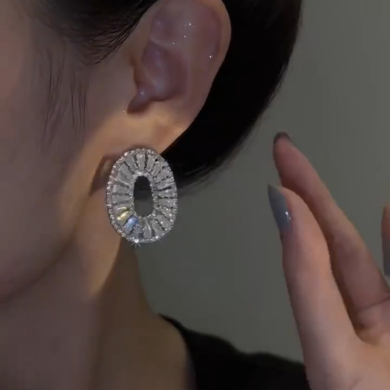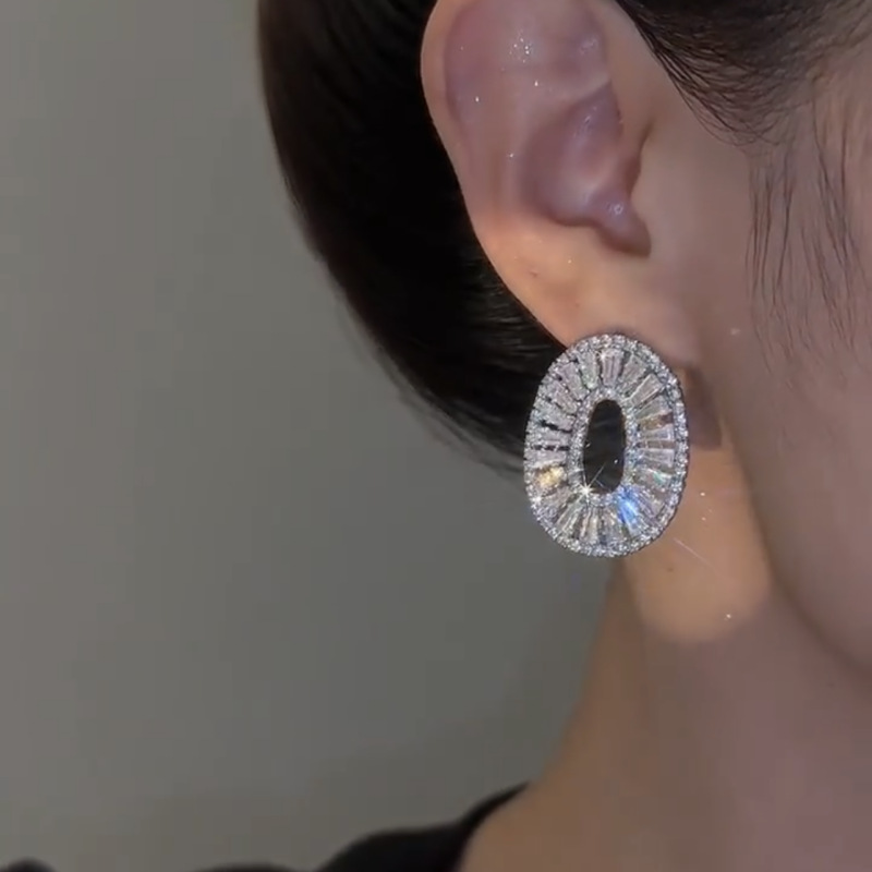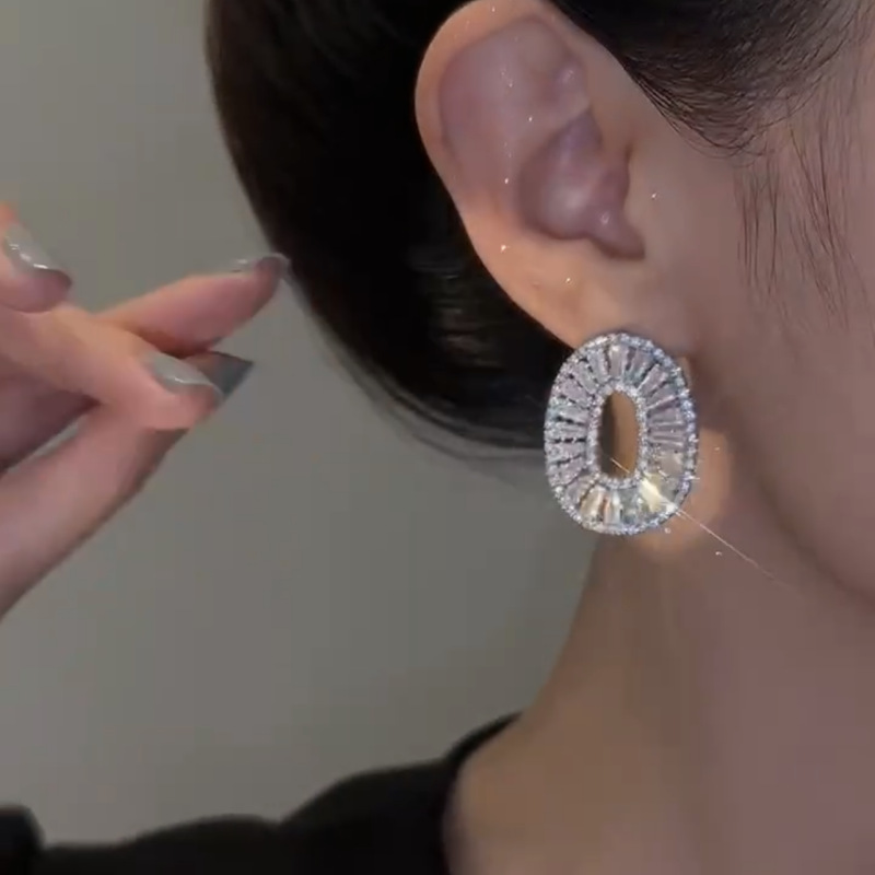 高级感椭圆满钻锆石耳钉气质几何椭圆显瘦大耳环轻奢名媛小众耳饰