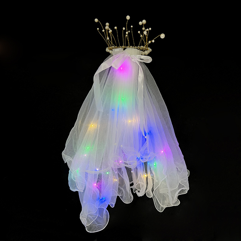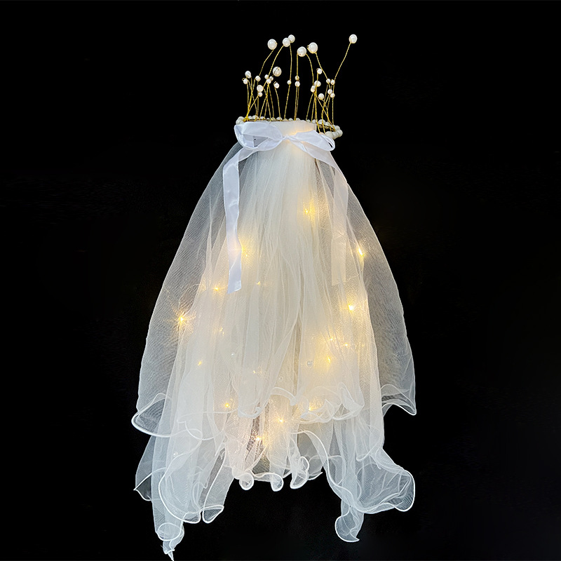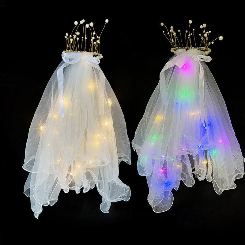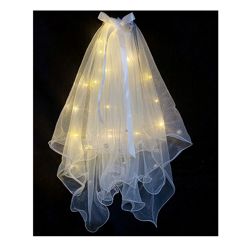 新款夜市网红同款双层蝴蝶结珍珠带灯网纱拍照女发夹唯美发光头纱