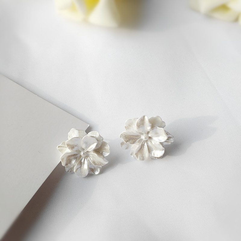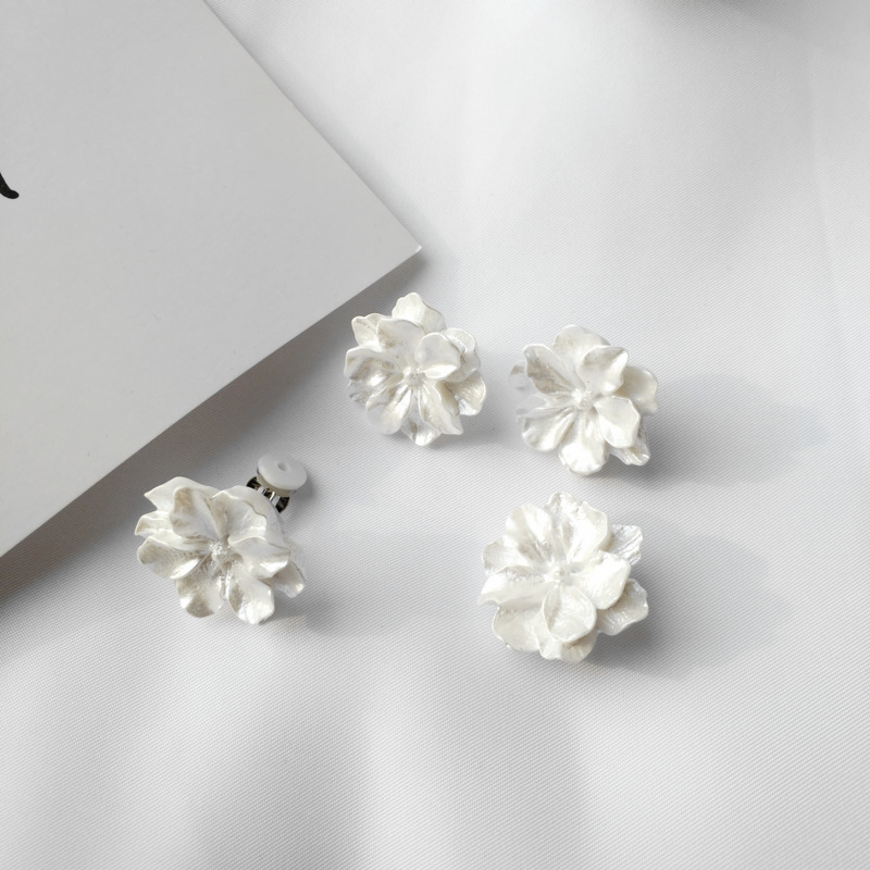 s925银玻利维亚白花法式优雅纯洁温柔日系纯白花朵耳钉软垫耳夹
