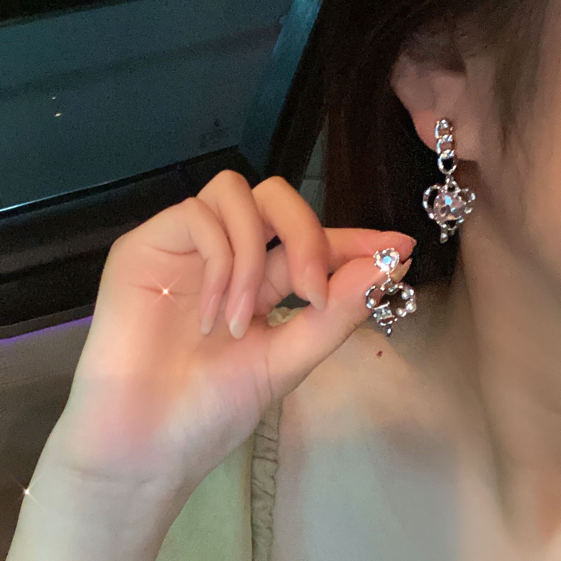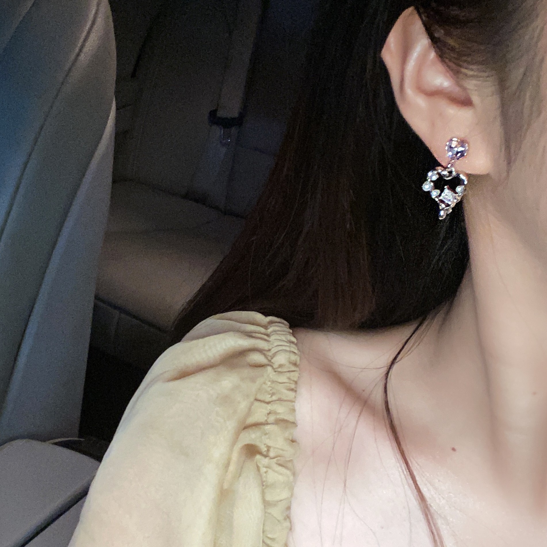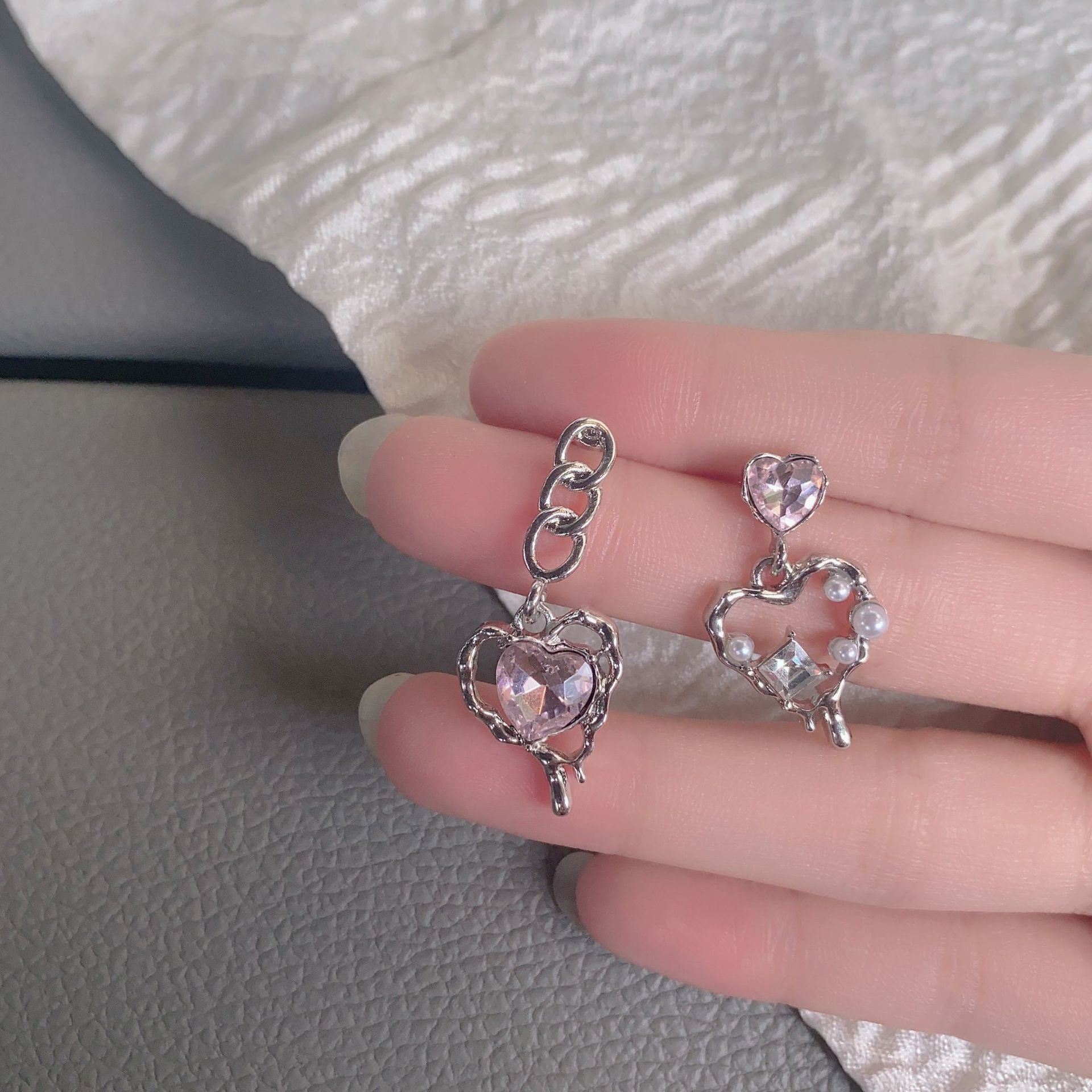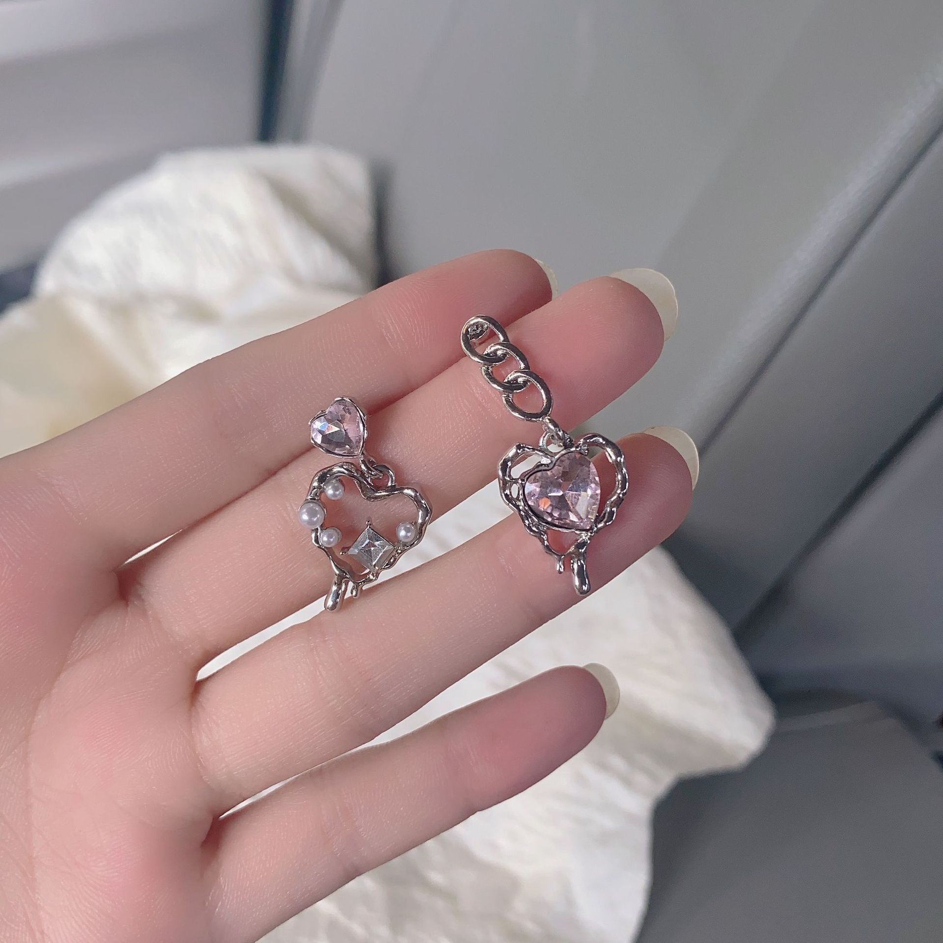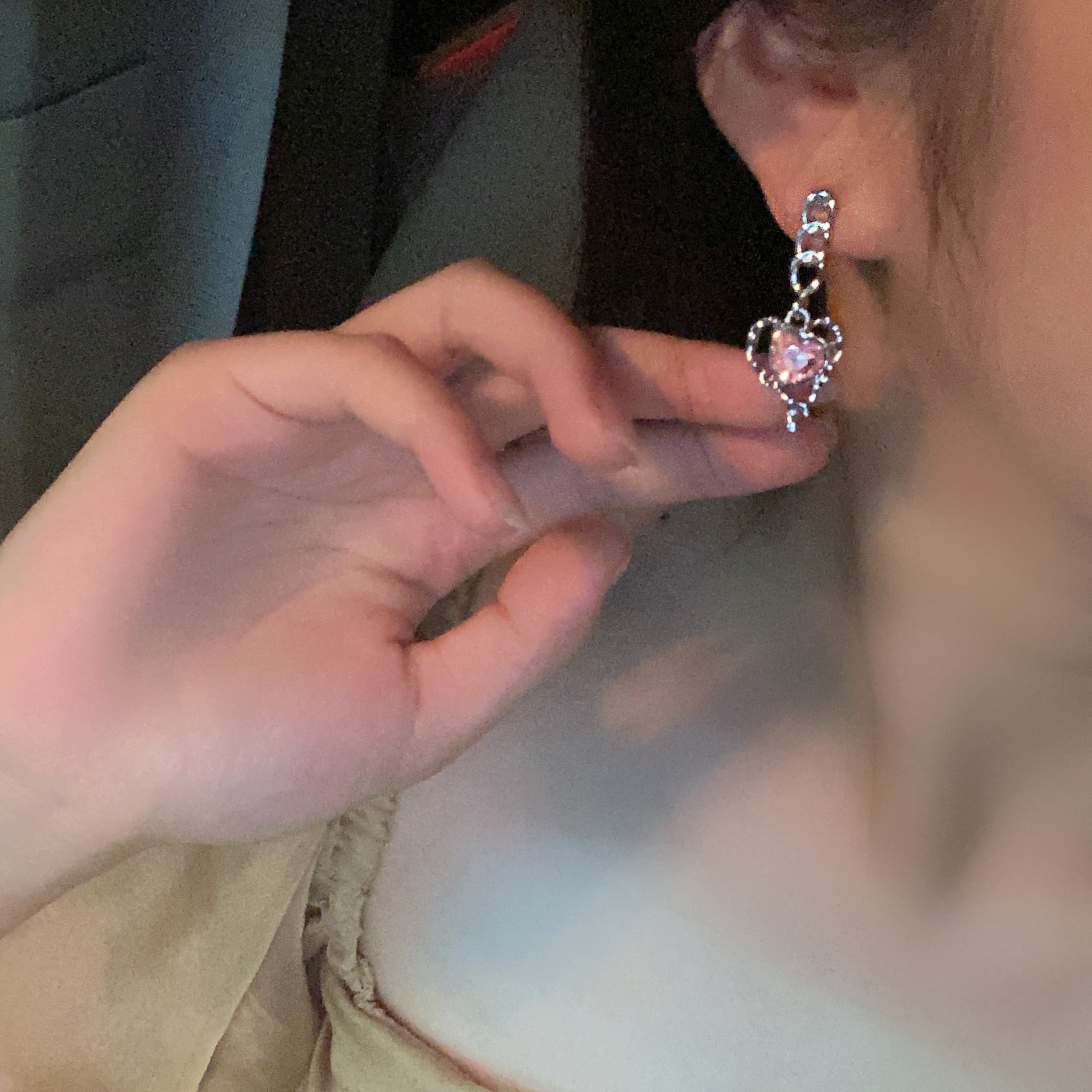 甜酷小众设计感不对称耳环粉色爱心锆石耳钉日常新款潮耳夹无耳洞