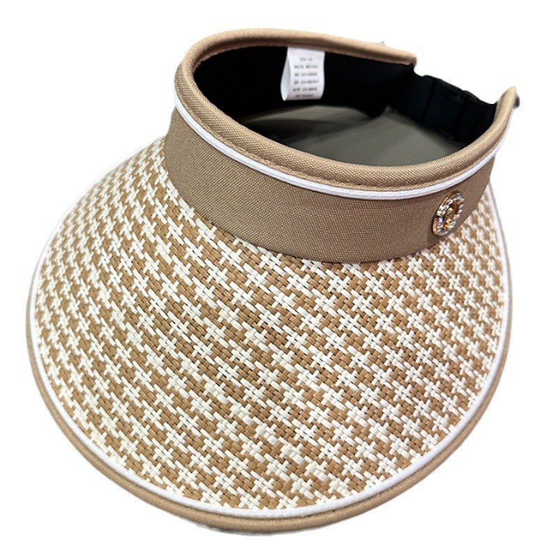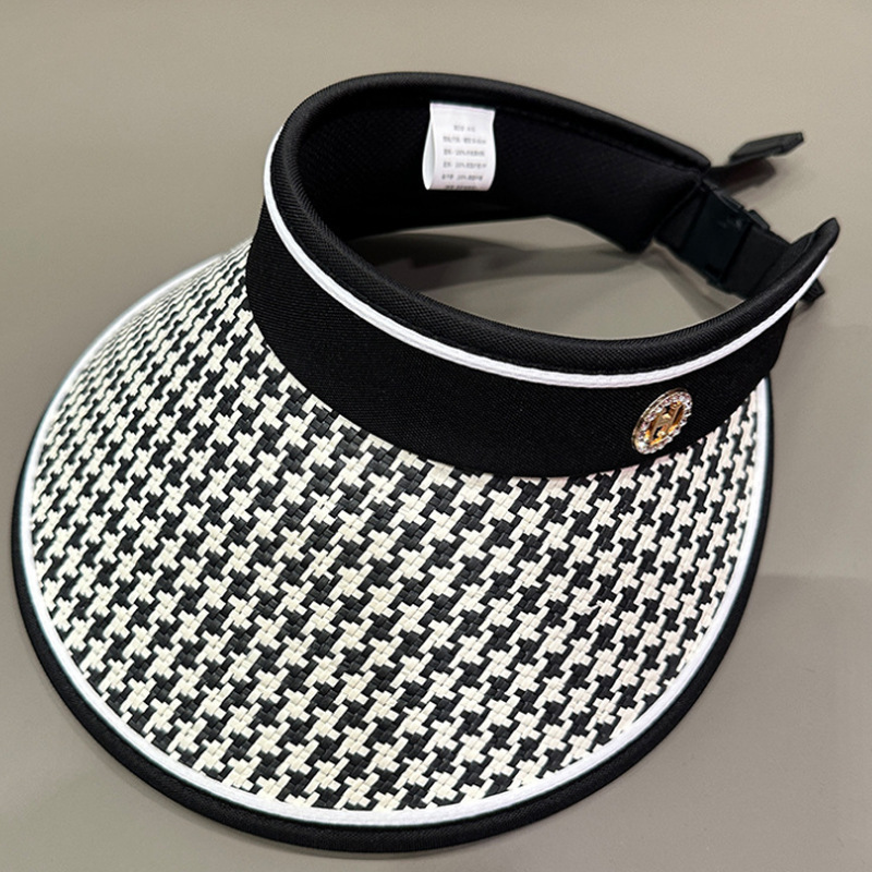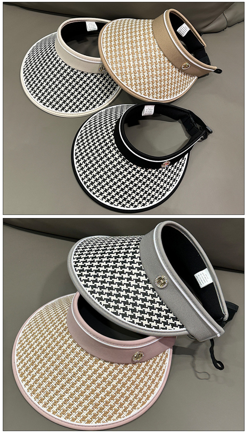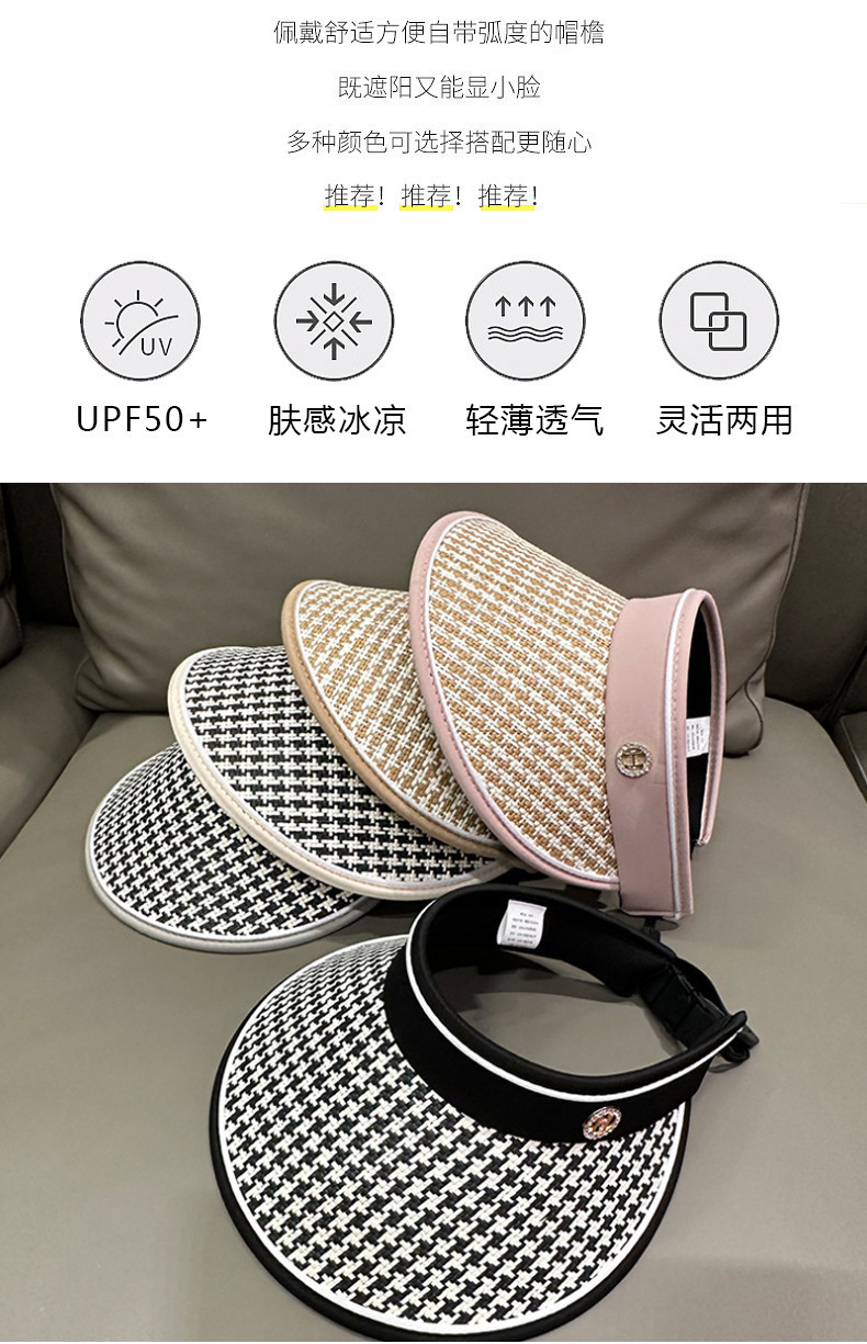 千鸟格空顶帽女夏季新款大檐遮阳帽日系草编洋气沙滩防晒太阳帽