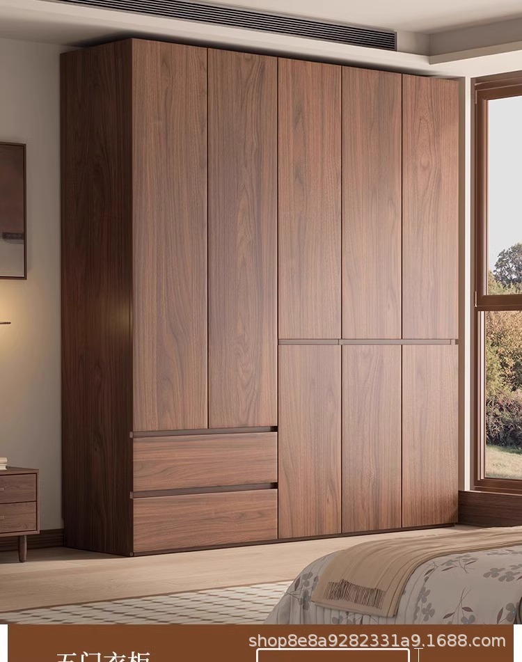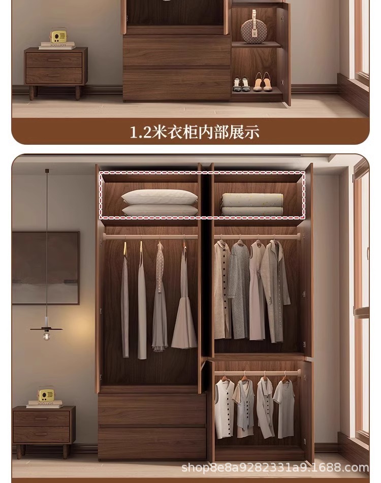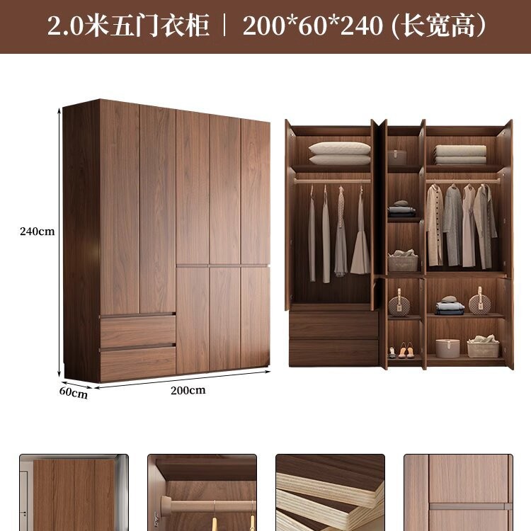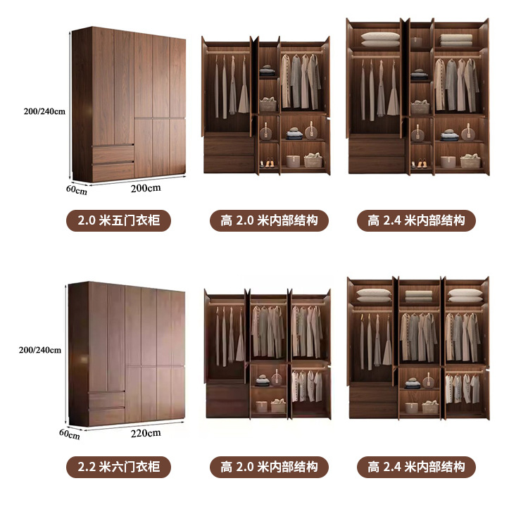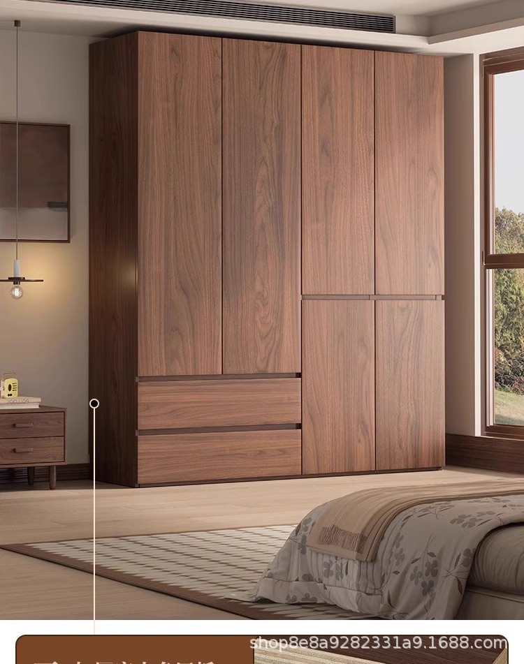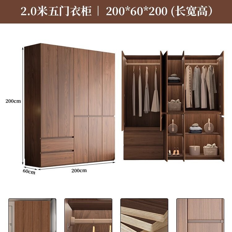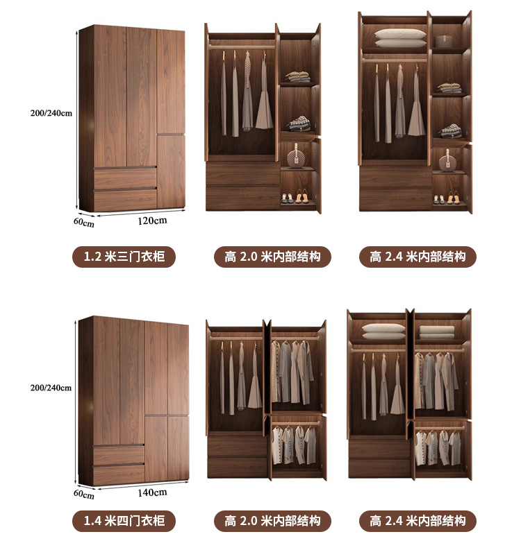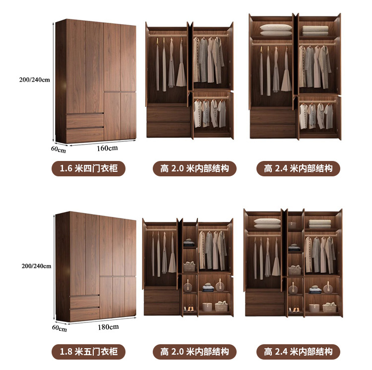 佛山工厂批发实木多层板衣柜家用卧室胡桃色现代简约分段式大衣橱