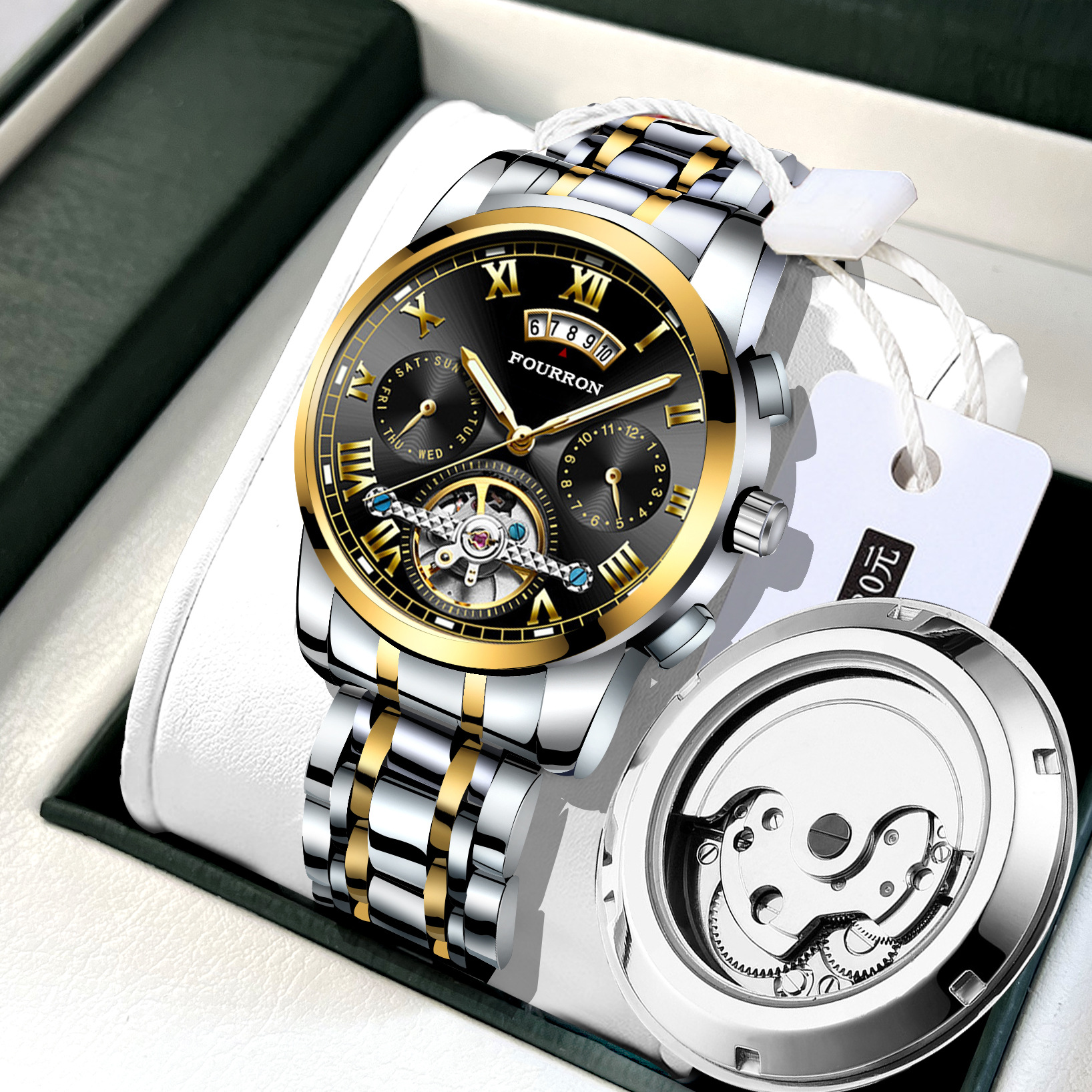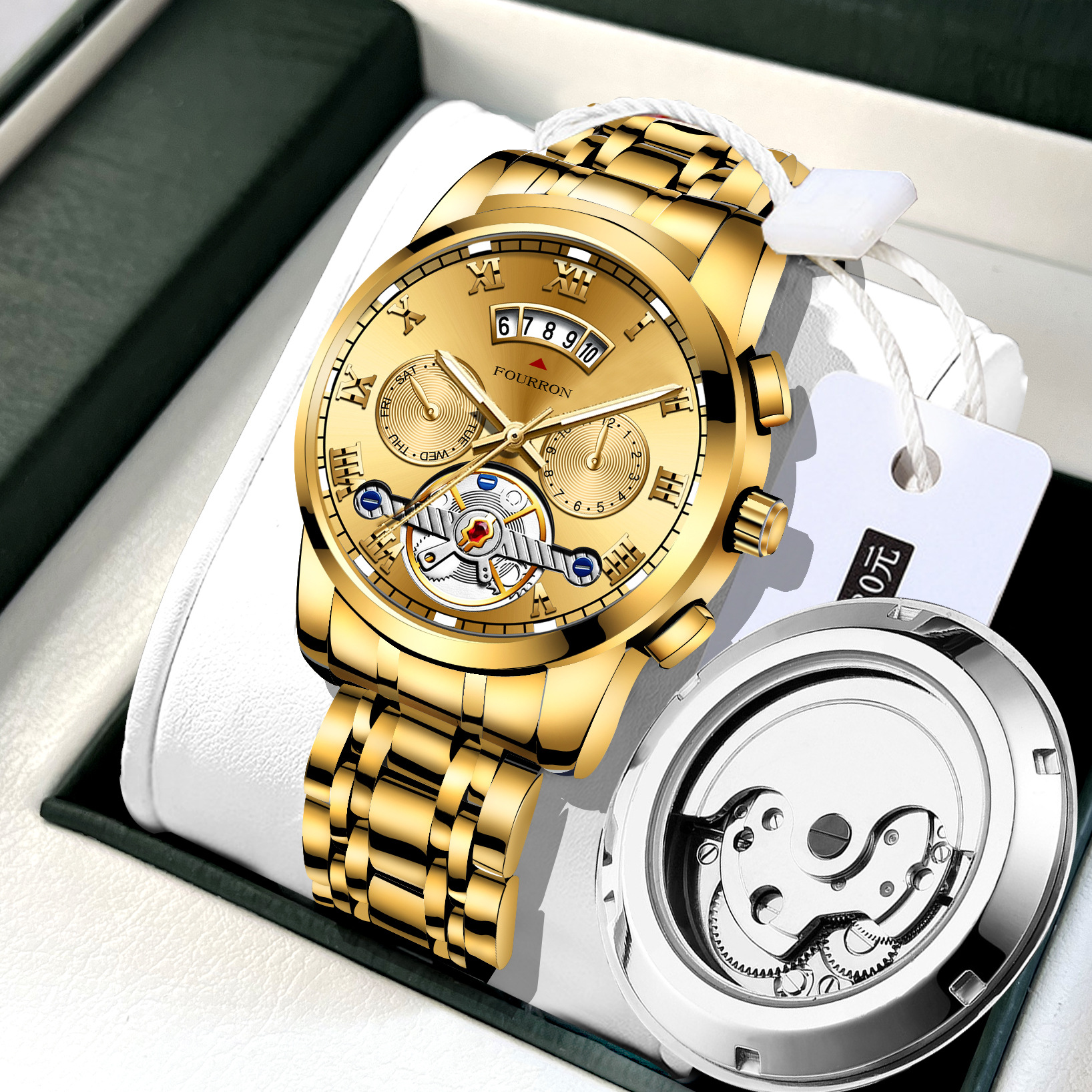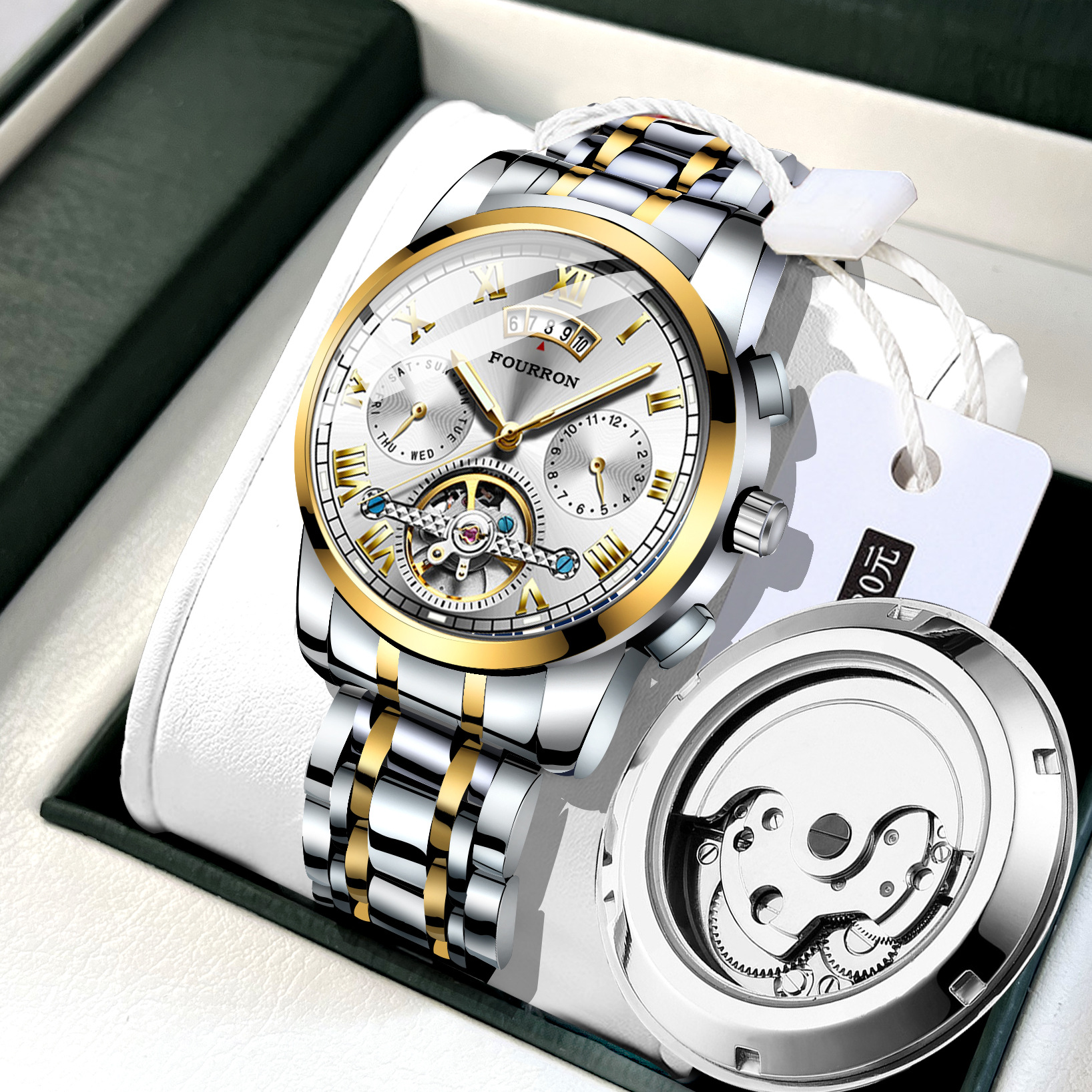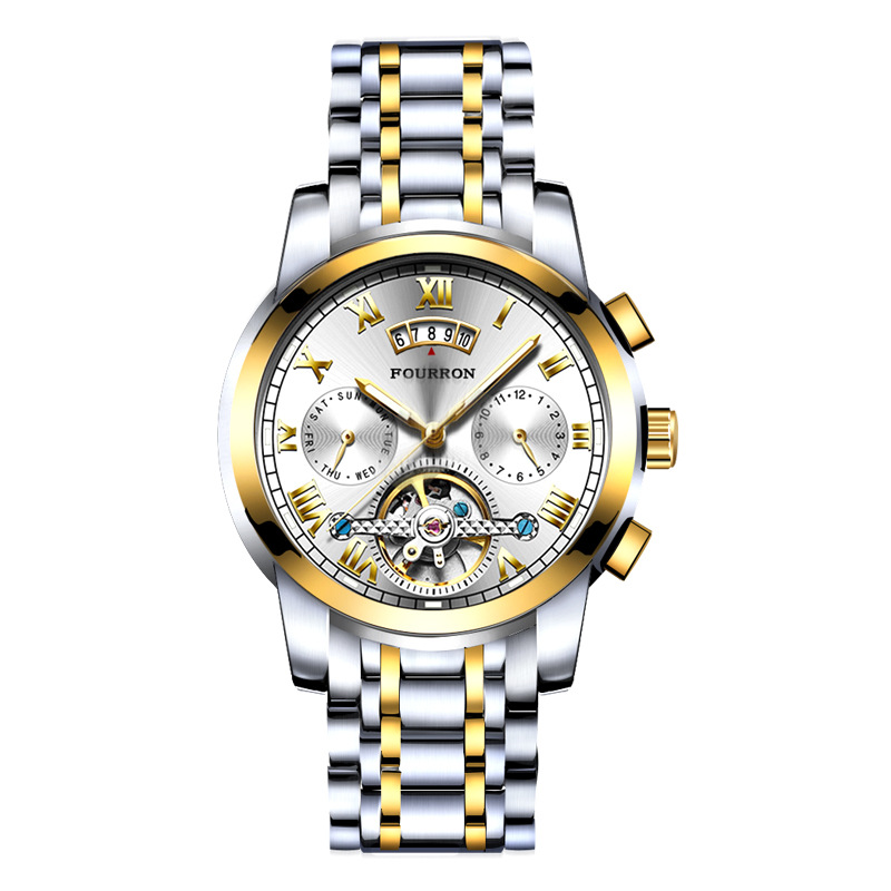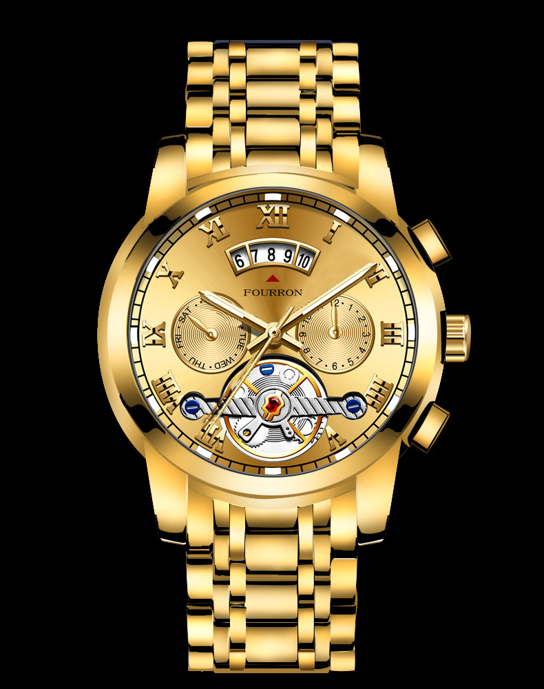 翡浪品牌手表男士仿陀飞轮机械做法背透镂空石英手表装饰六针功能