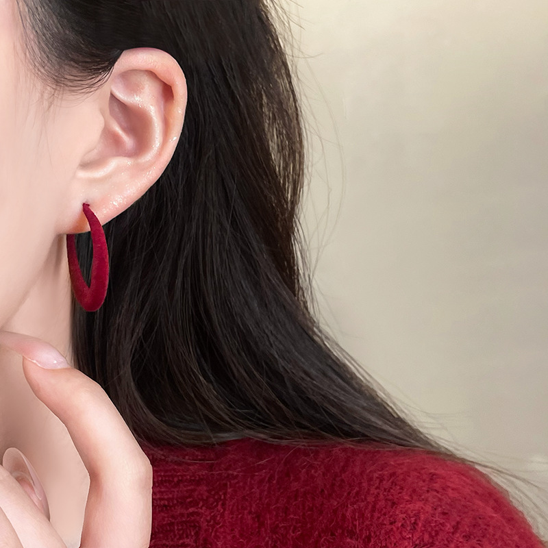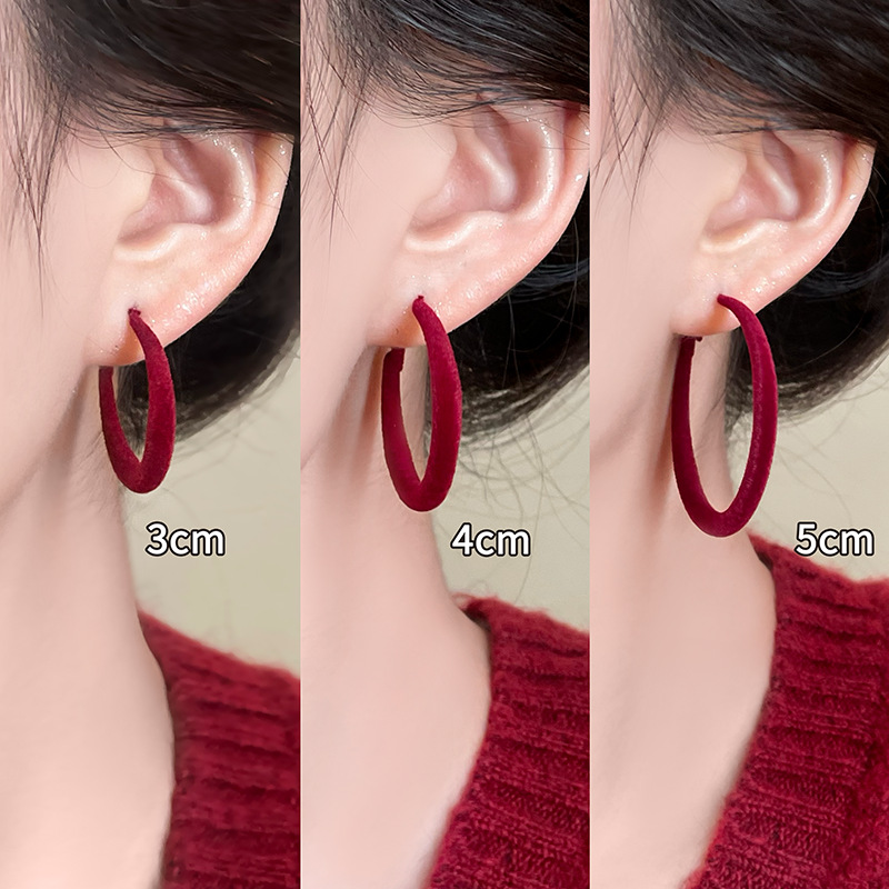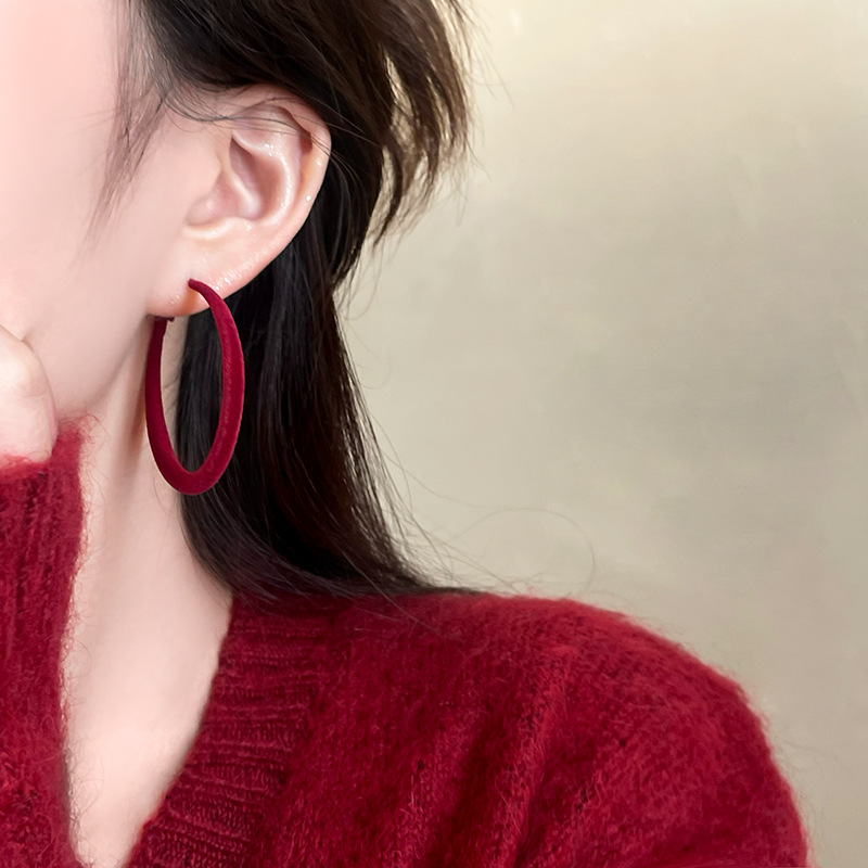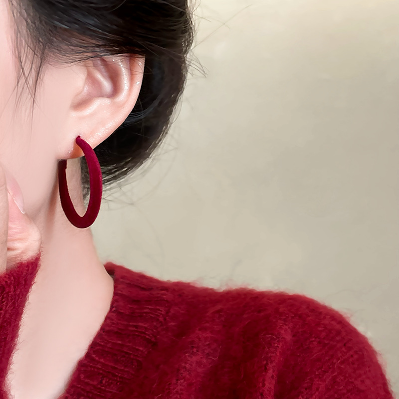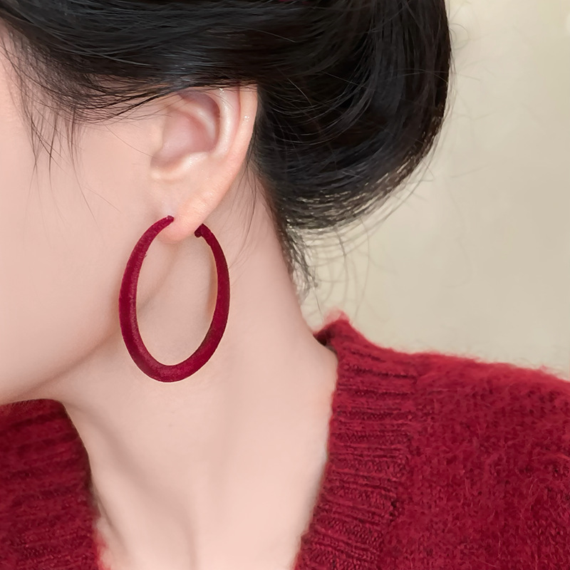 安可拉红植绒大耳圈女秋冬复古高级感方圆脸耳环2024新款素圈耳饰