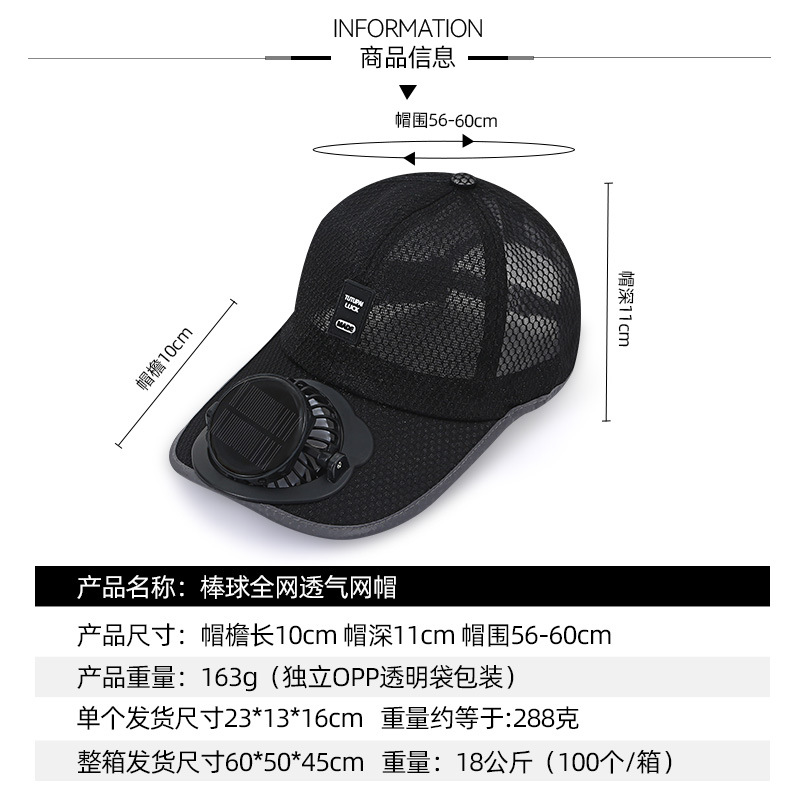 成人夏季太阳能充电带风扇帽子男女士透气网眼防晒户外遮阳鸭舌帽