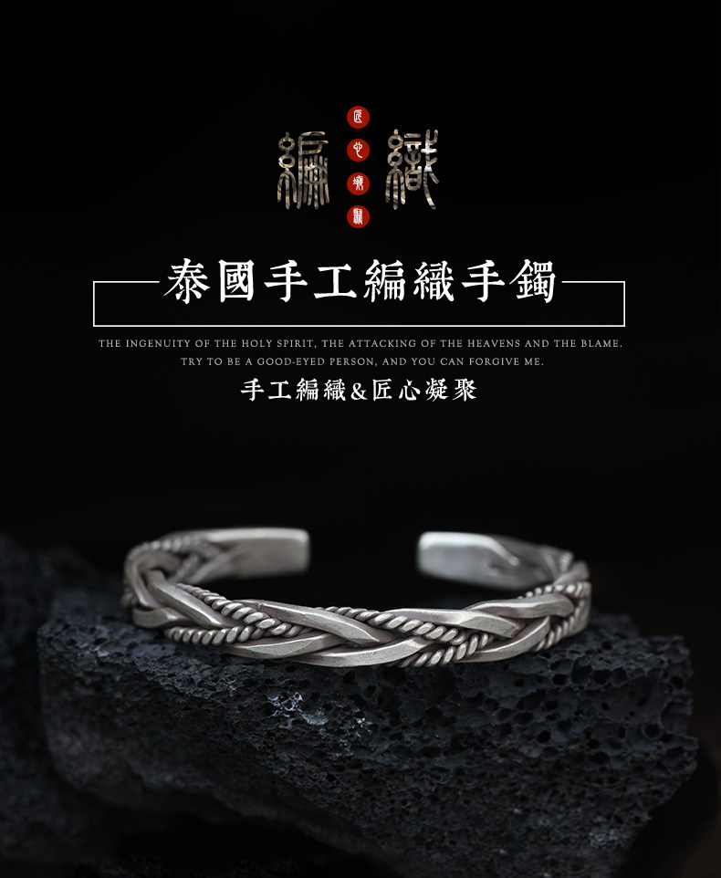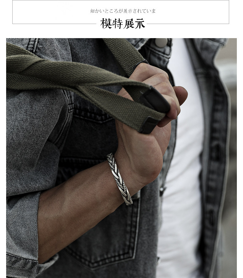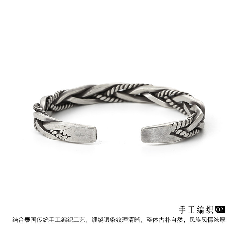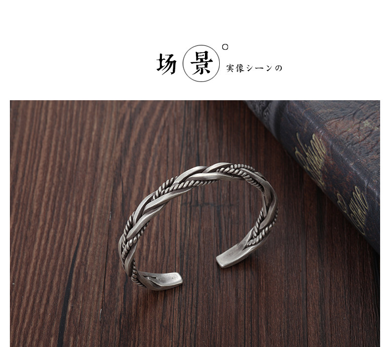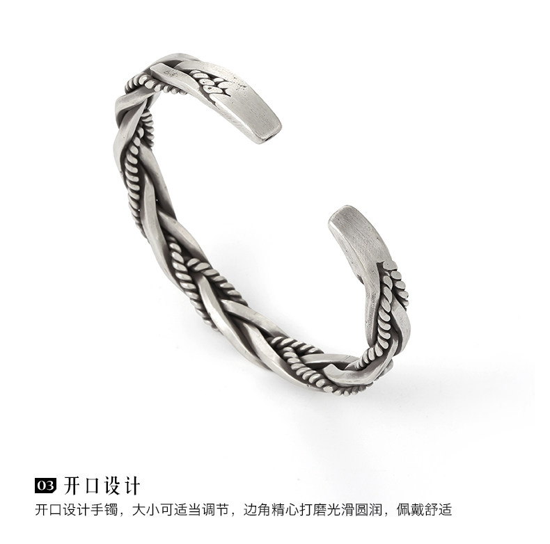 麻花编织S925镀银手镯男女复古个性泰银手环原创小众设计开口手饰