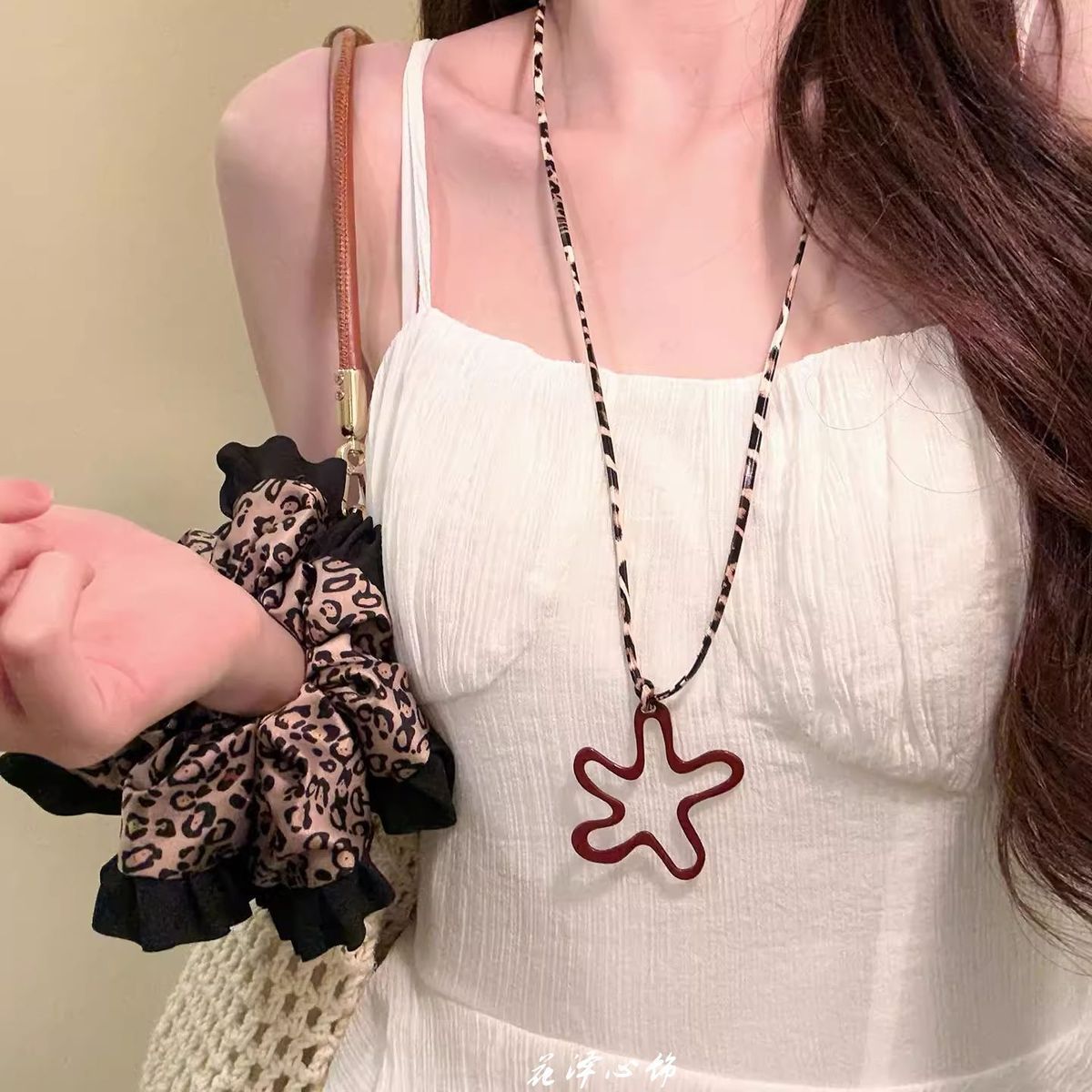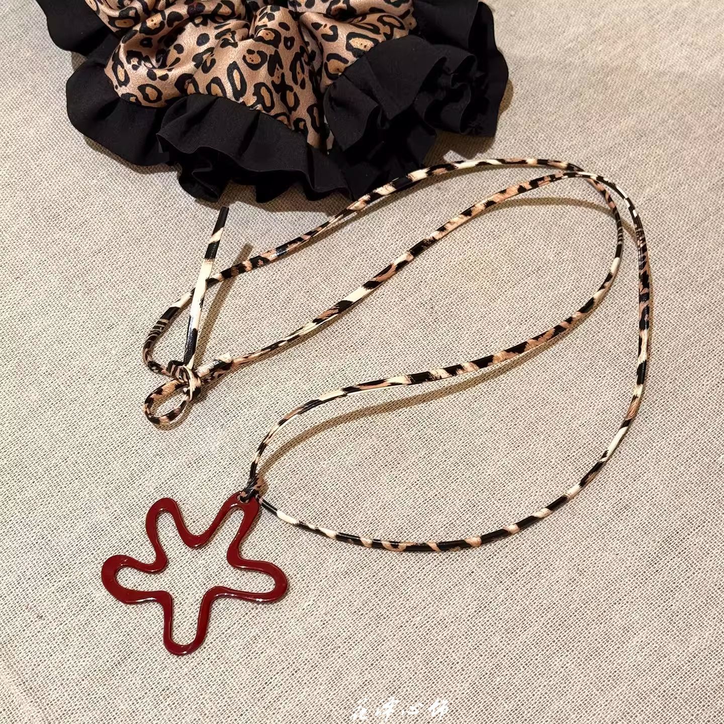 寇香摩卡~镂空酒红色花朵吊坠豹纹皮绳长款项链女款卫衣链配饰