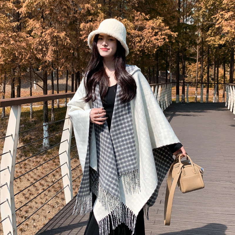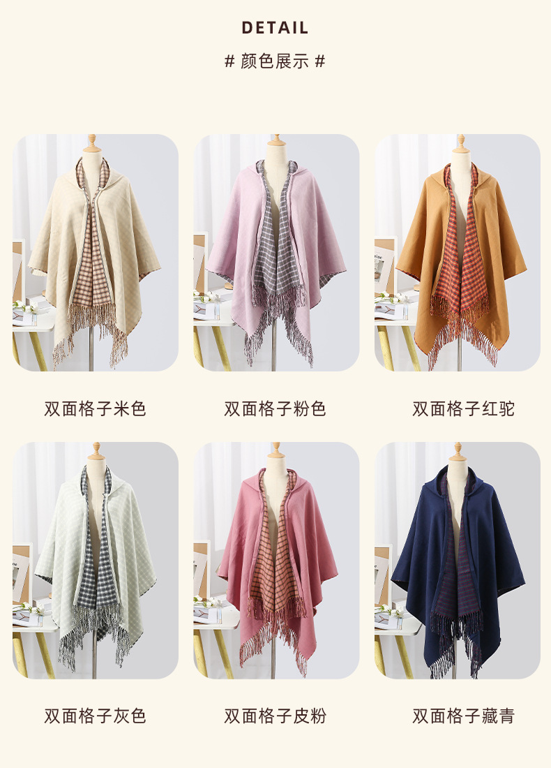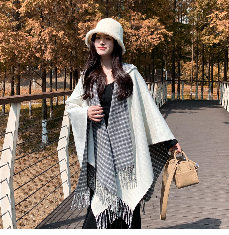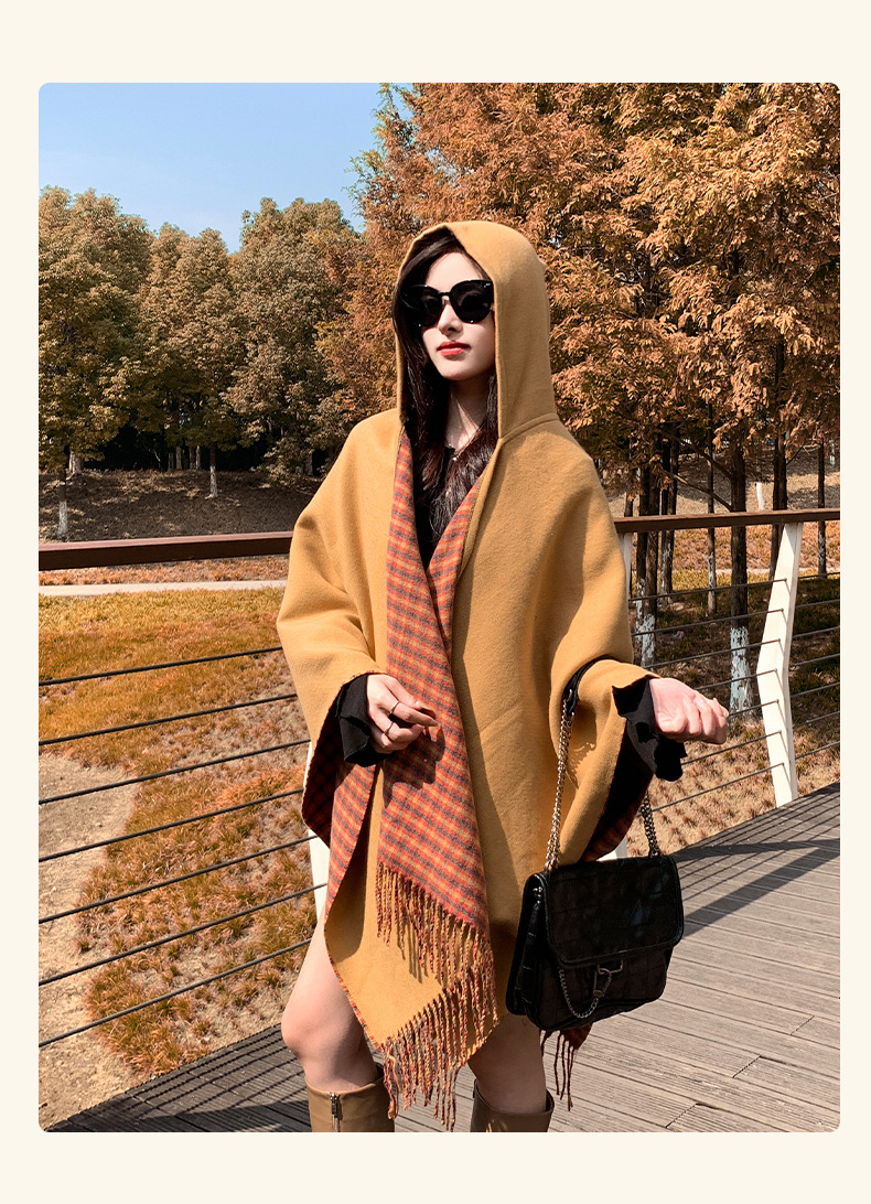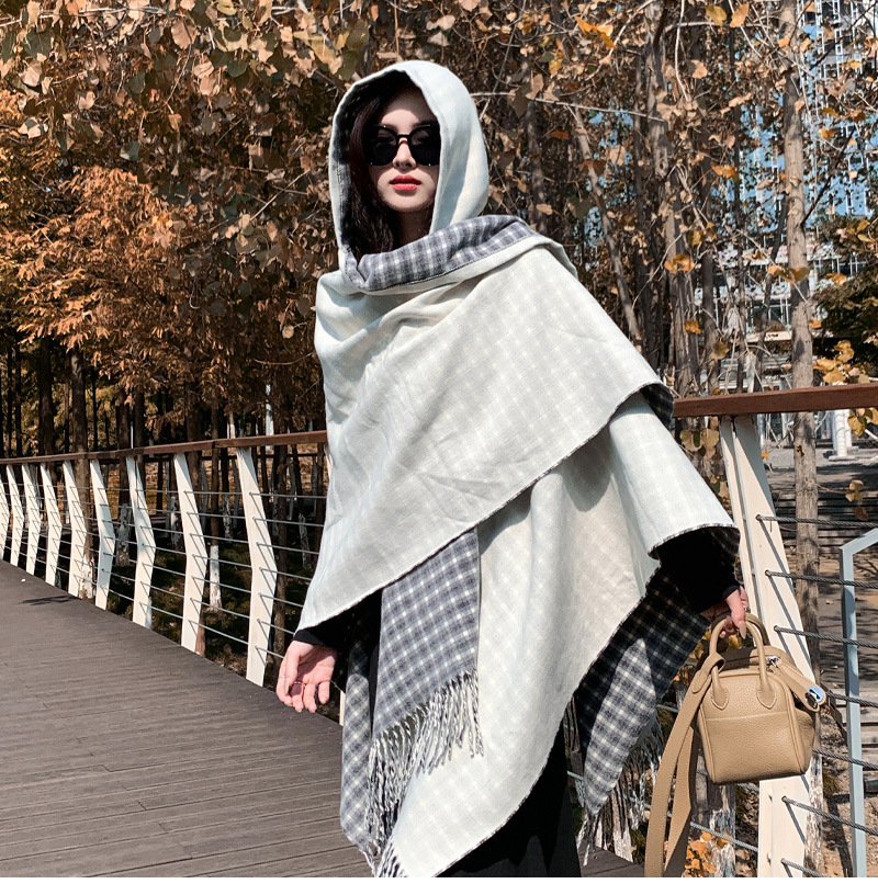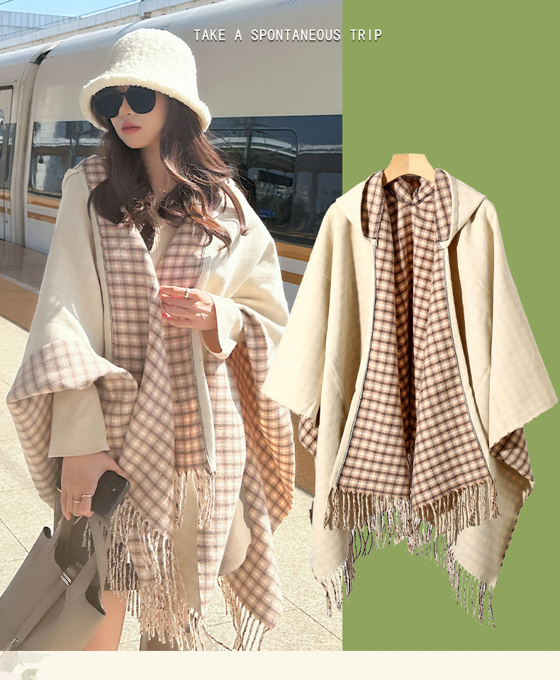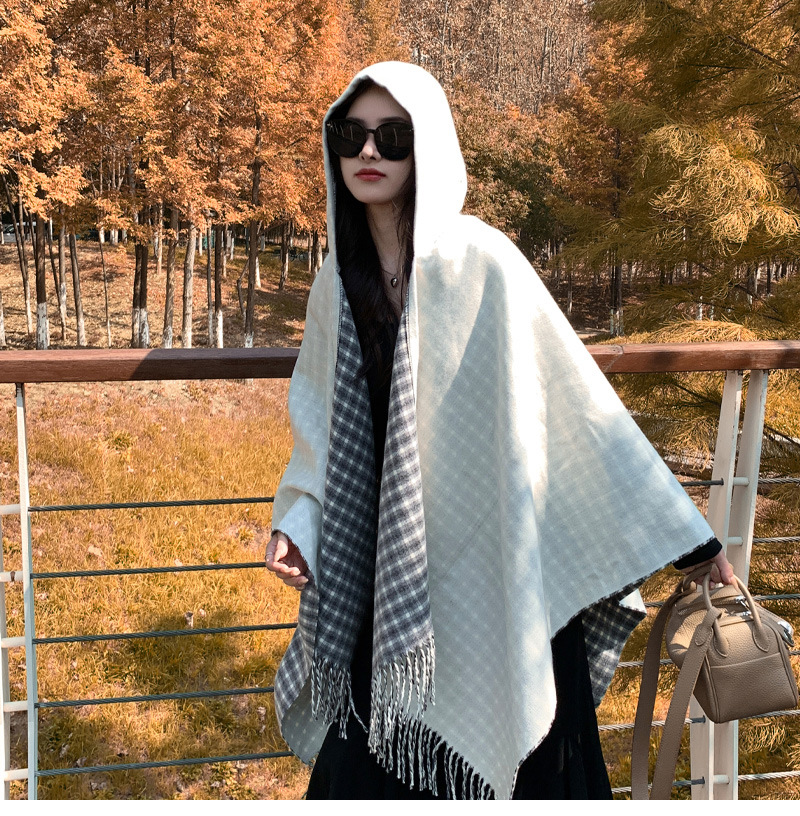 民族风气质格子斗篷外搭旅游拍照保暖春夏连帽子围巾披肩加厚外套