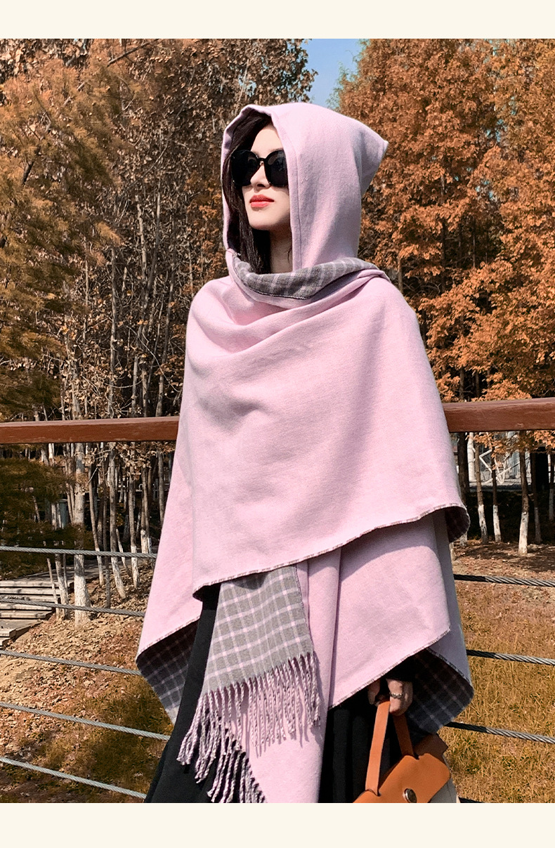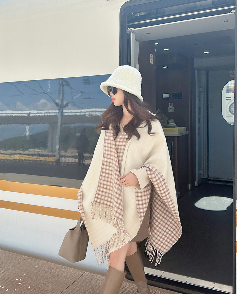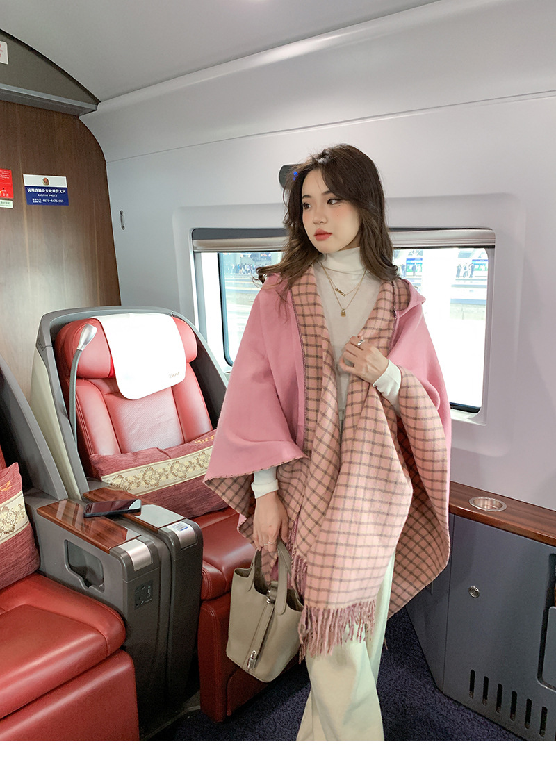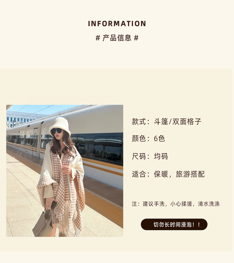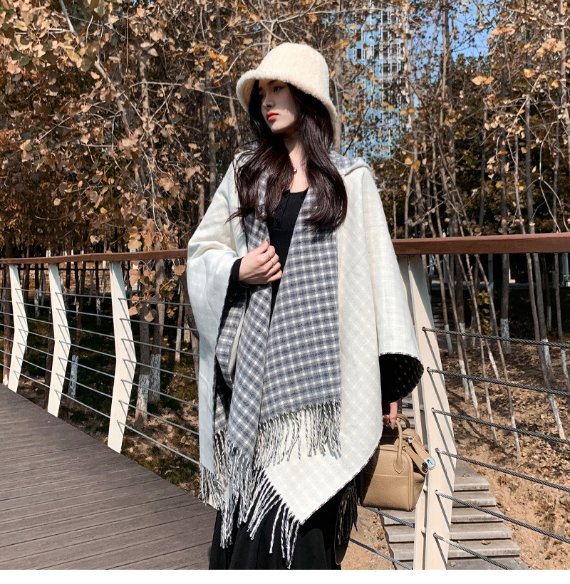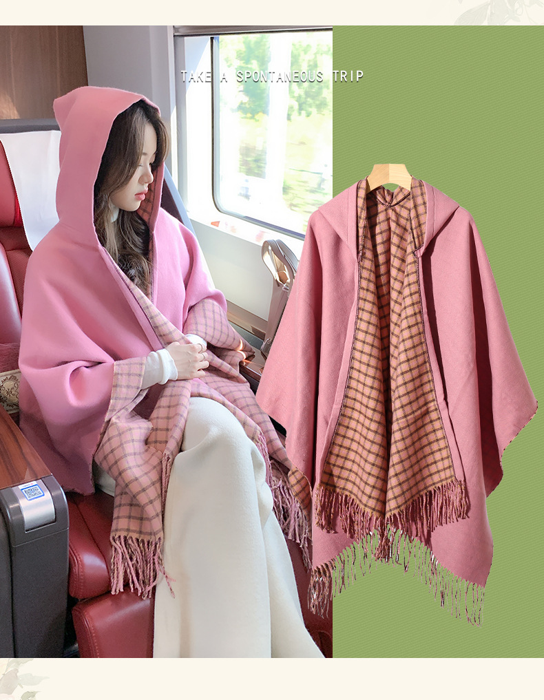 民族风气质格子斗篷外搭旅游拍照保暖春夏连帽子围巾披肩加厚外套