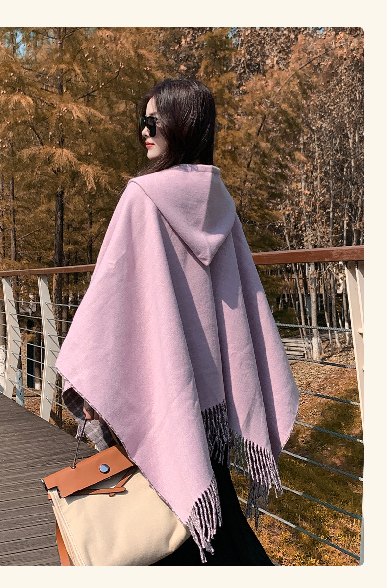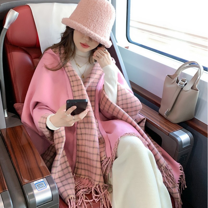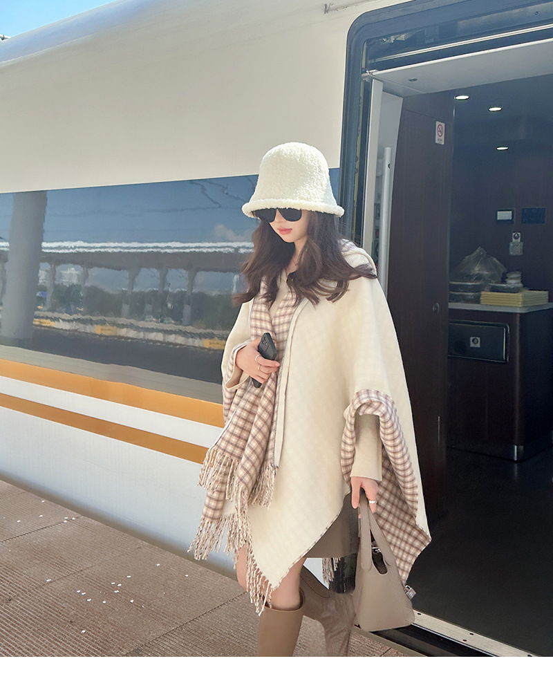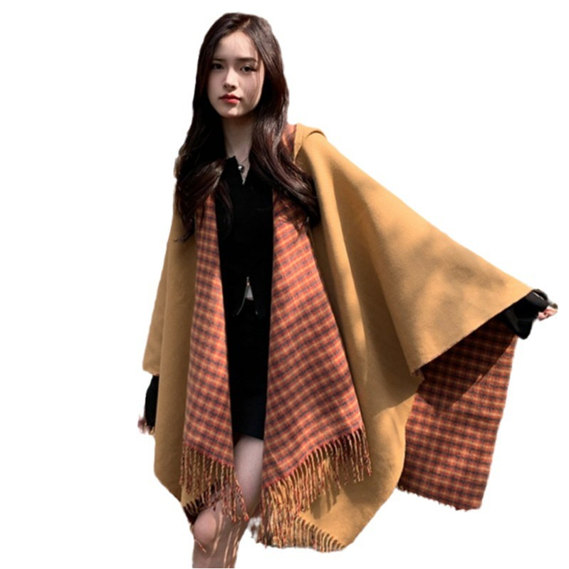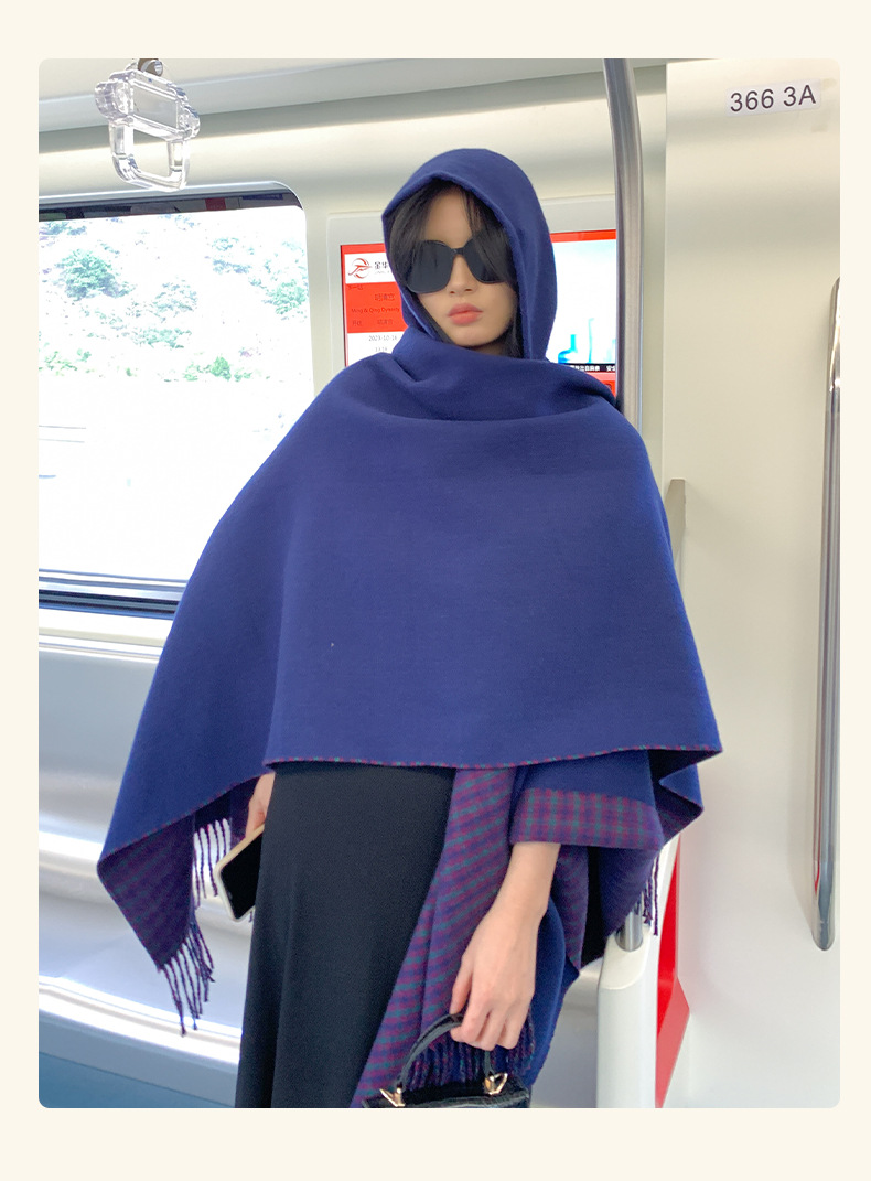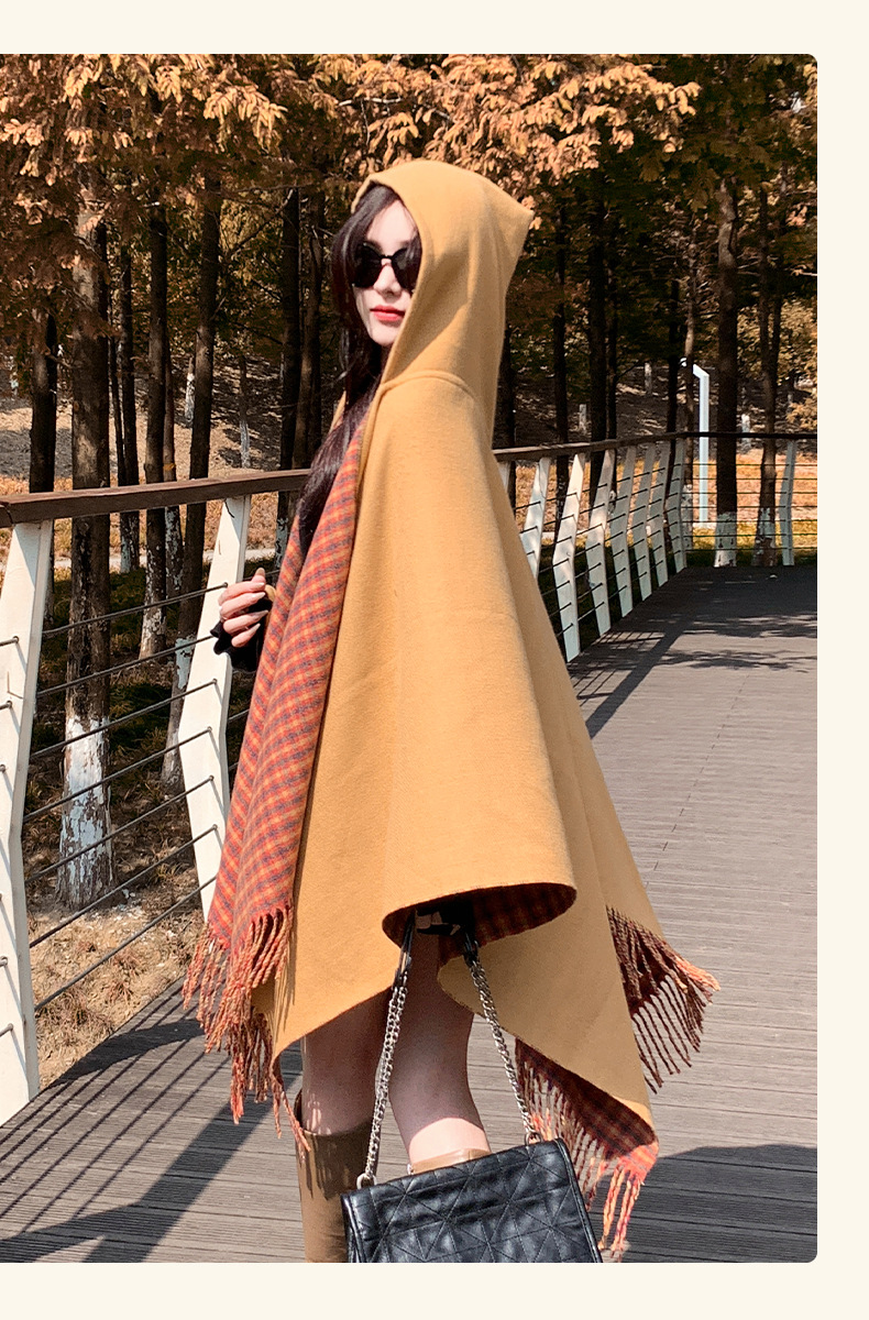 民族风气质格子斗篷外搭旅游拍照保暖春夏连帽子围巾披肩加厚外套