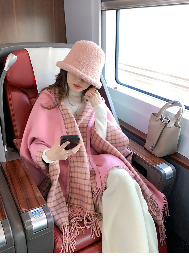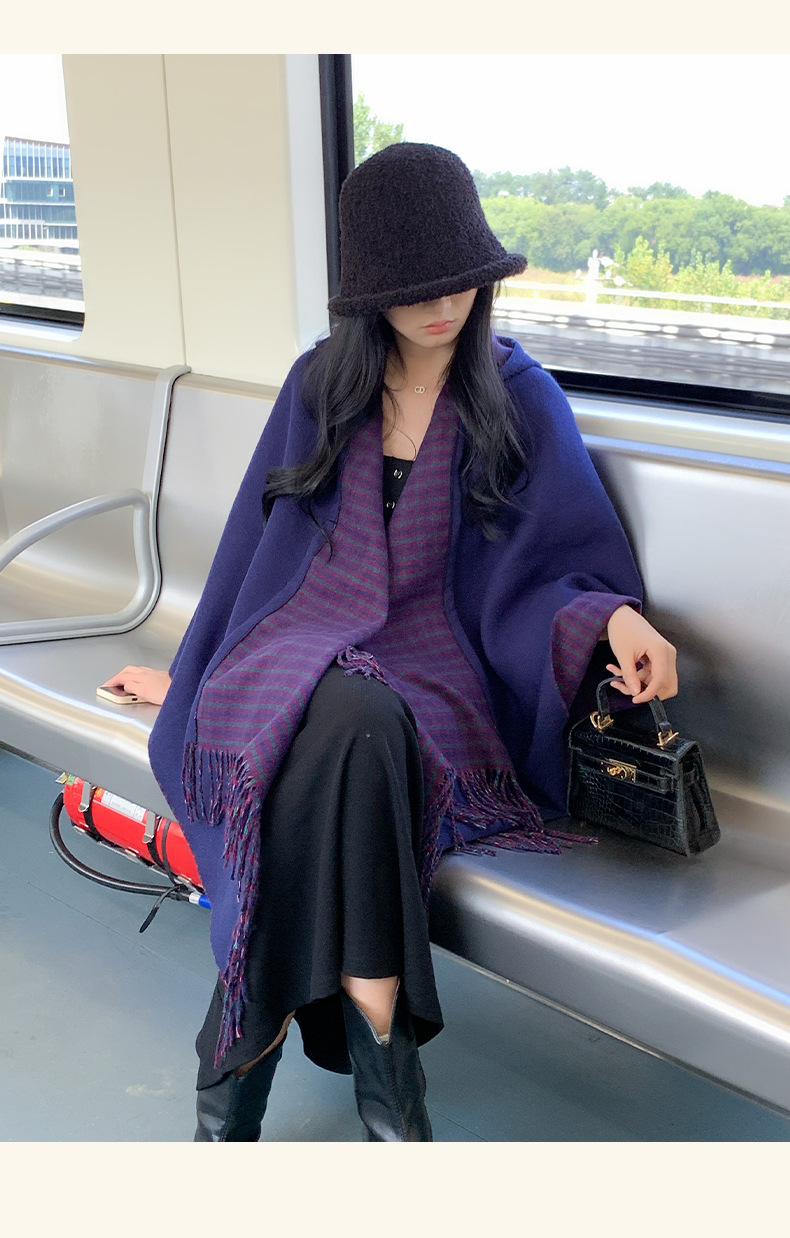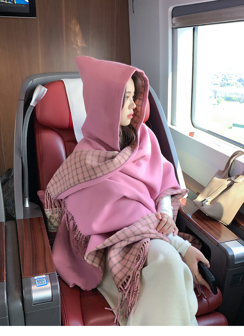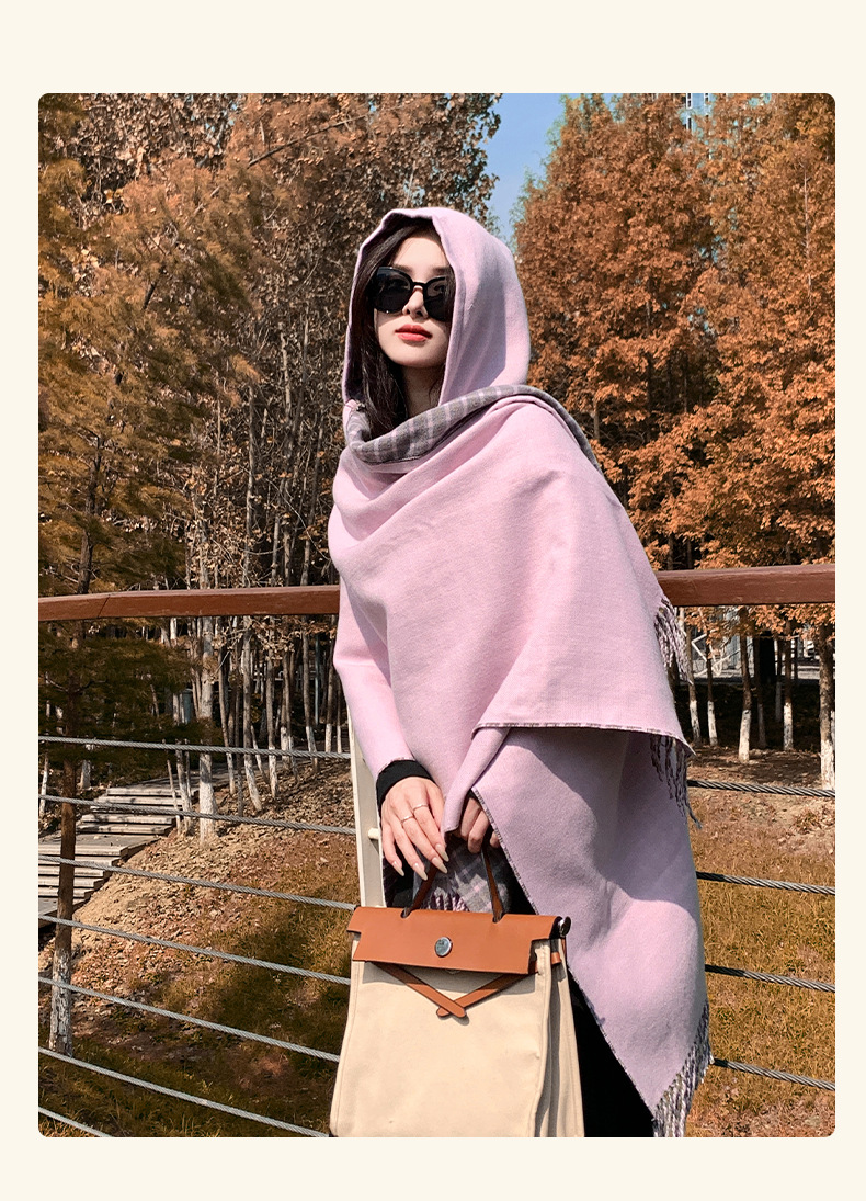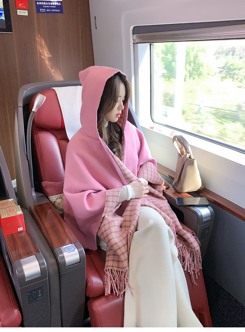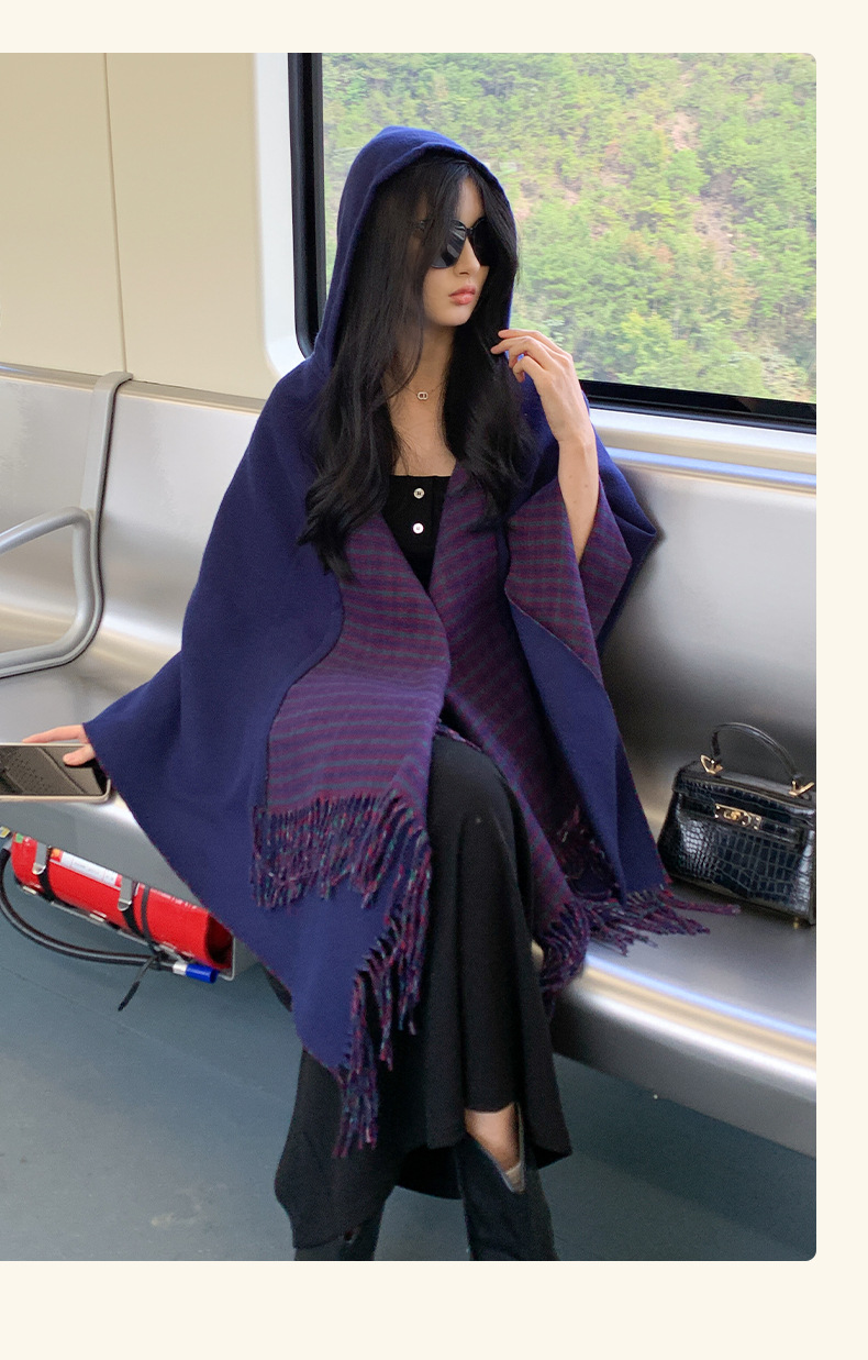 民族风气质格子斗篷外搭旅游拍照保暖春夏连帽子围巾披肩加厚外套
