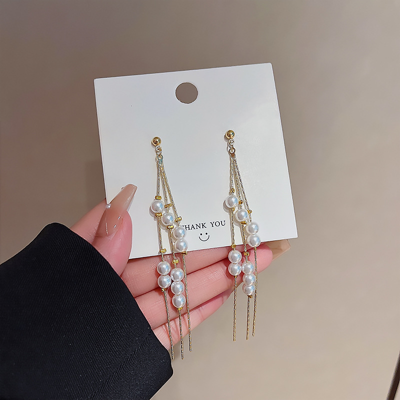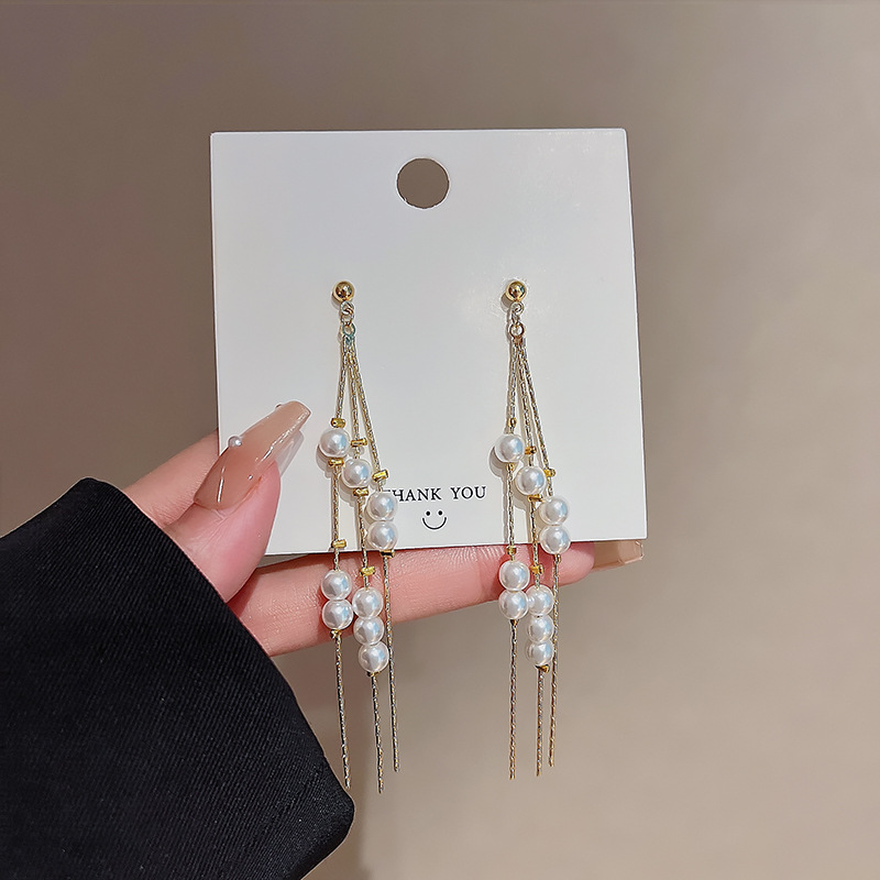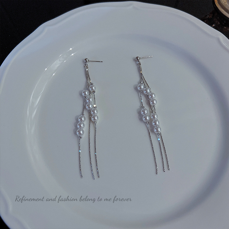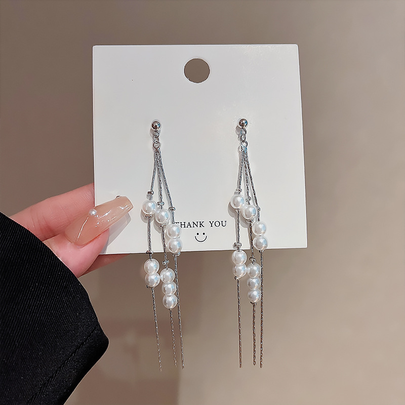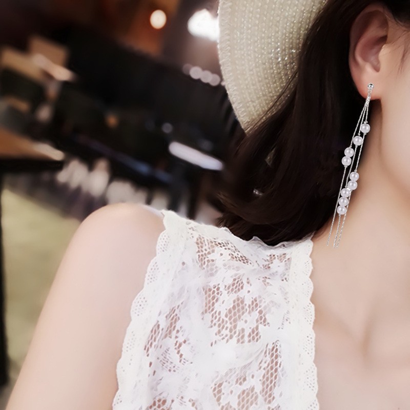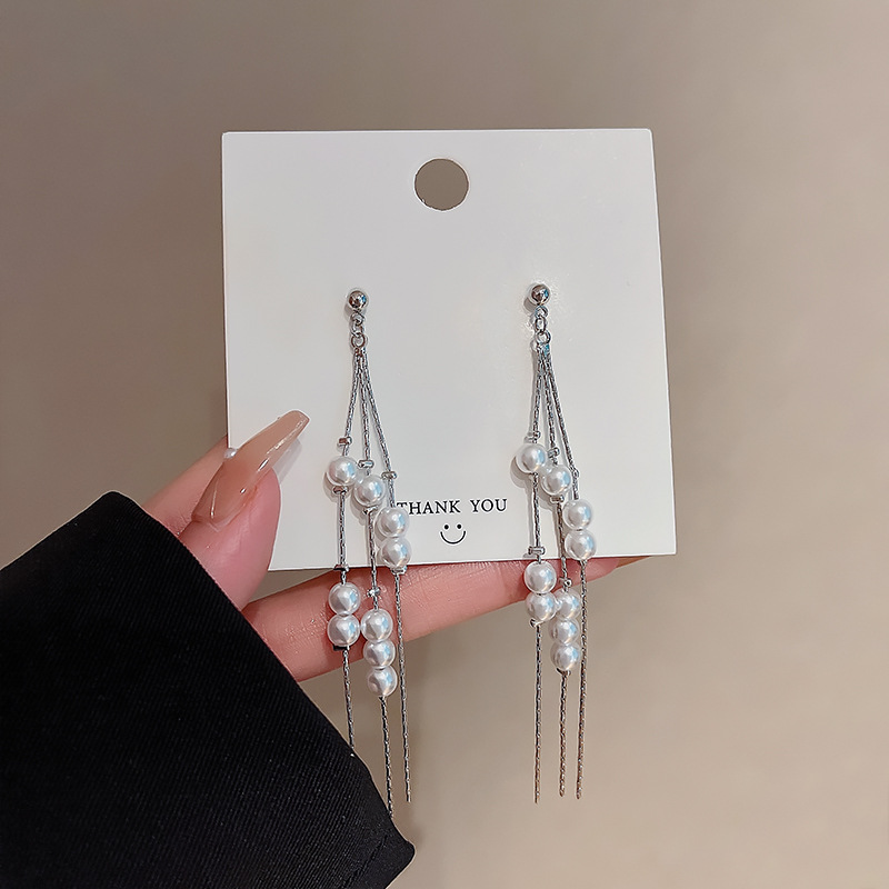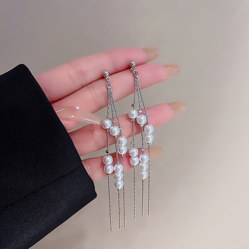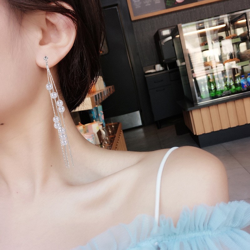 925银针链条珍珠流苏耳环女欧美个性长款耳坠网红时尚气质耳饰品