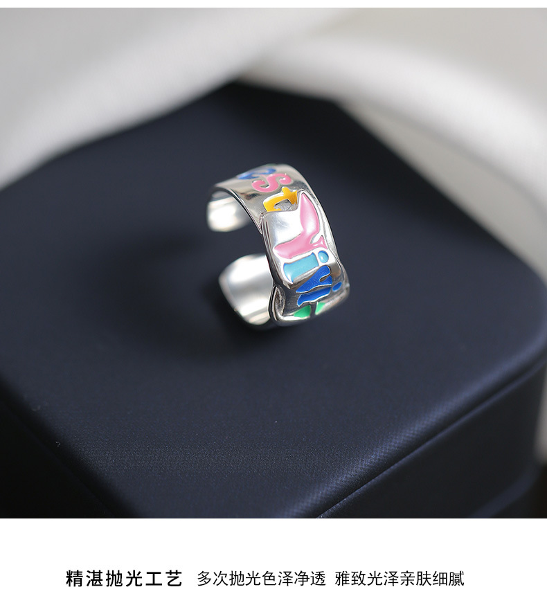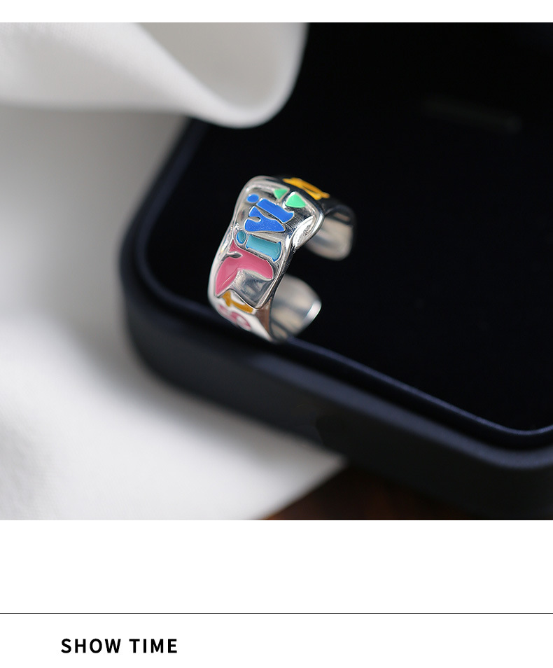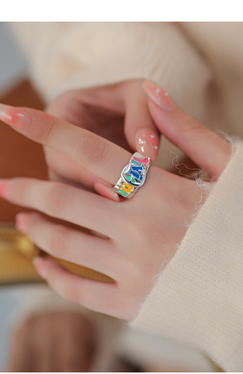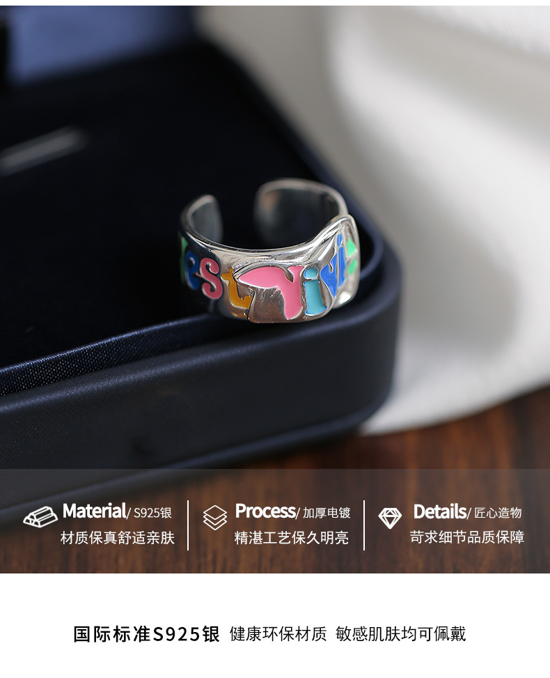 S925纯银珐琅涂鸦彩色英文字母戒指女韩版小众设计个性皮带扣指环