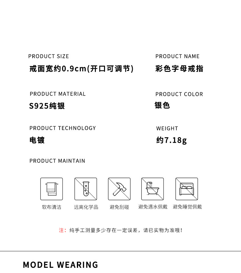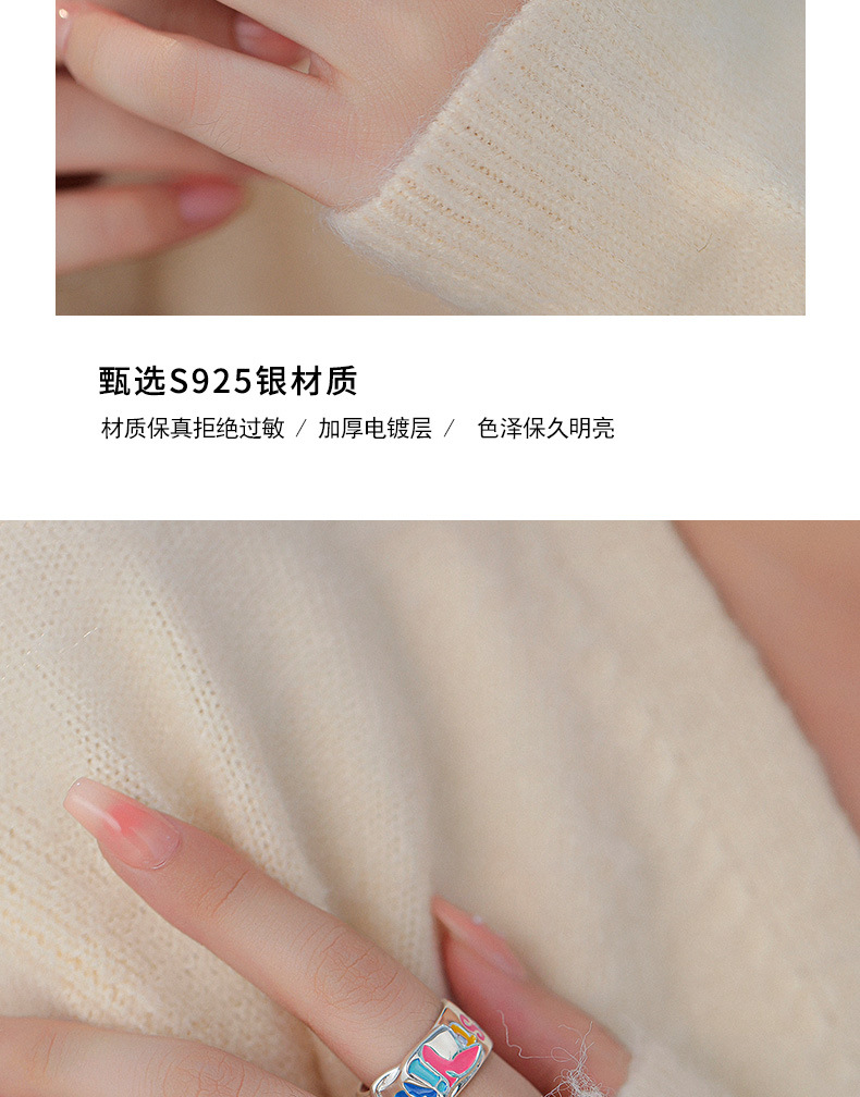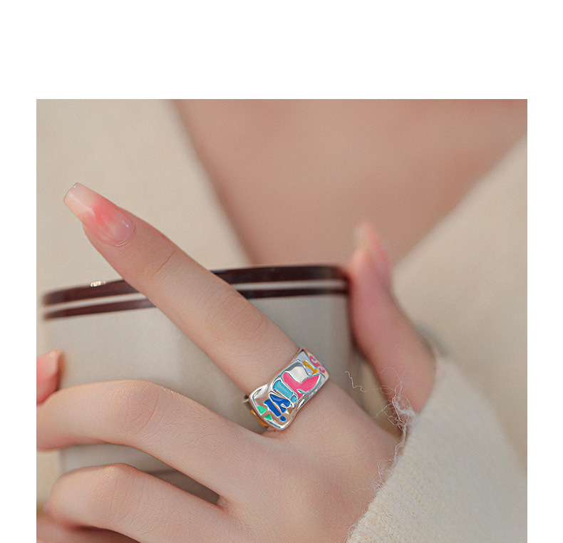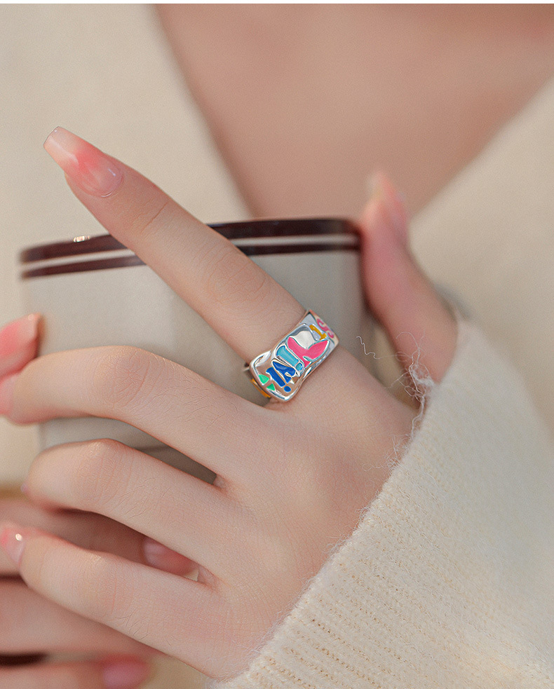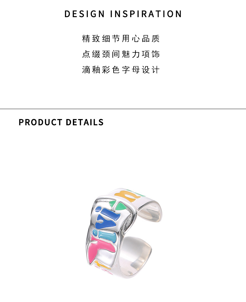 S925纯银珐琅涂鸦彩色英文字母戒指女韩版小众设计个性皮带扣指环