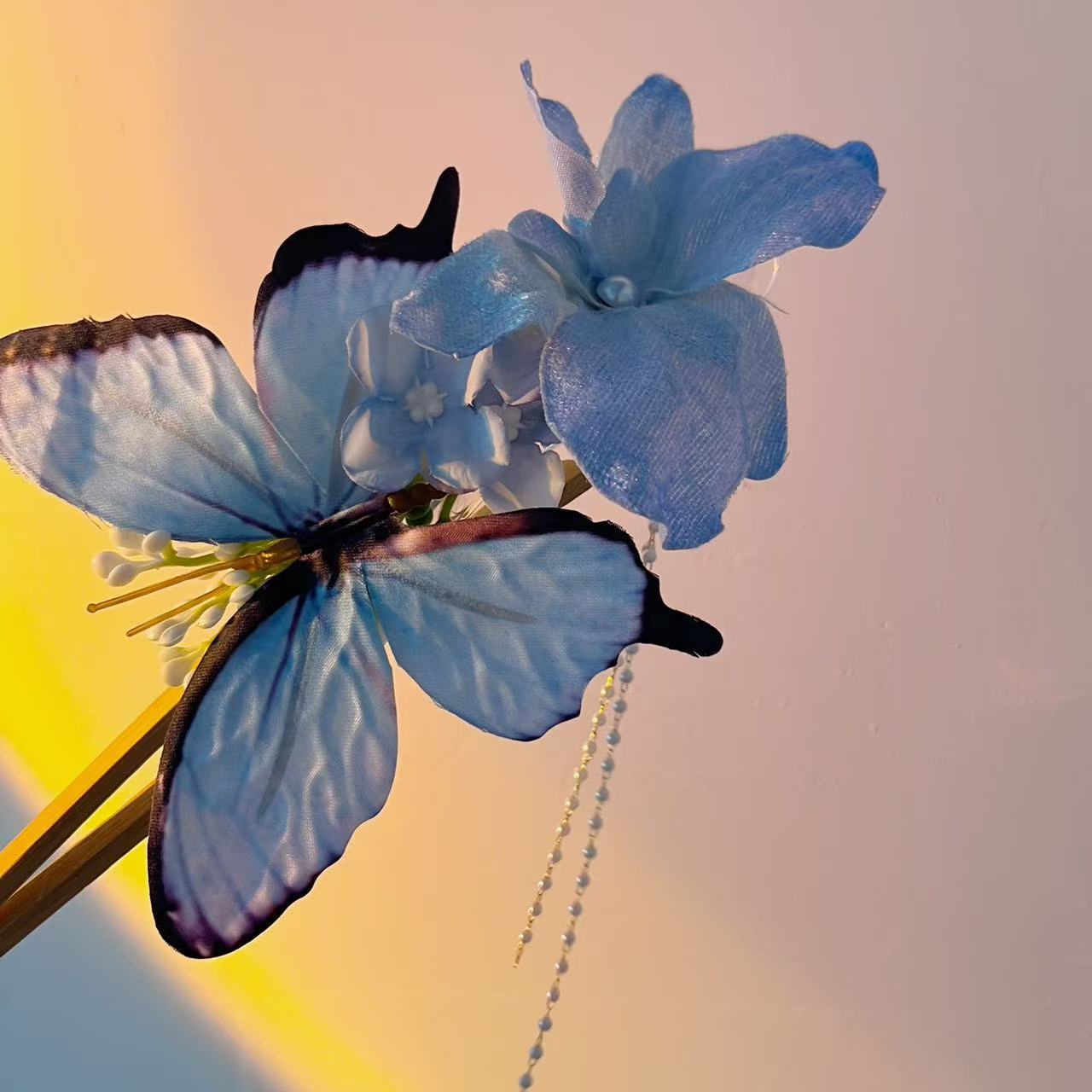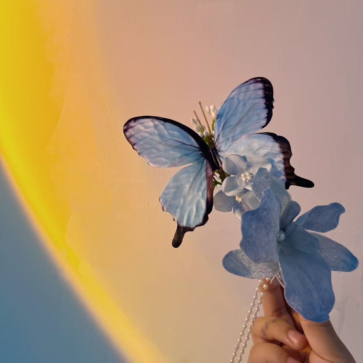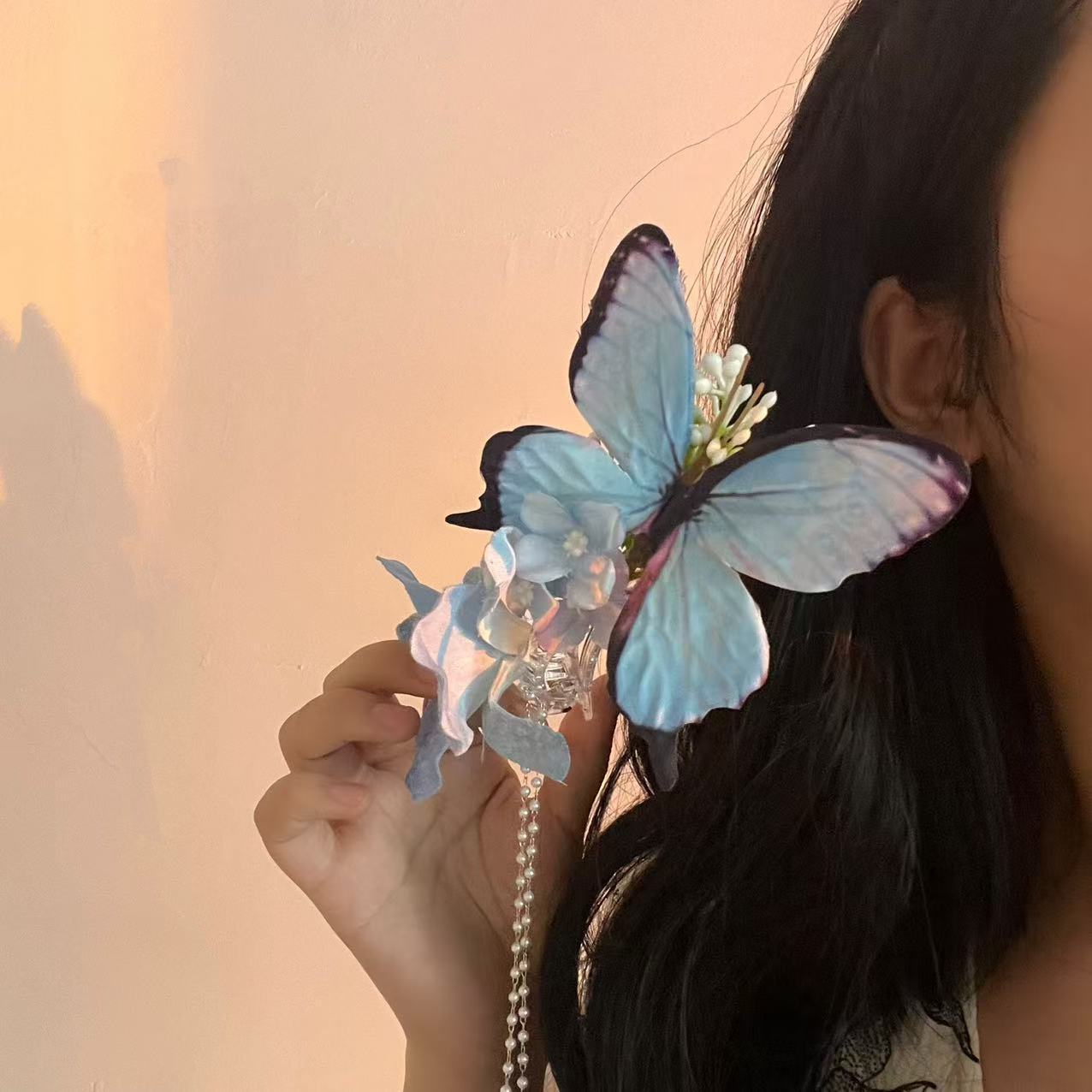 2025年新款春日仙女 春夏小清新超仙蓝色蝶恋花流苏鸭嘴夹发夹