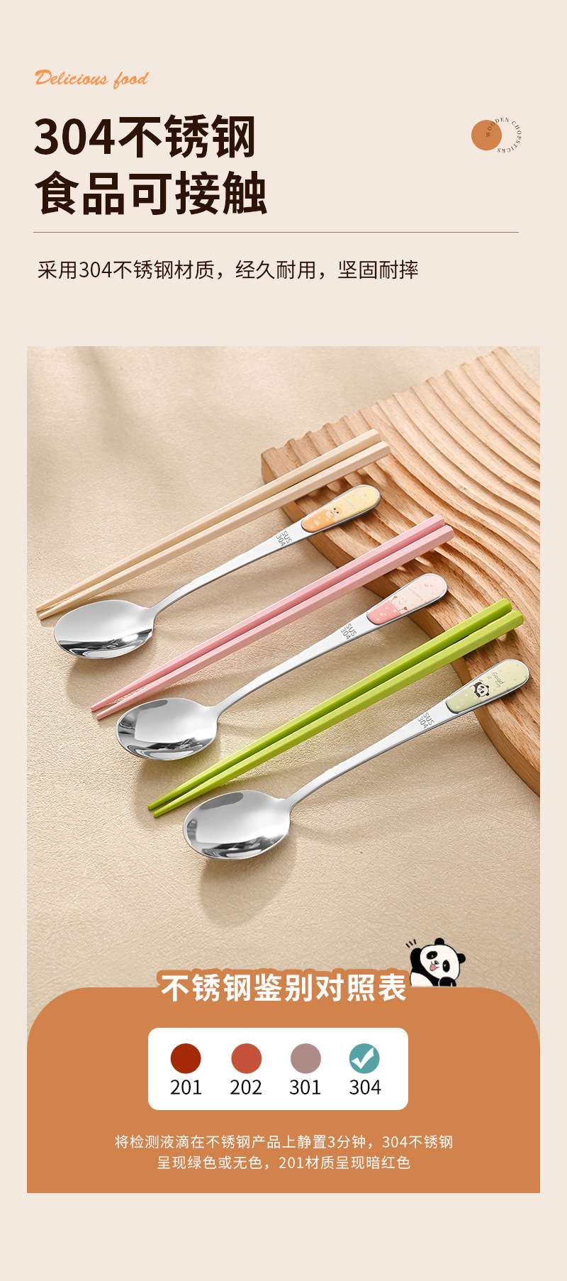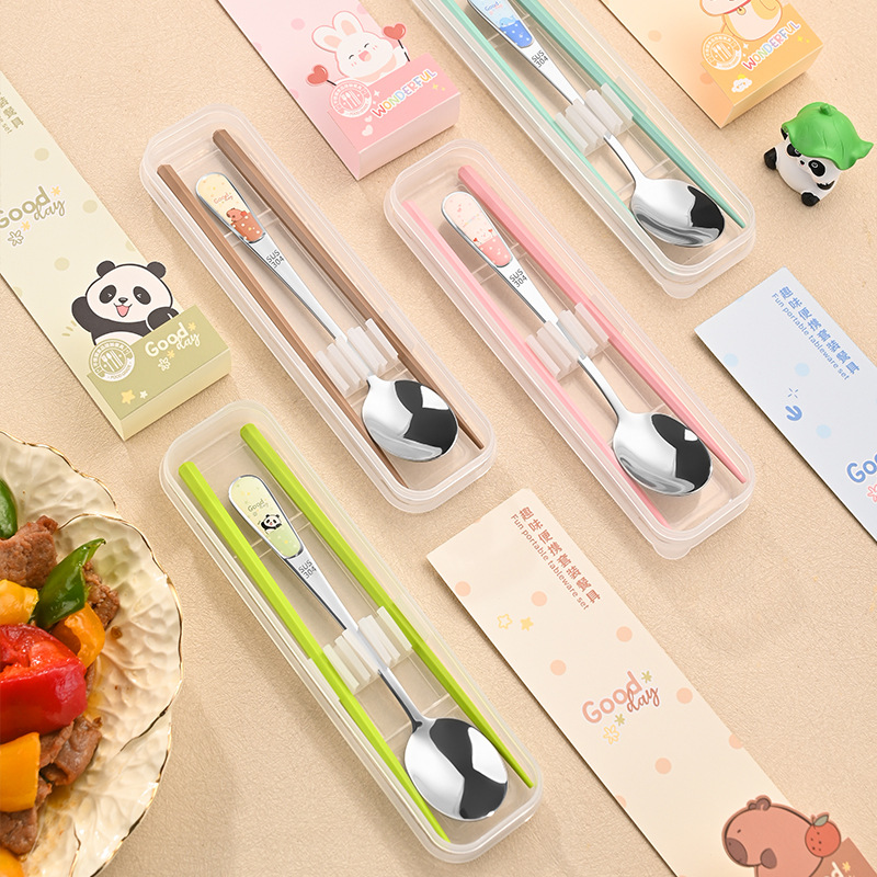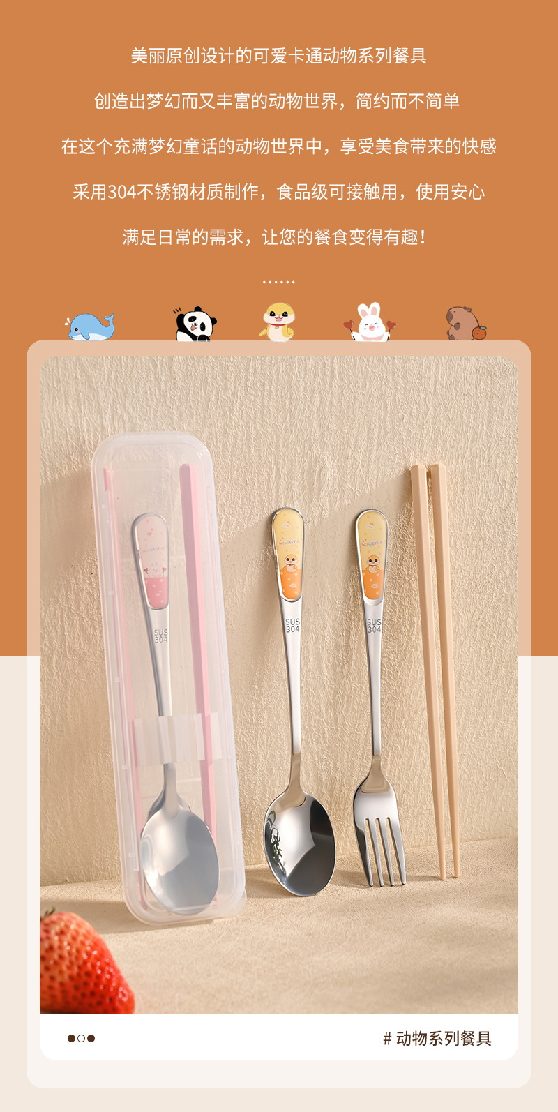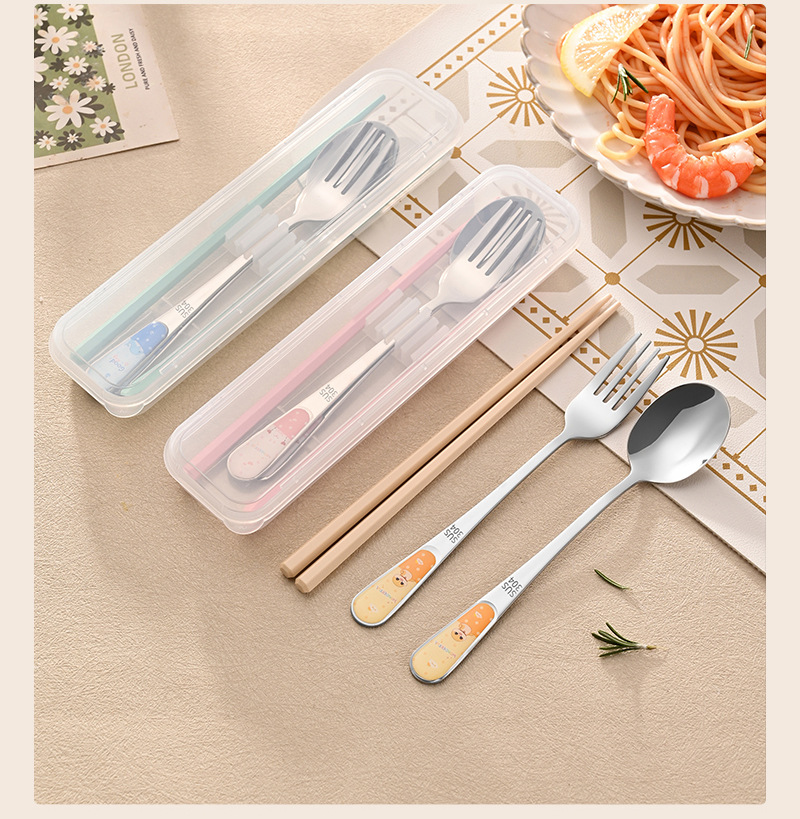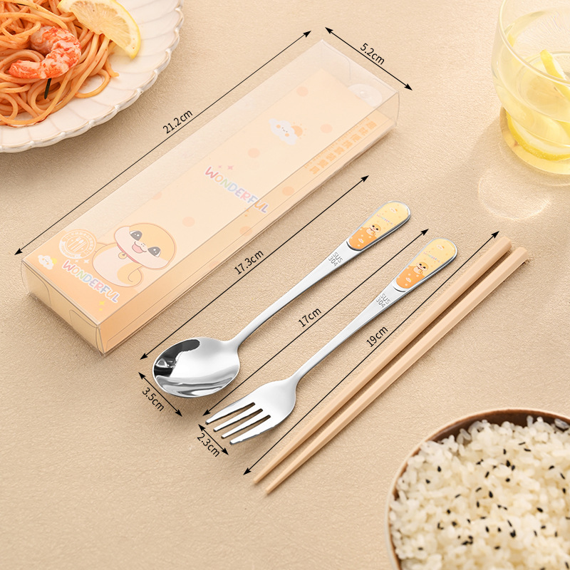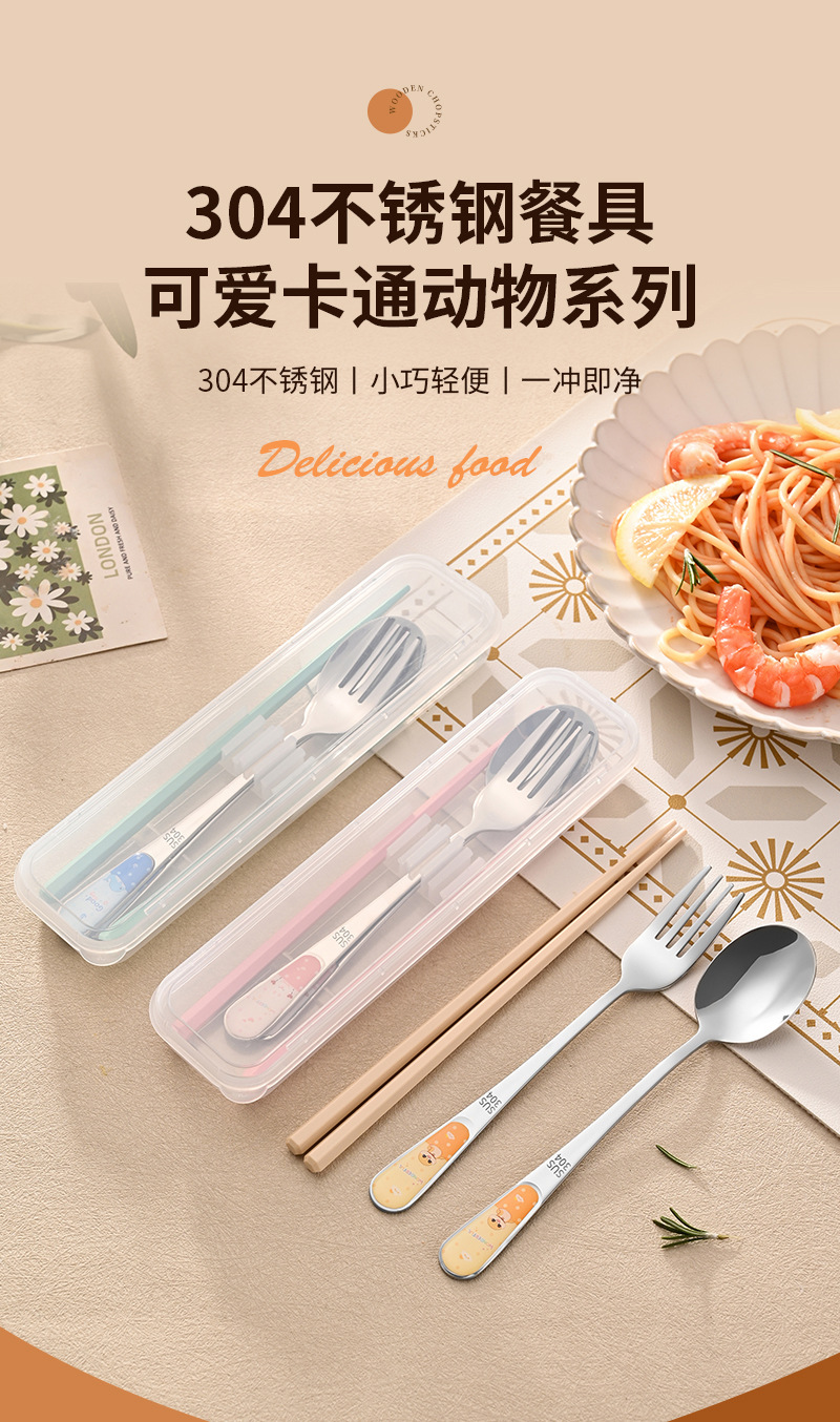厂家批发304不锈钢便携式餐具儿童学生勺子叉子筷子勺筷套装卡通