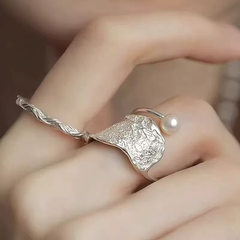 甜酷肌理仿珍珠戒指女个性百搭优雅S925镀银开口指环网红食指戒潮