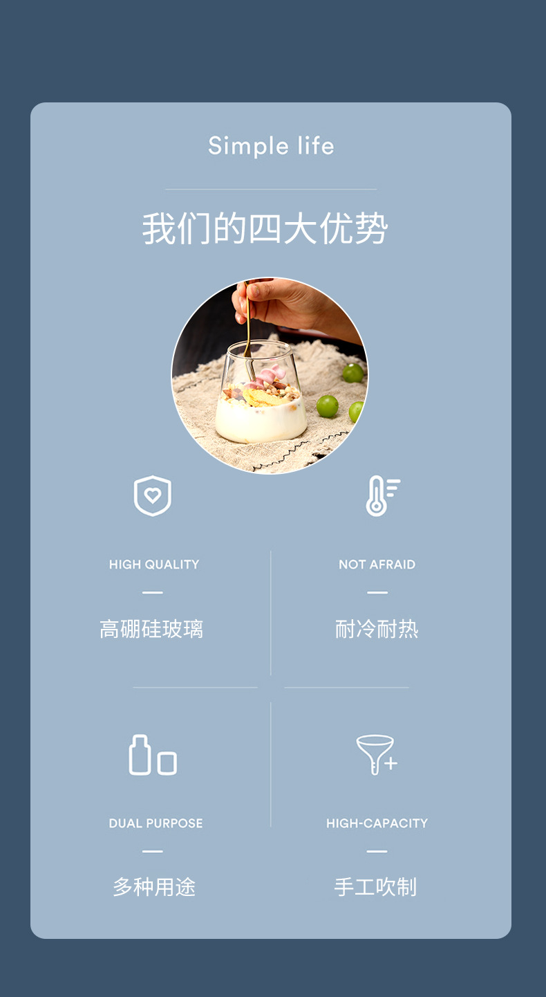 所有产品均采用食品级高硼硅耐热玻璃制造,质量通过美国FDA,欧盟LFGB等认证。来样来图定制、贴牌推广、品牌策划、一站式出口等服务。