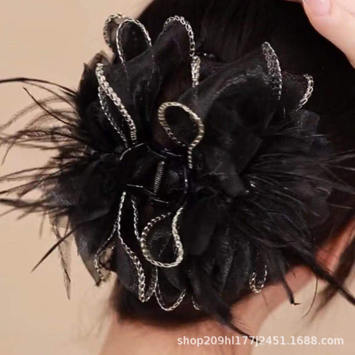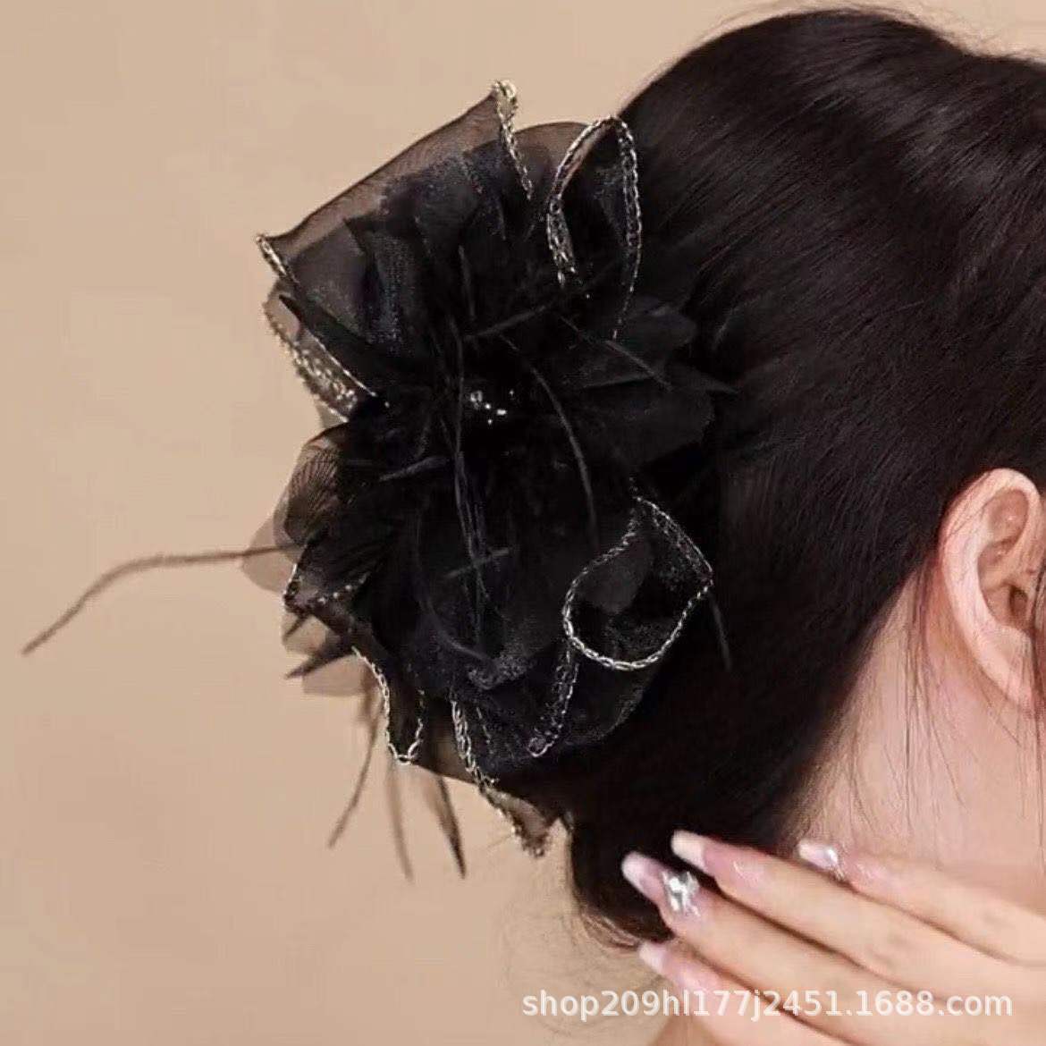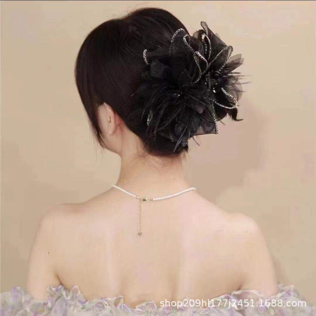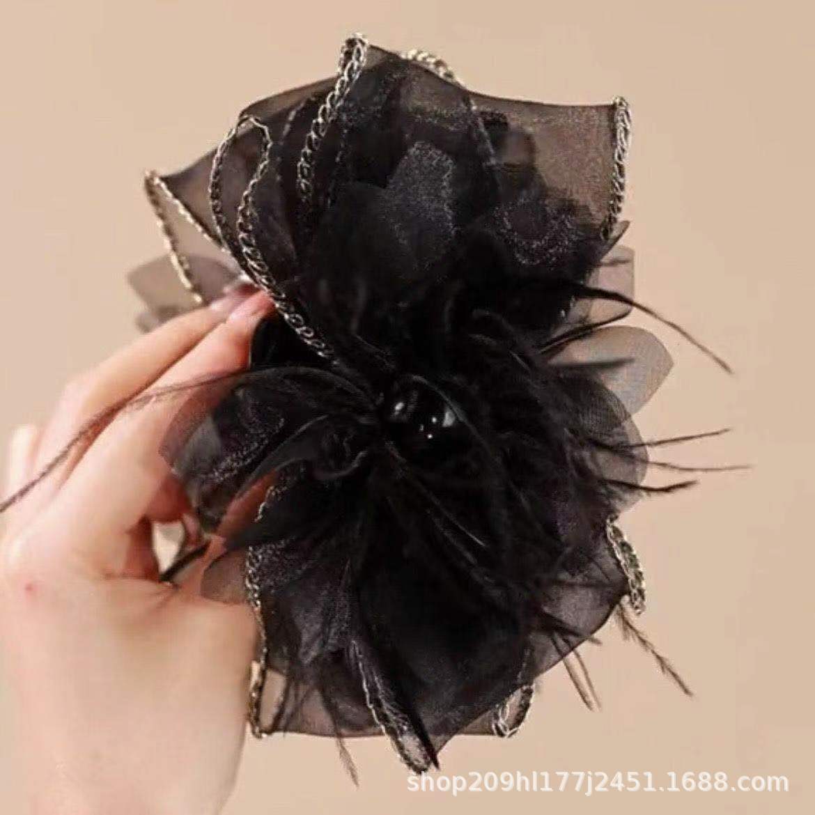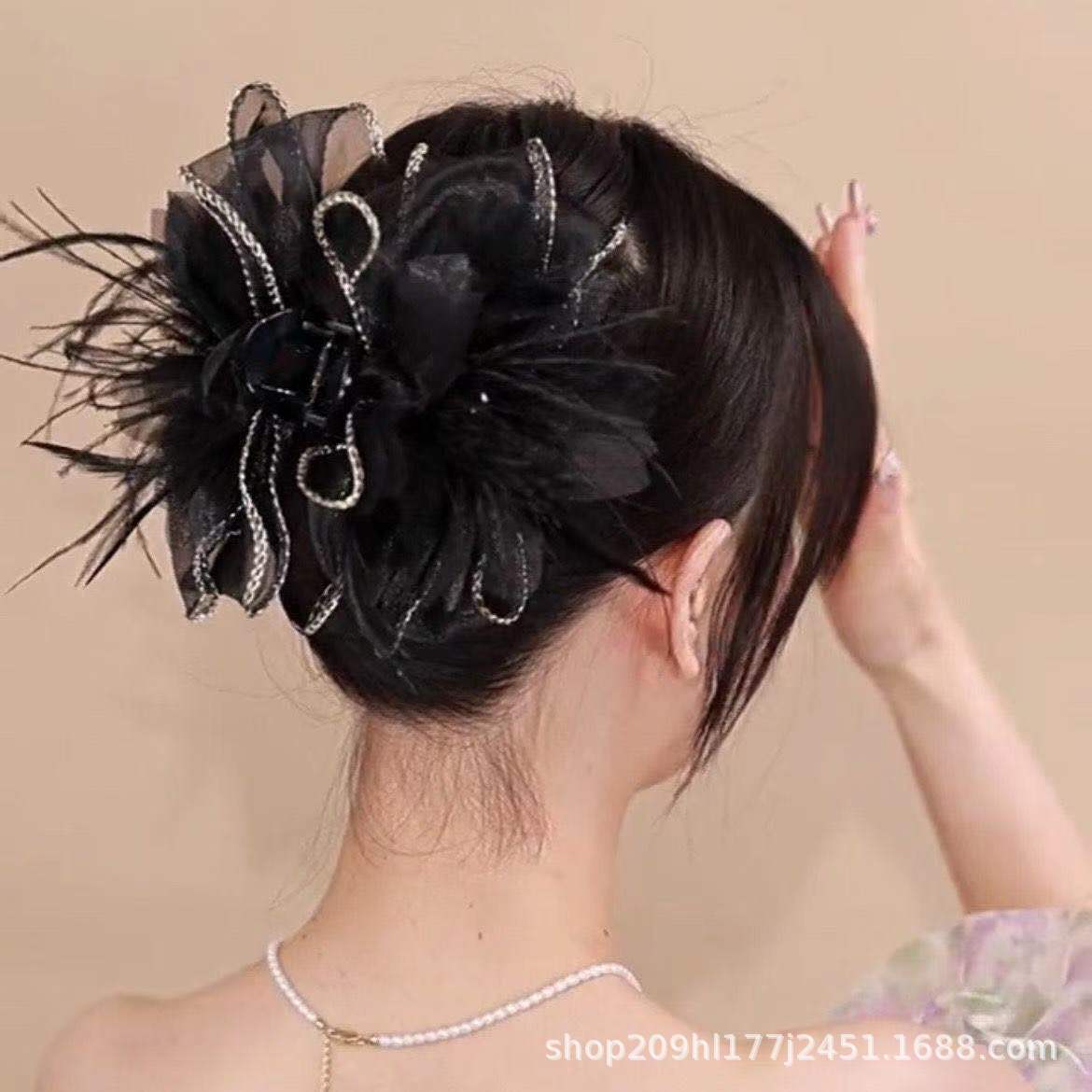 网纱蝴蝶结羽毛抓夹后脑勺盘发鲨鱼夹头饰高级感复古发夹发饰头花
