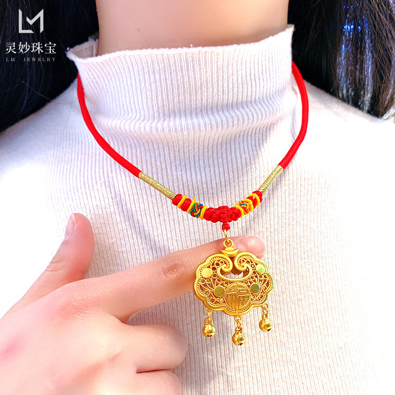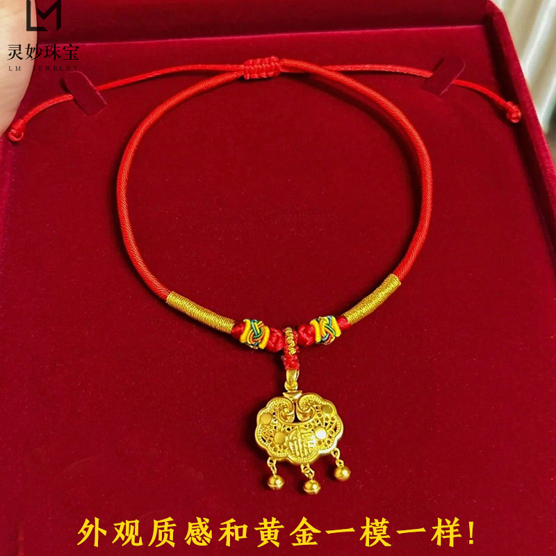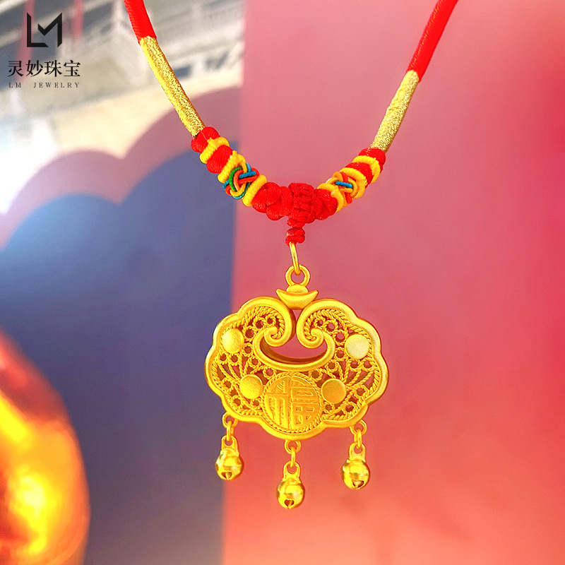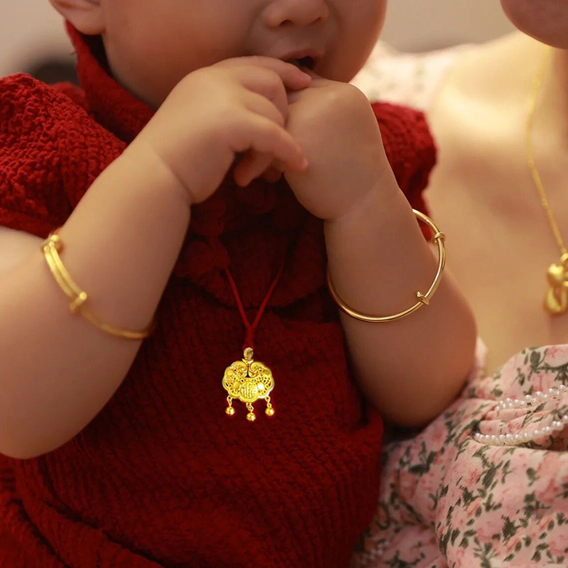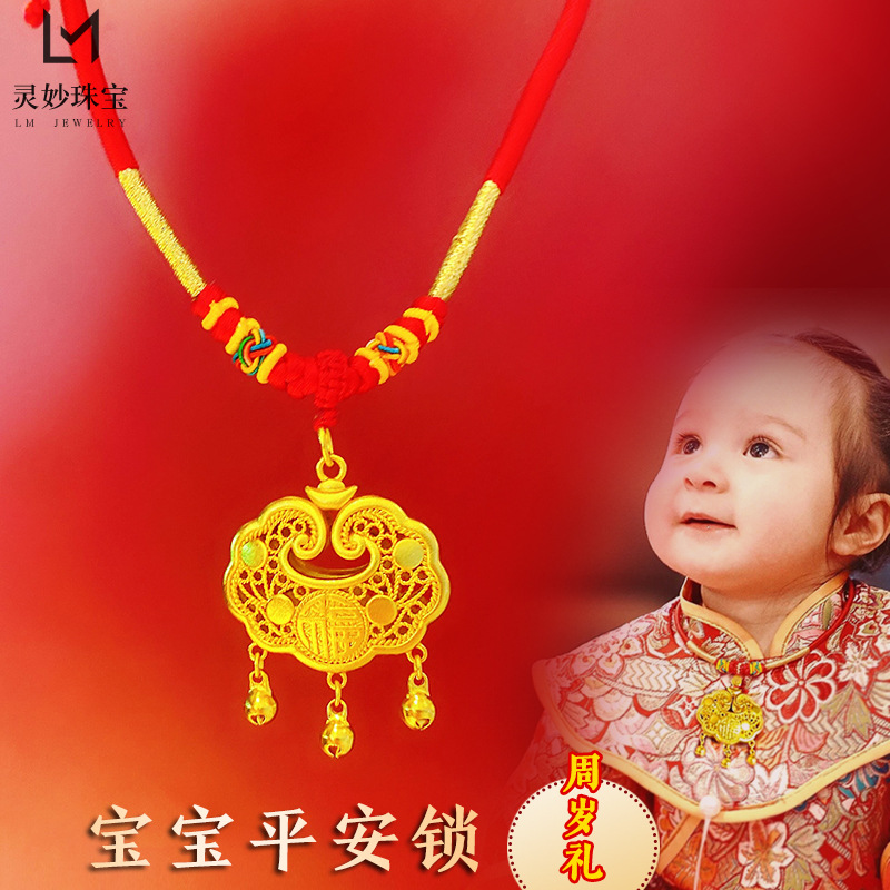 古法沙金999宝宝金锁吊坠红绳福字长命平安锁项链儿童满月周岁礼