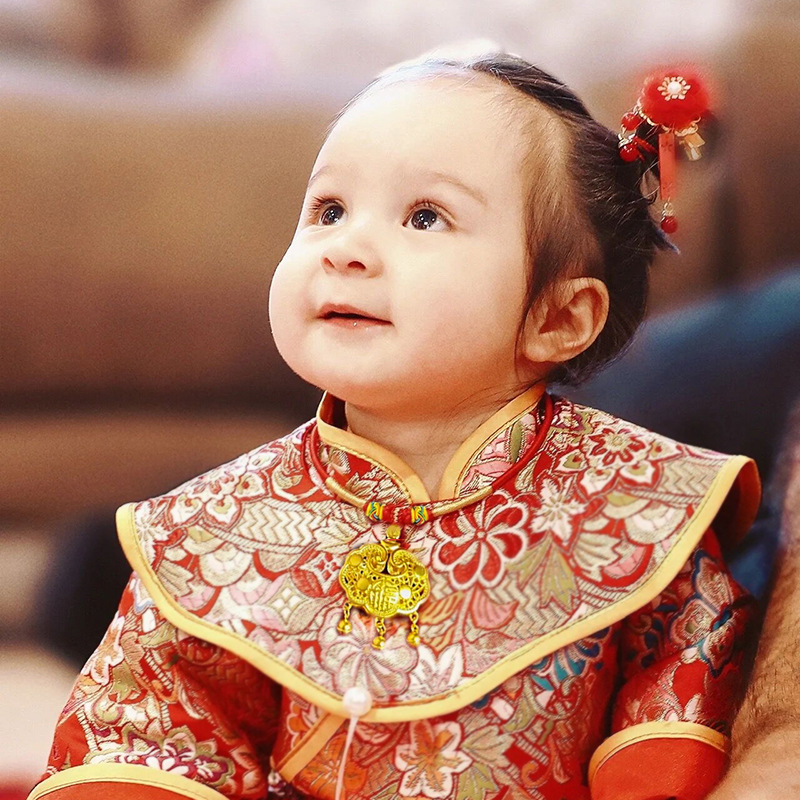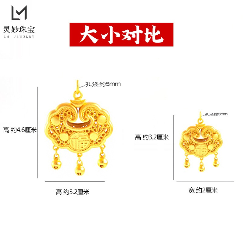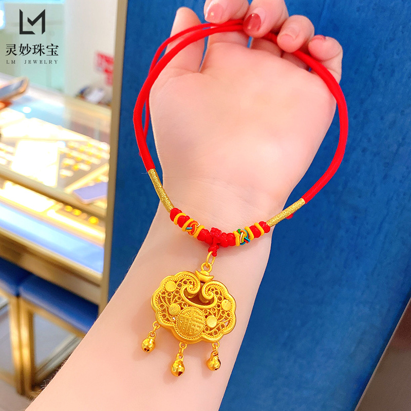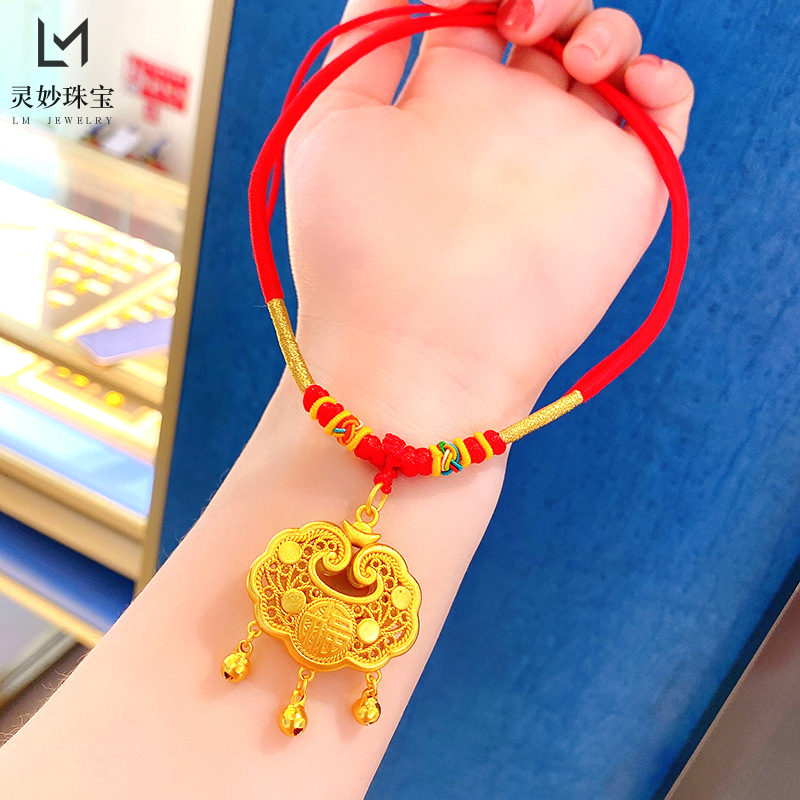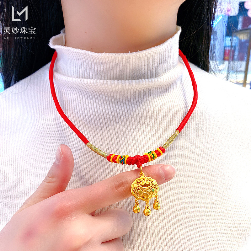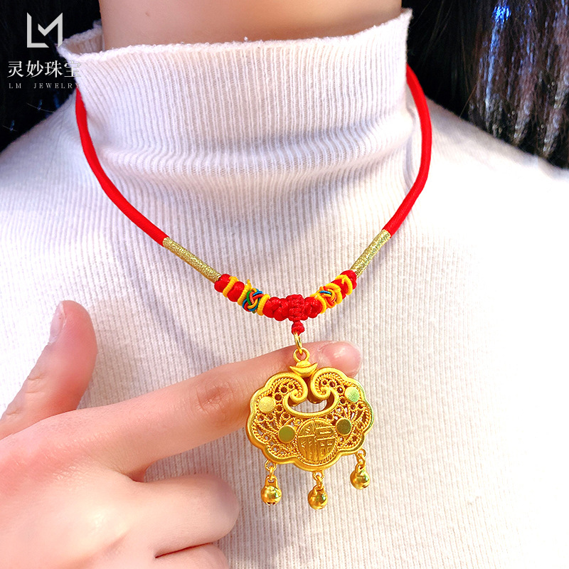 古法沙金999宝宝金锁吊坠红绳福字长命平安锁项链儿童满月周岁礼