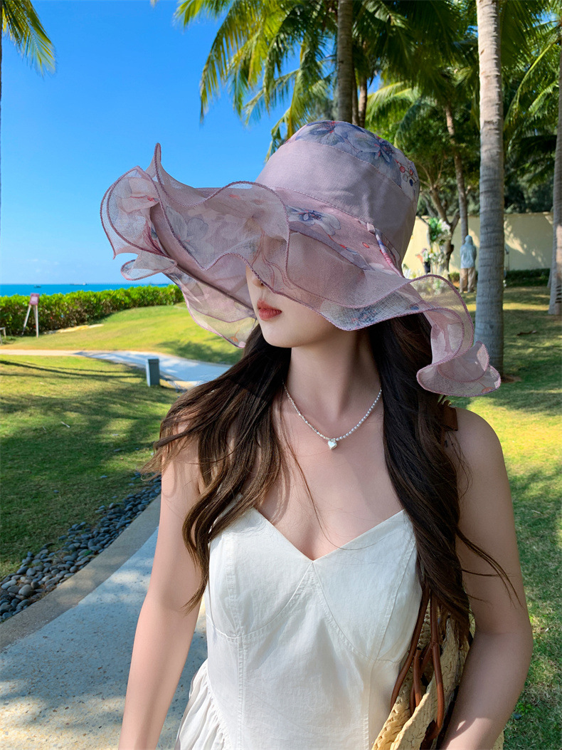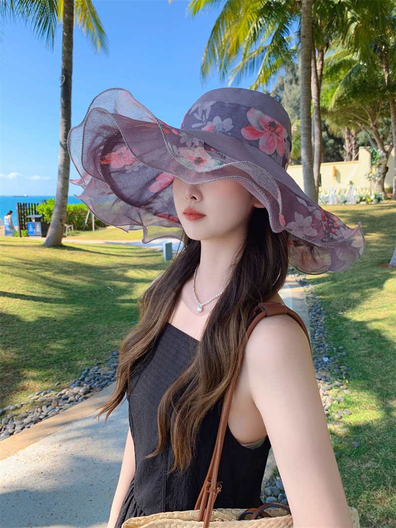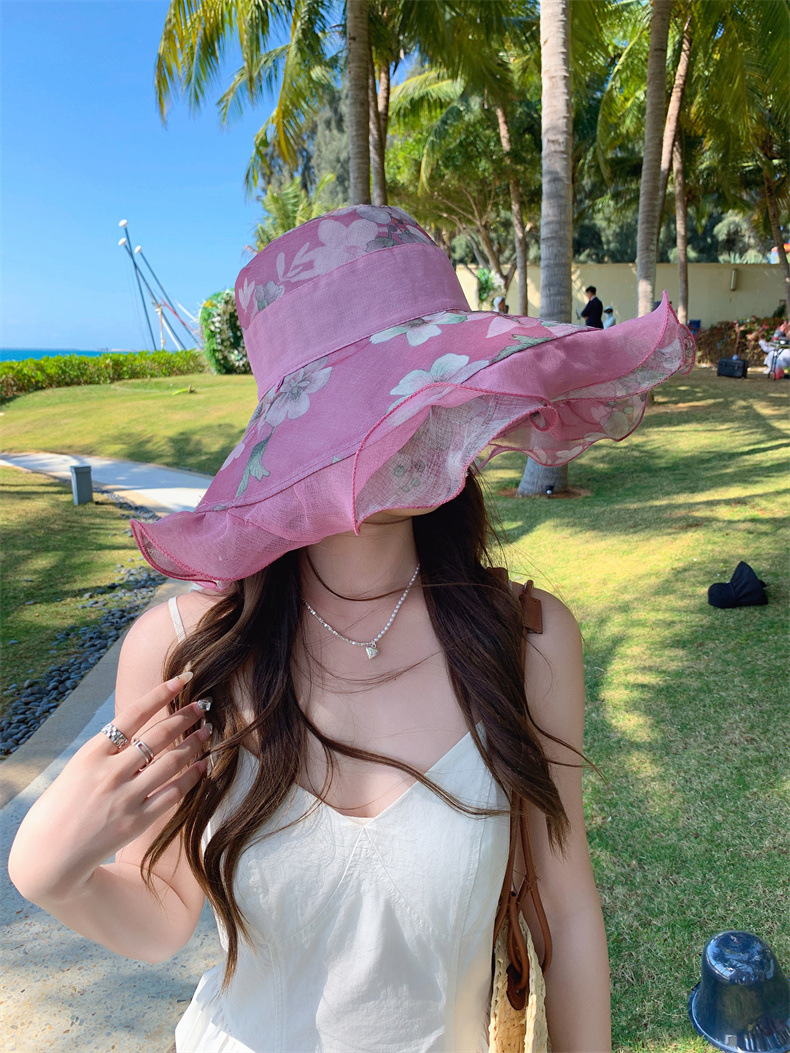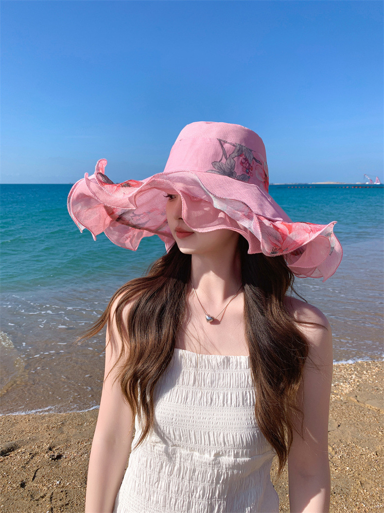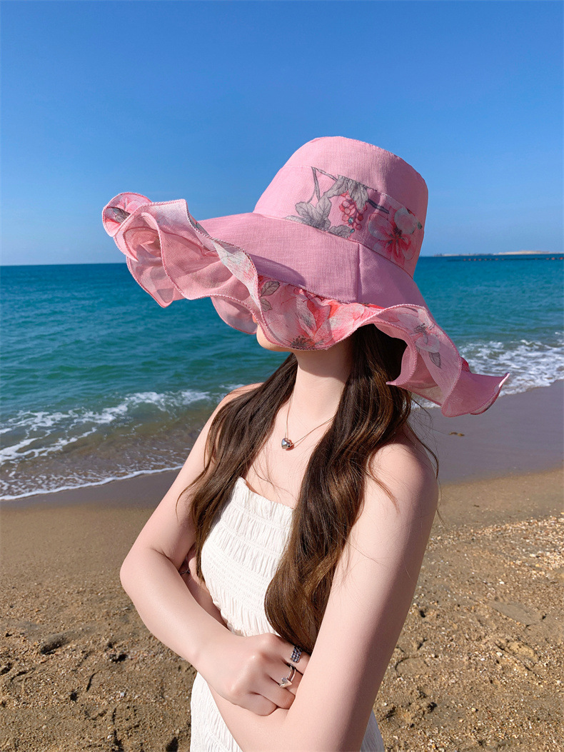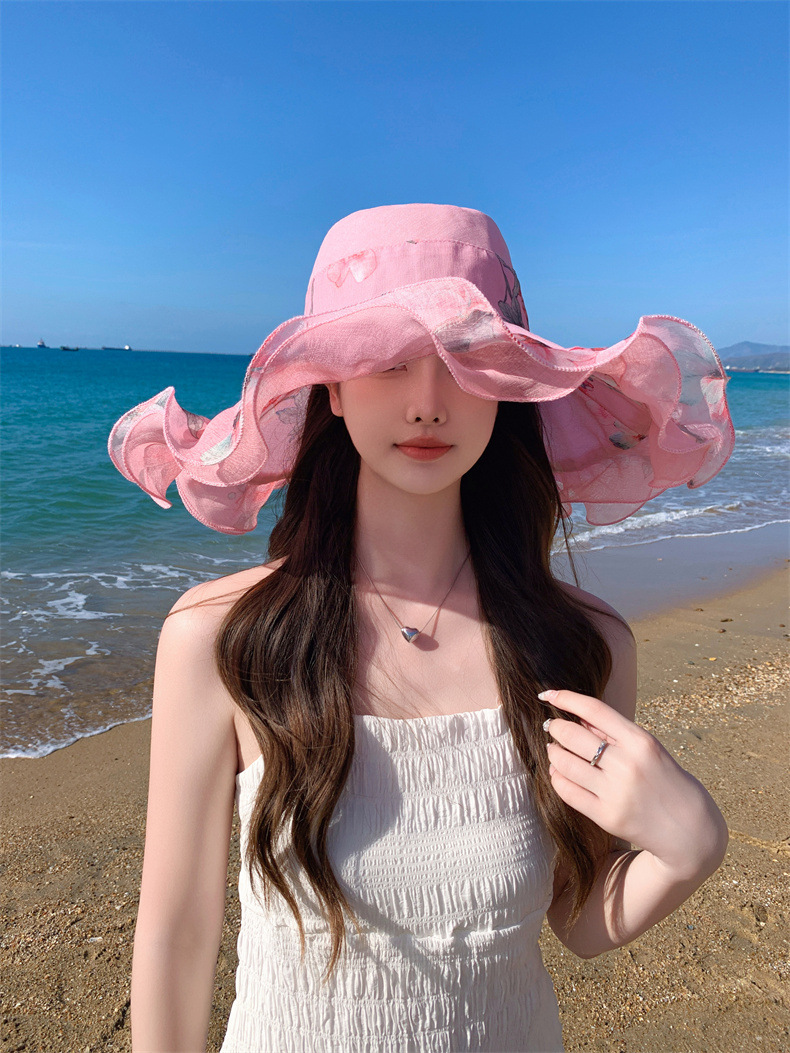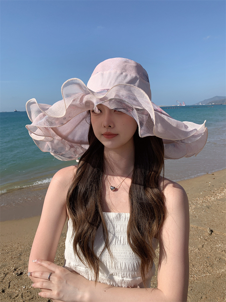 时尚波浪沿沙滩帽子女士夏季防紫外线真丝渔夫帽户外沙滩太阳帽潮