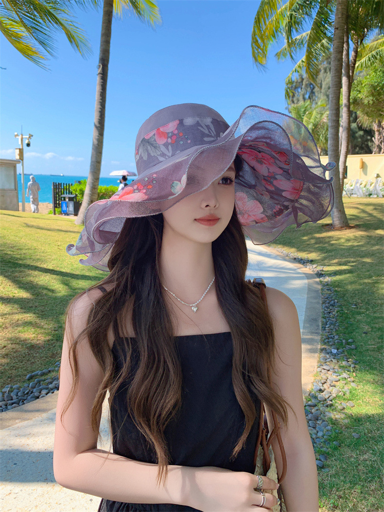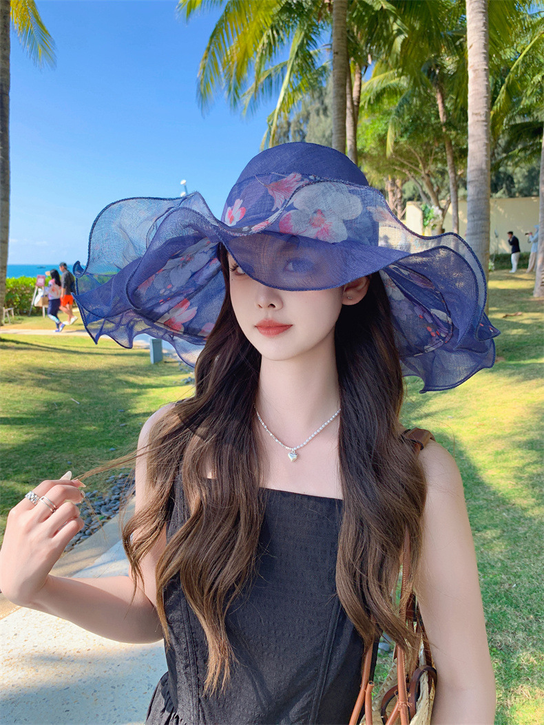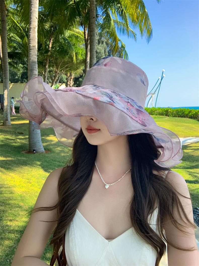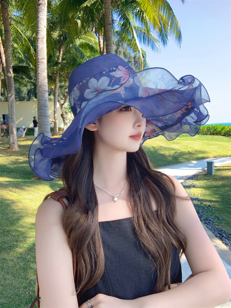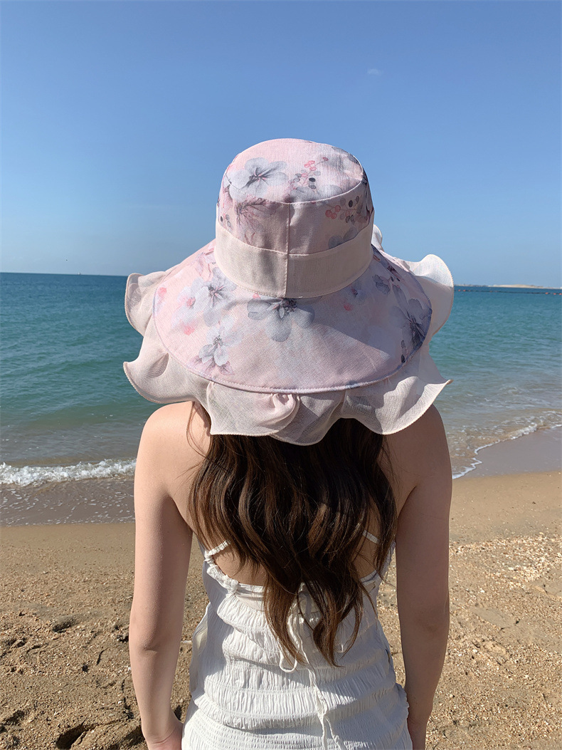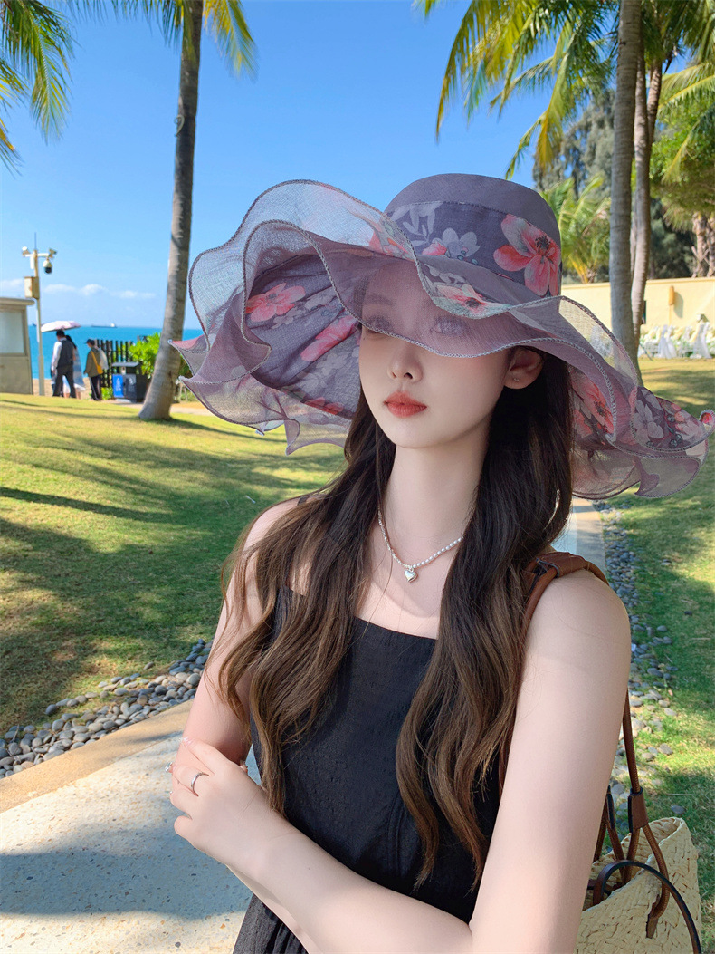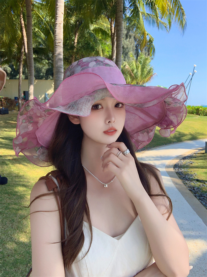 时尚波浪沿沙滩帽子女士夏季防紫外线真丝渔夫帽户外沙滩太阳帽潮