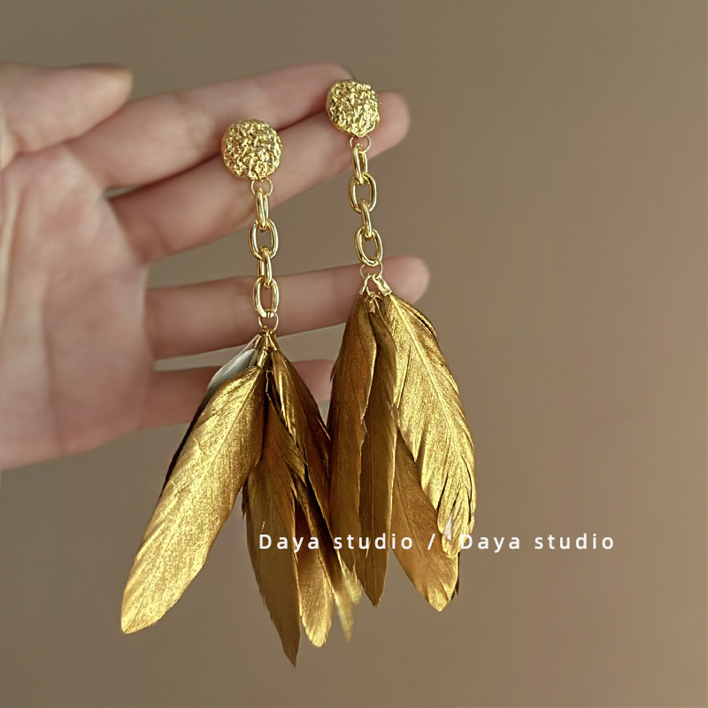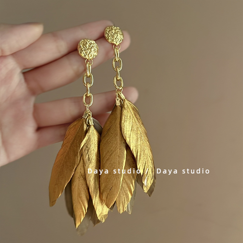 异域民族风复古金色羽毛流苏耳环众气质中新式长款度假显脸瘦耳饰