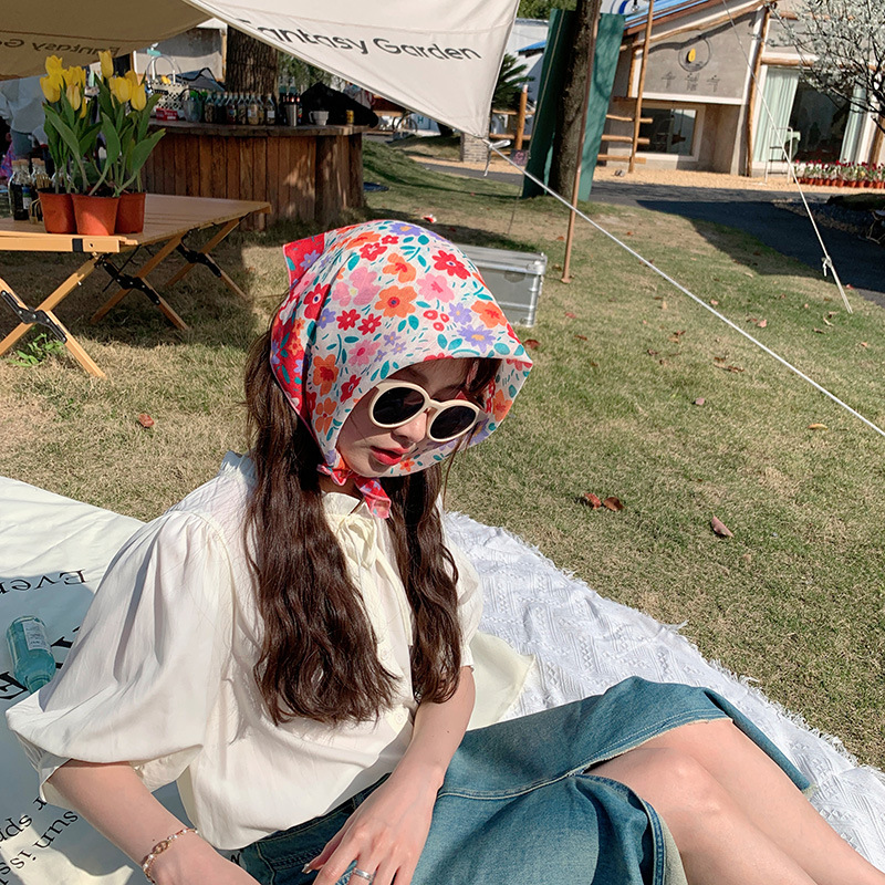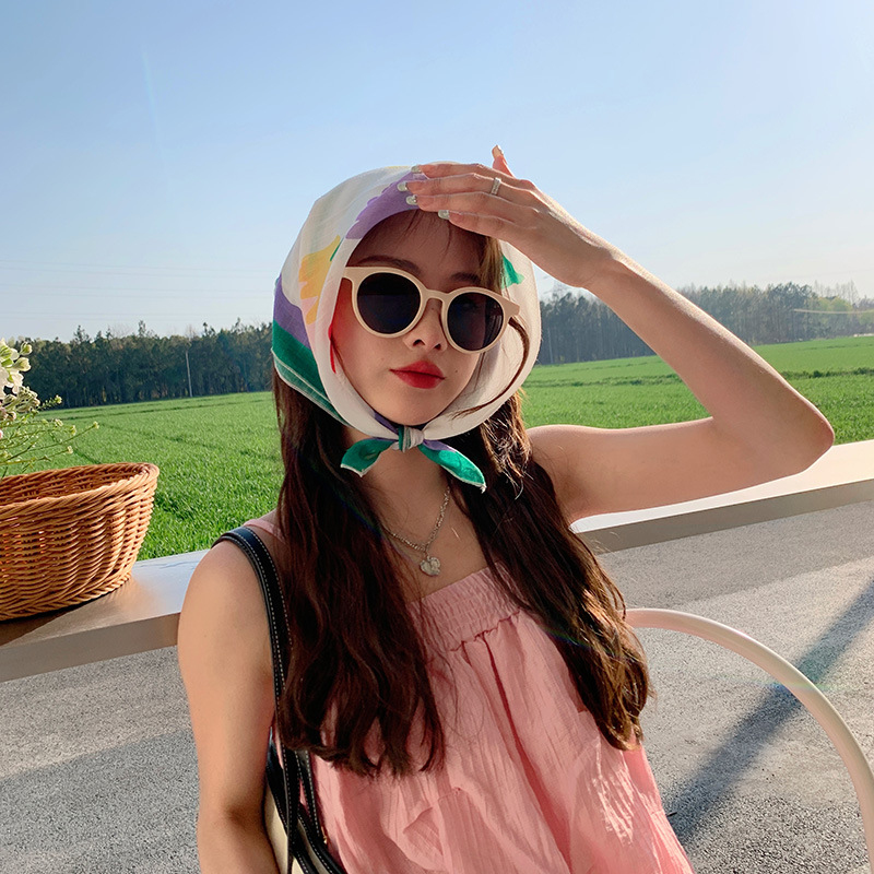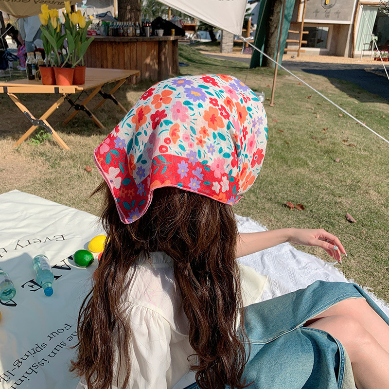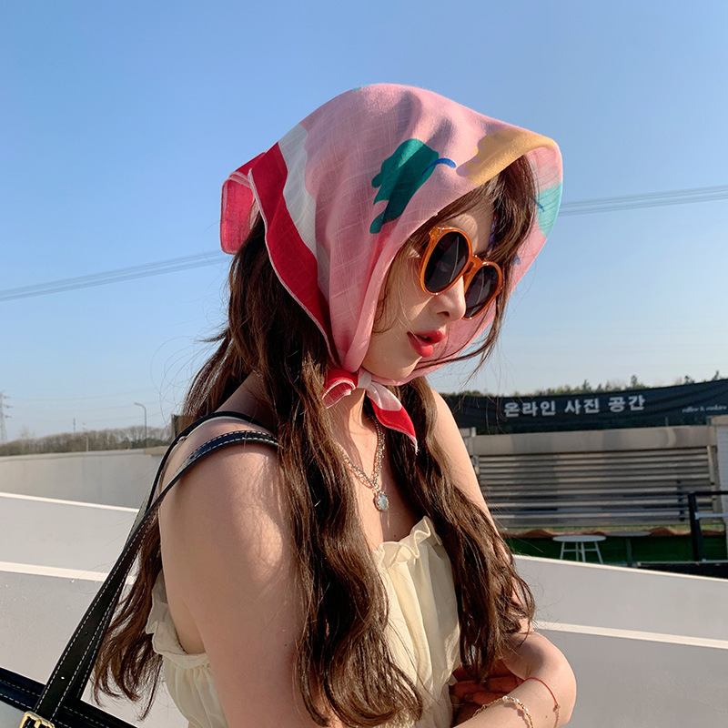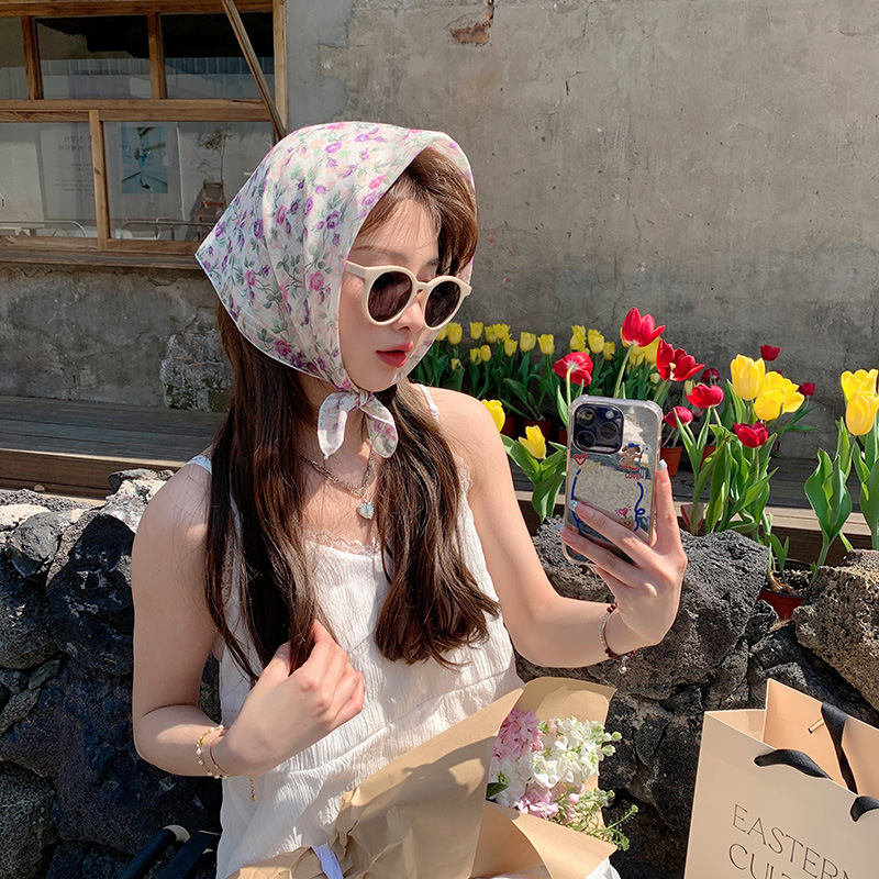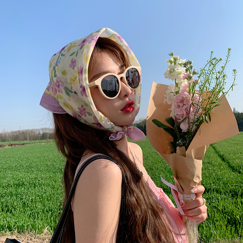 甜美棉麻小方巾夏透气纱巾女气质头巾时尚装饰发带花朵领巾围巾