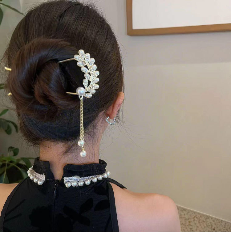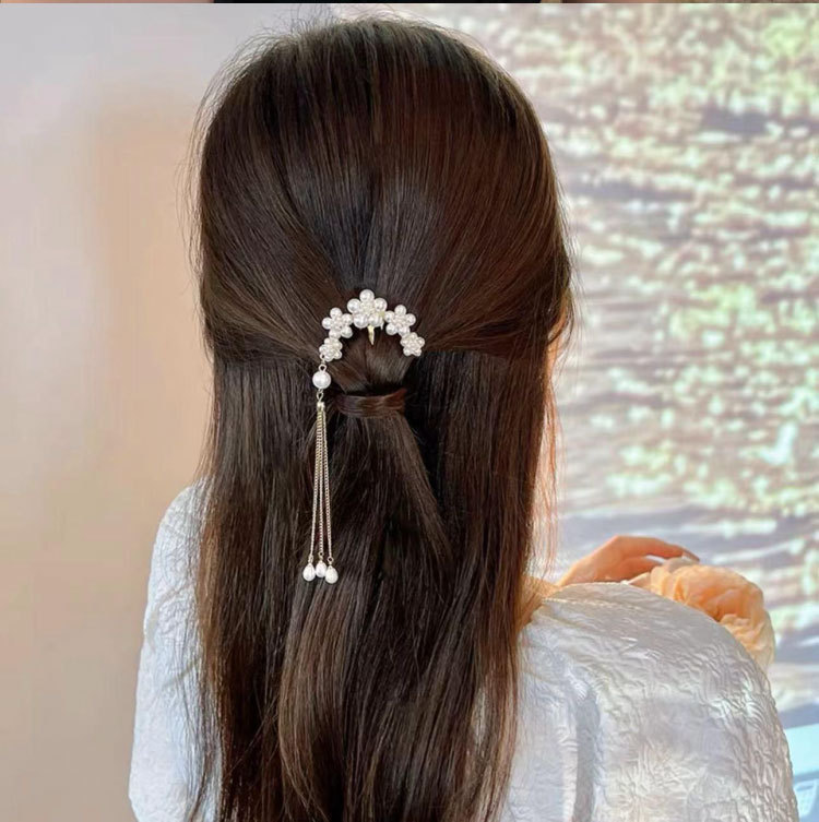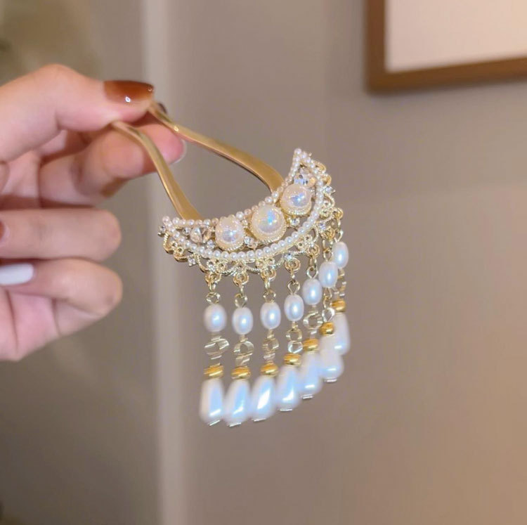 新中式超仙珍珠流苏U型发簪扇形发钗精致盘发神器优雅头饰发饰