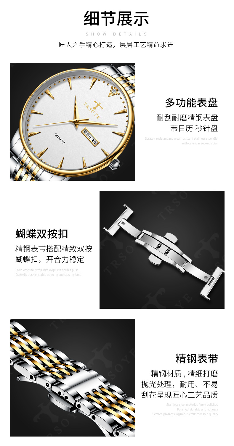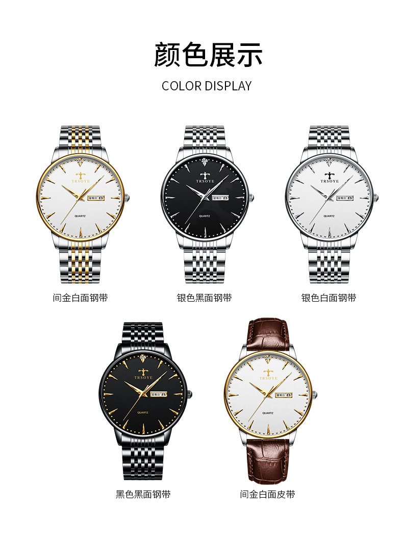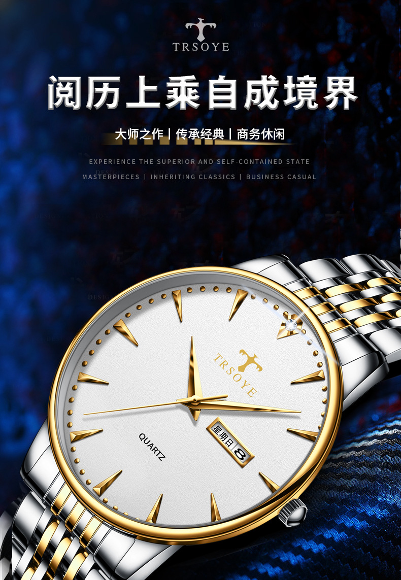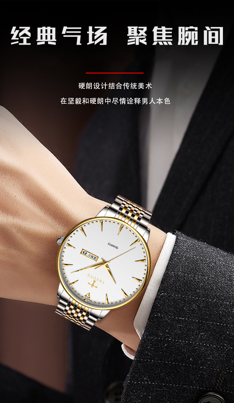 瑞士品牌男士手表商务防水夜光双日历石英钢带表直播外贸一件代发