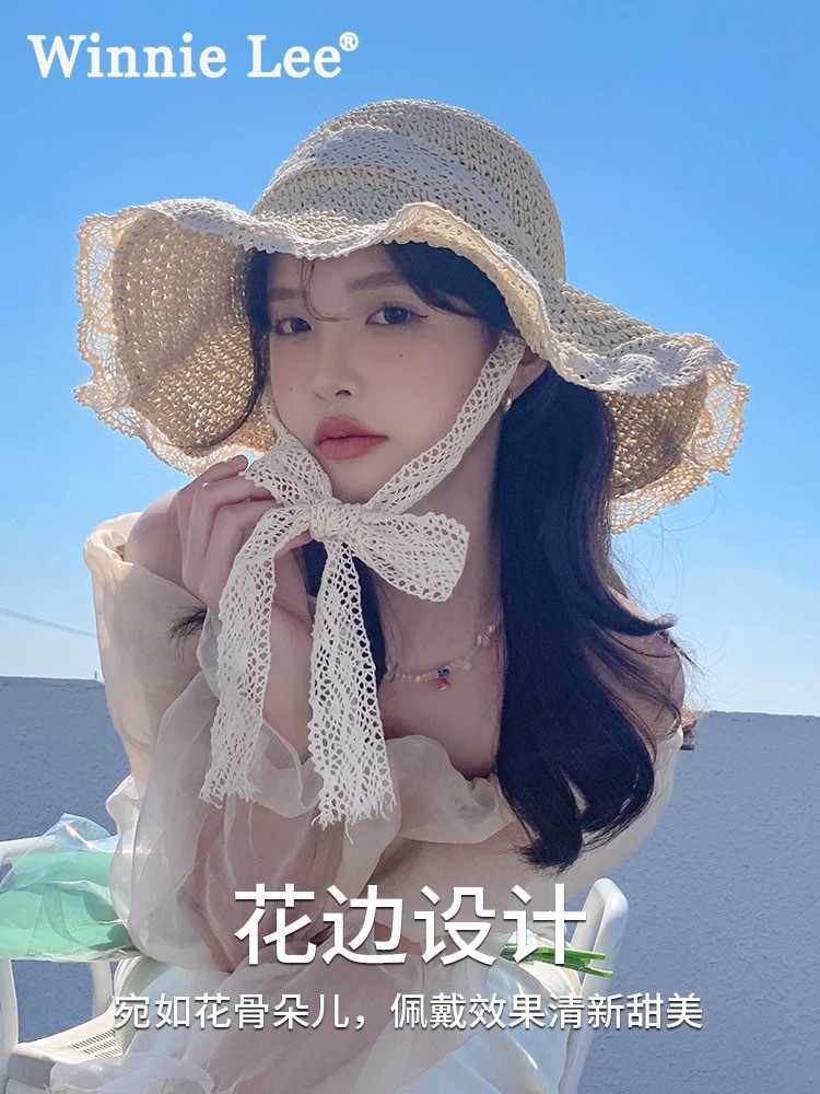 防晒帽子夏季蕾丝草帽编织女大帽檐遮阳帽海边渔夫帽显脸小沙滩帽