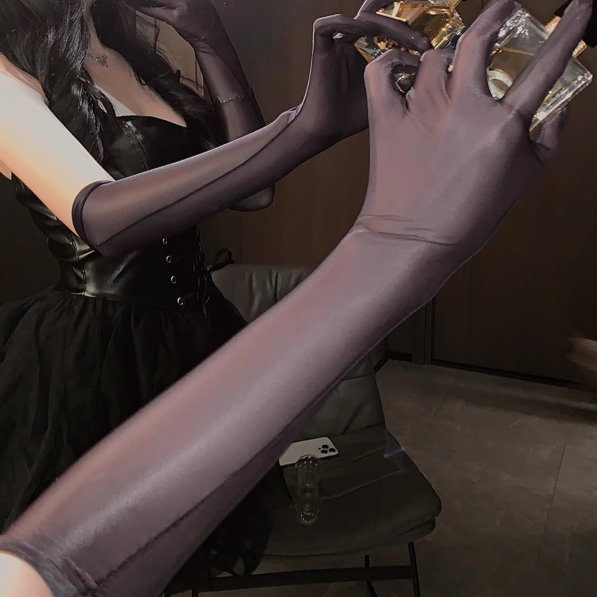 透明蕾丝亮黑丝滑分指手套女薄款性感黑丝cos个性袖套防勾丝