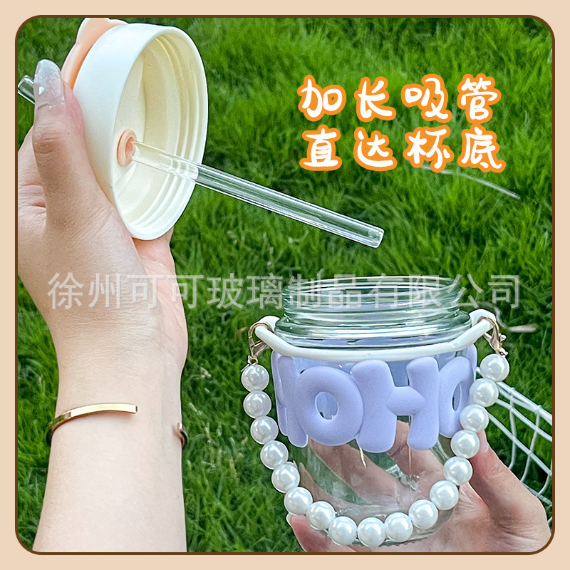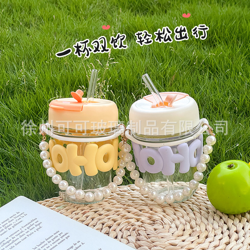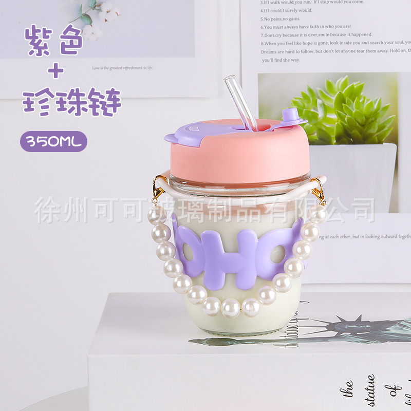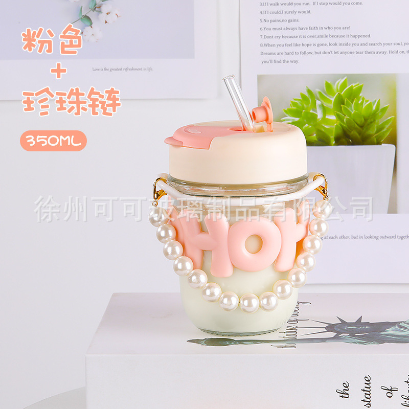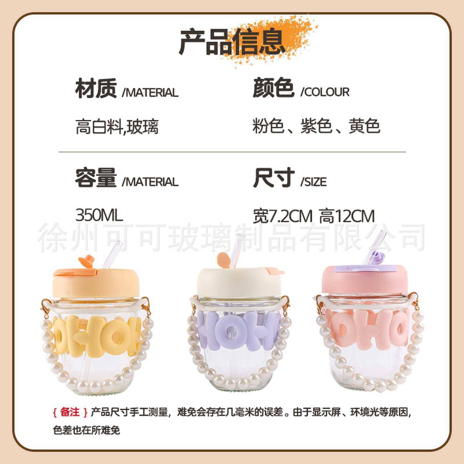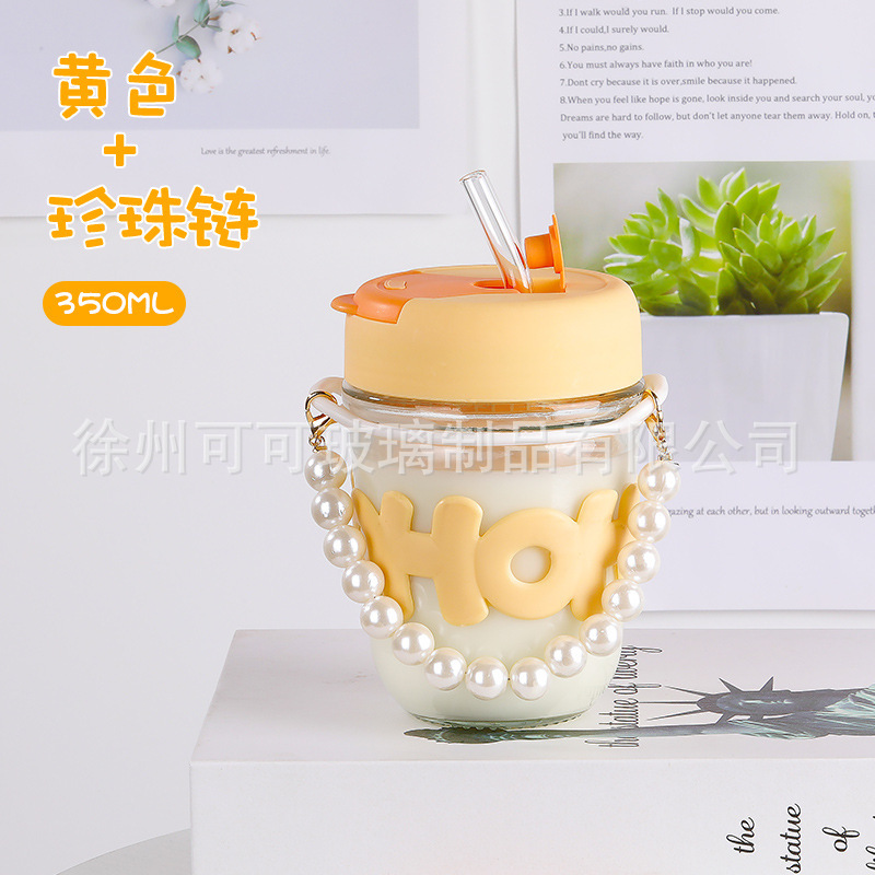 可爱吸管杯高颜值网红卡通玻璃杯珍珠链杯子字母玻璃水杯冷饮杯子