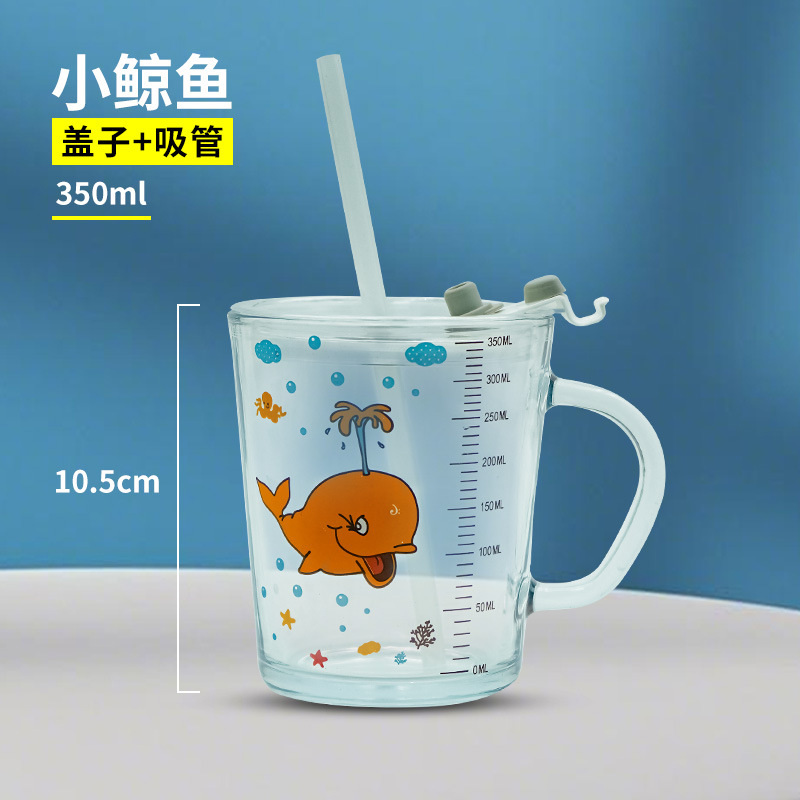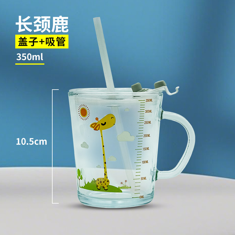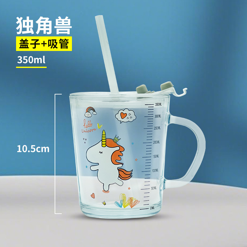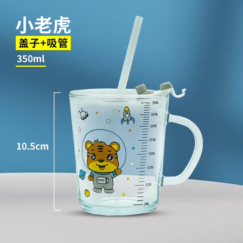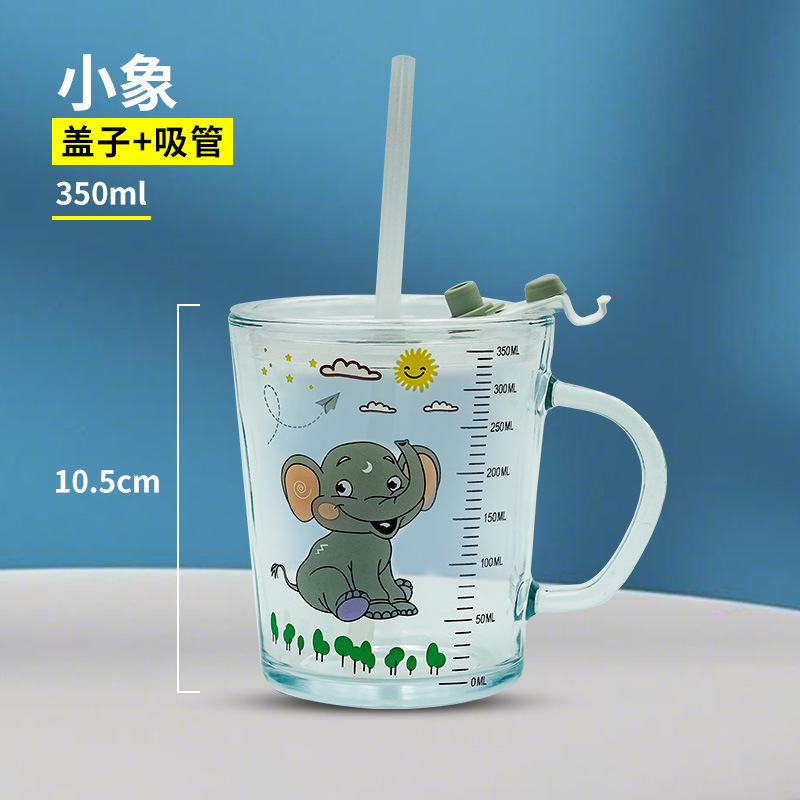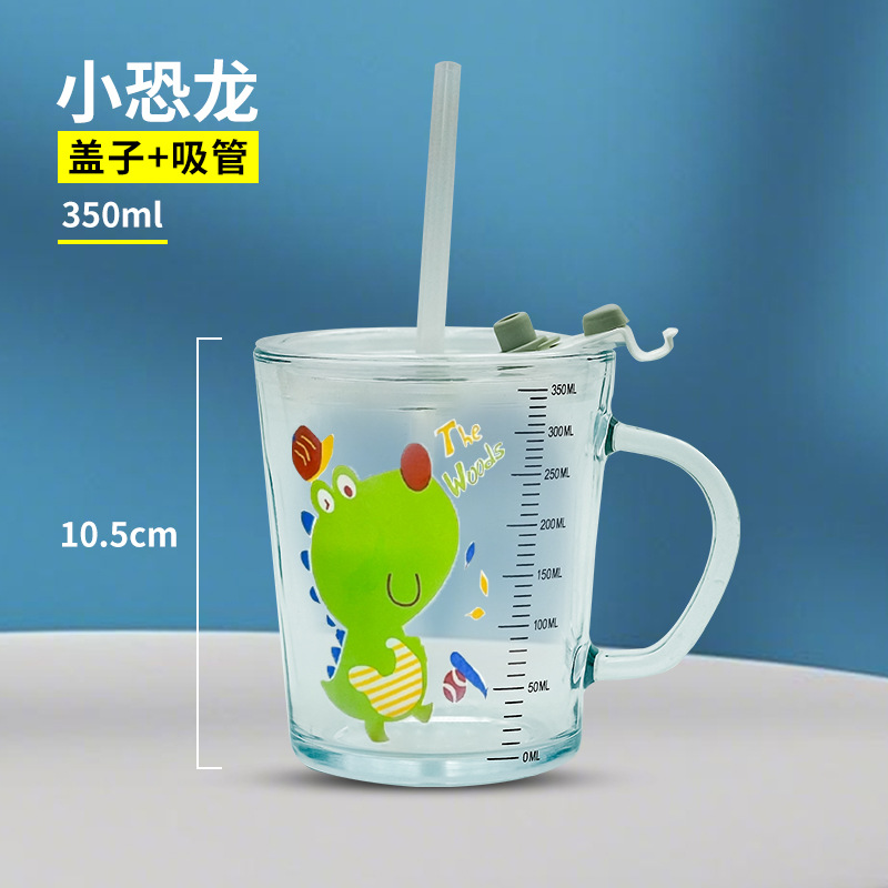 批发把手玻璃杯可爱卡通玻璃吸管杯儿童牛奶杯带刻度水杯
