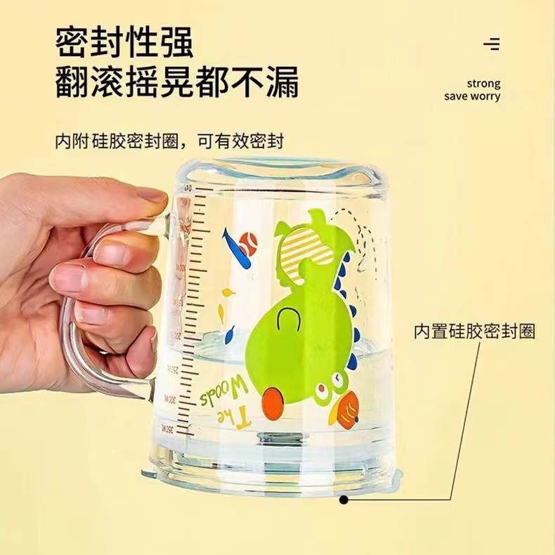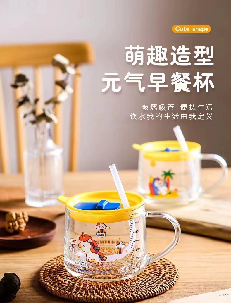 加厚玻璃儿童牛奶杯带刻度吸管杯子家用果汁饮料奶粉卡通带盖水杯