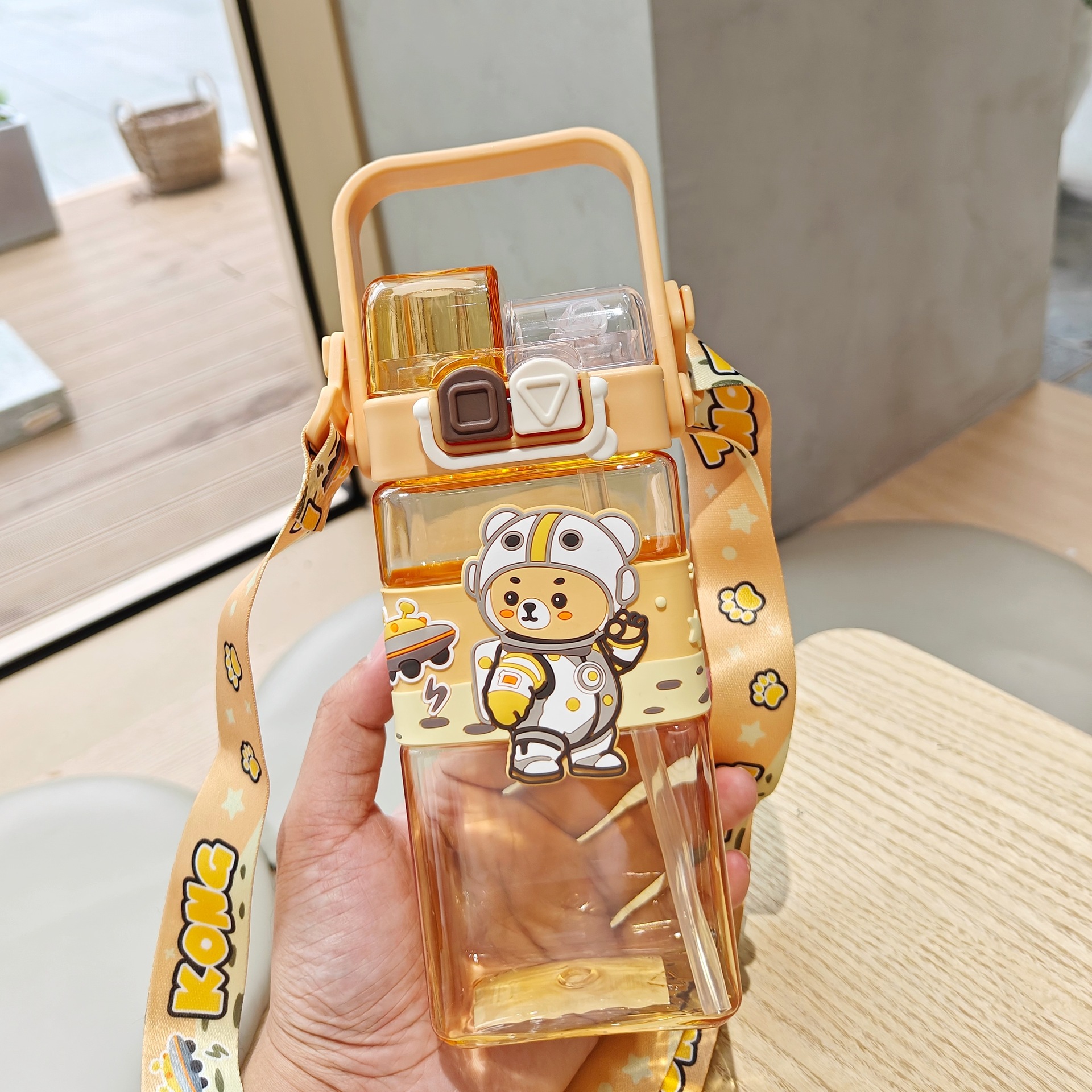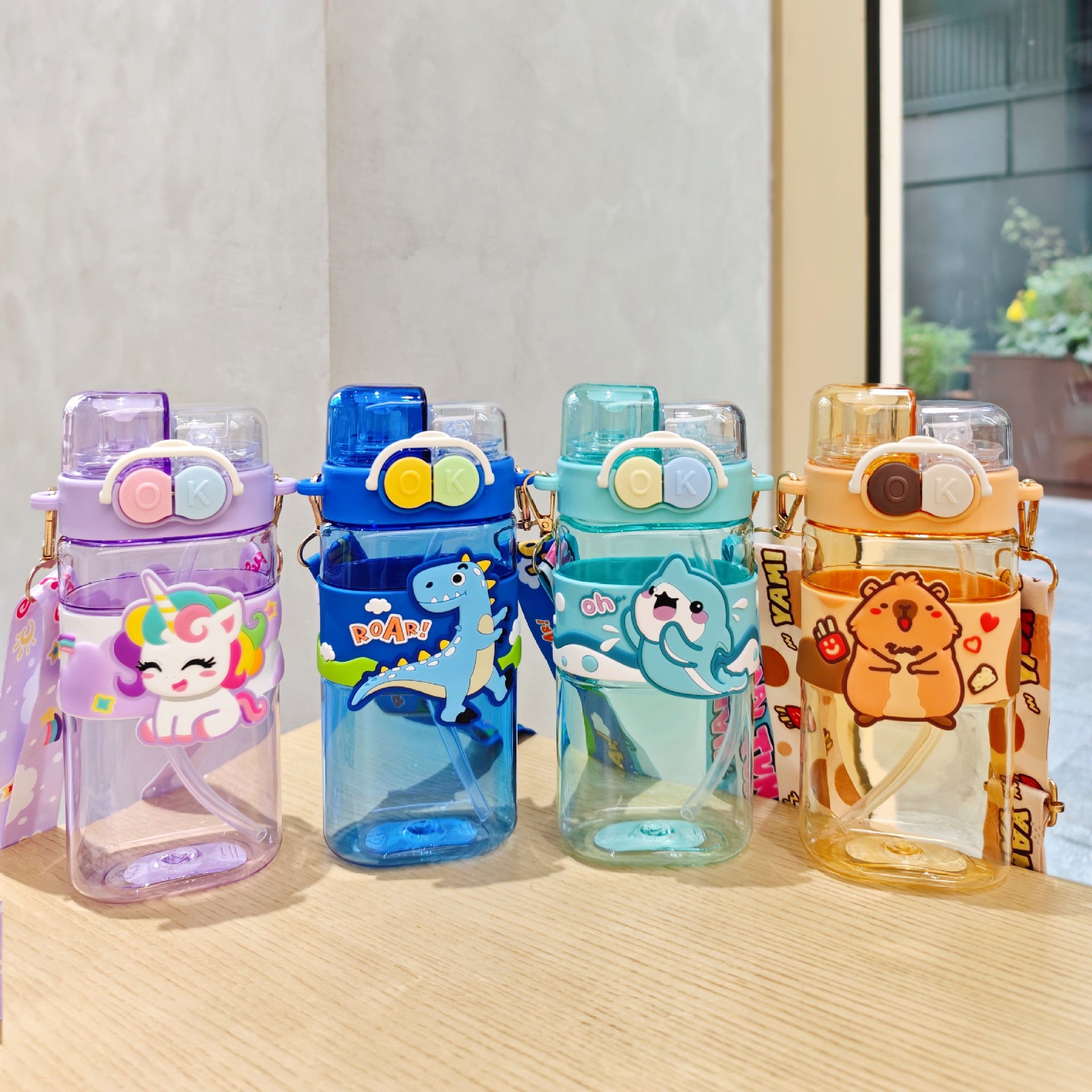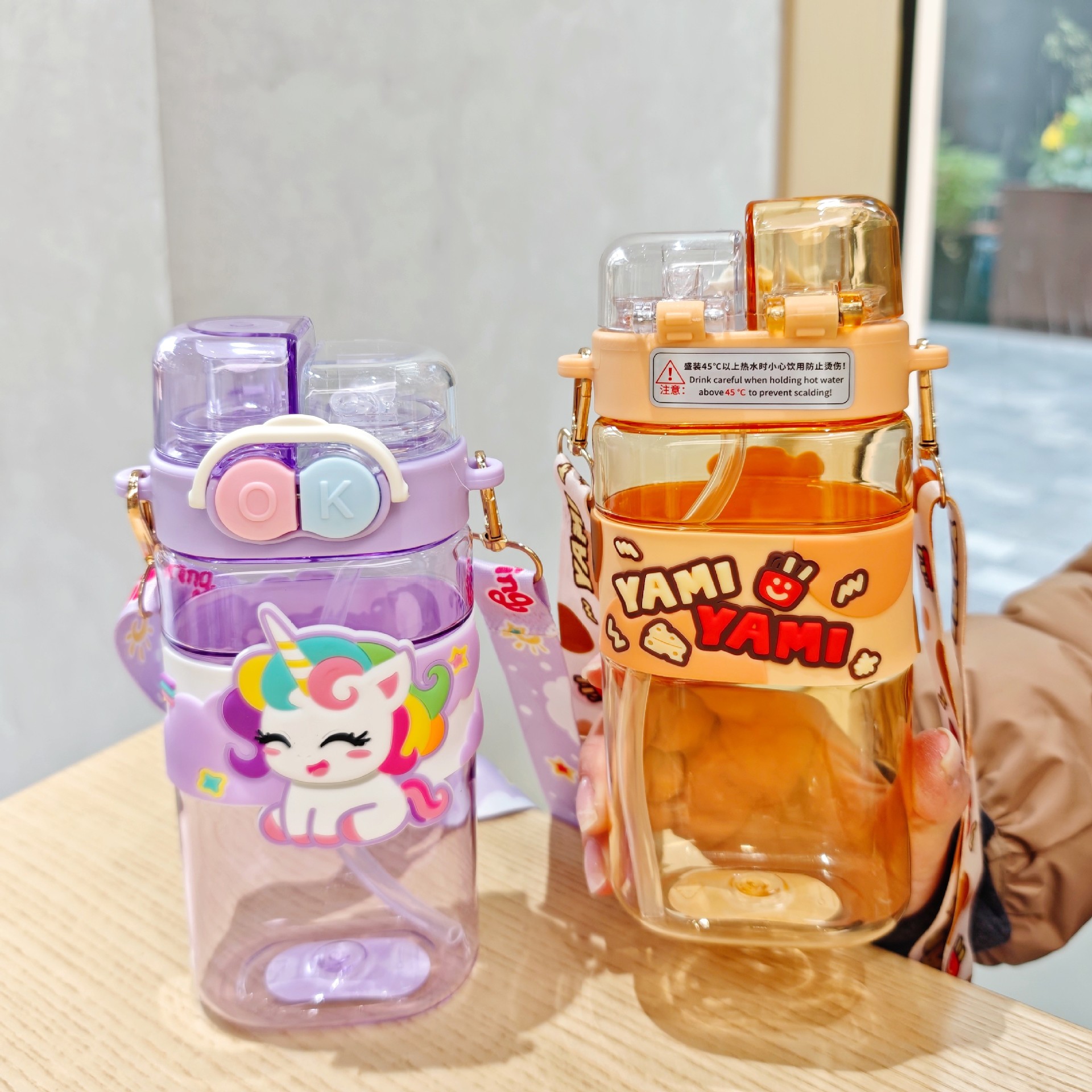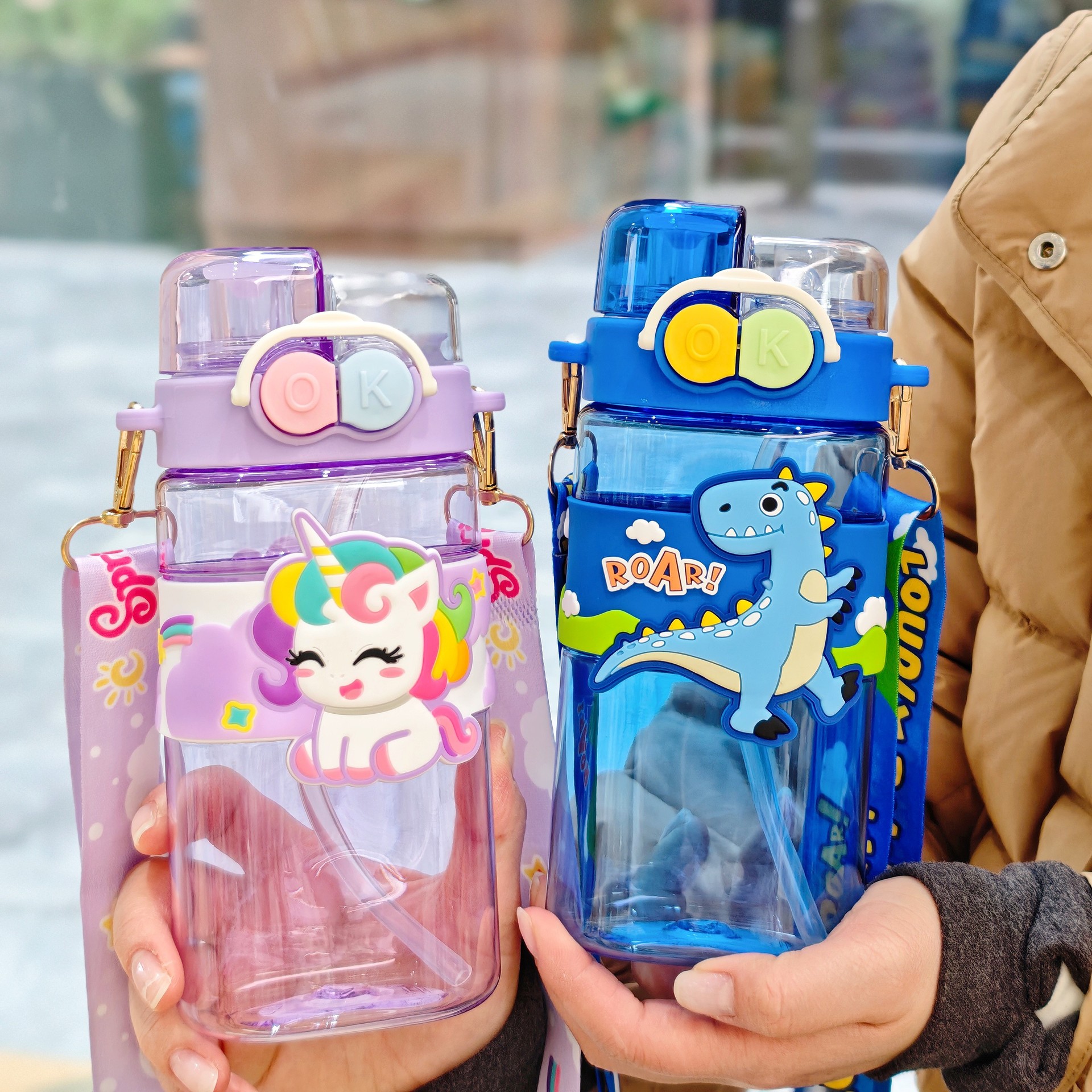 2025新款卡通塑料杯可爱双饮杯背带便携儿童吸管水杯跨境杯子批发