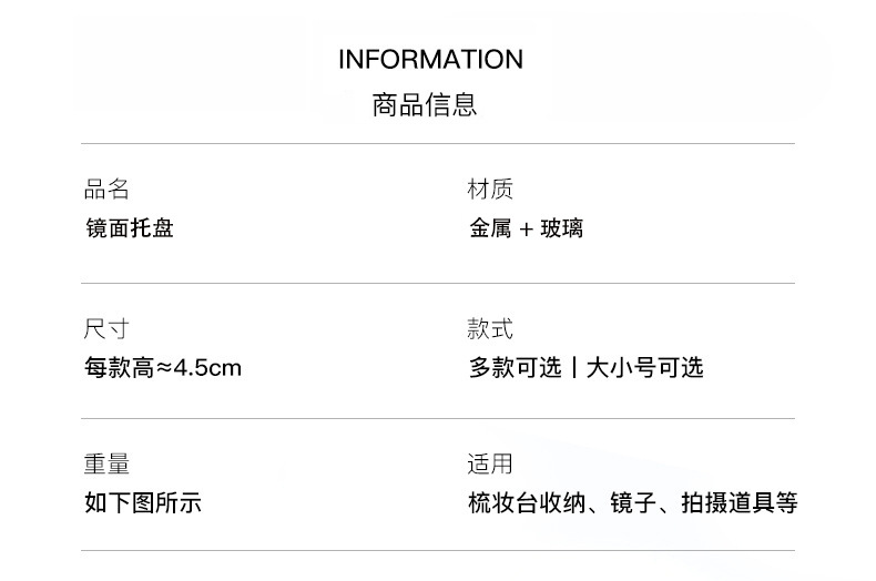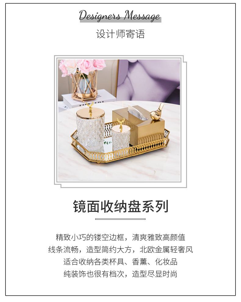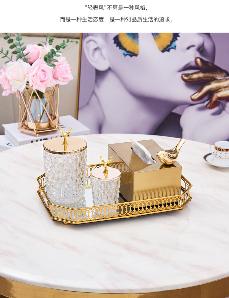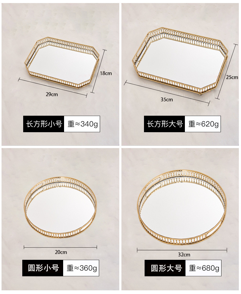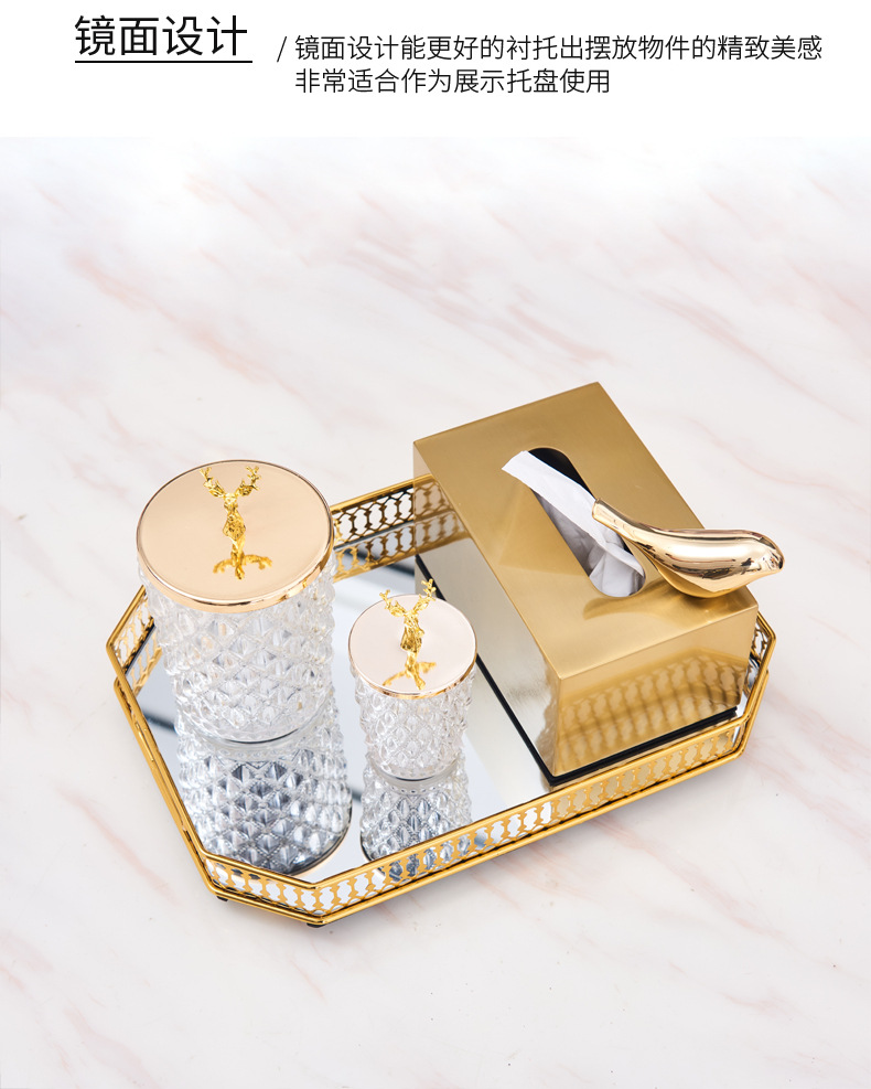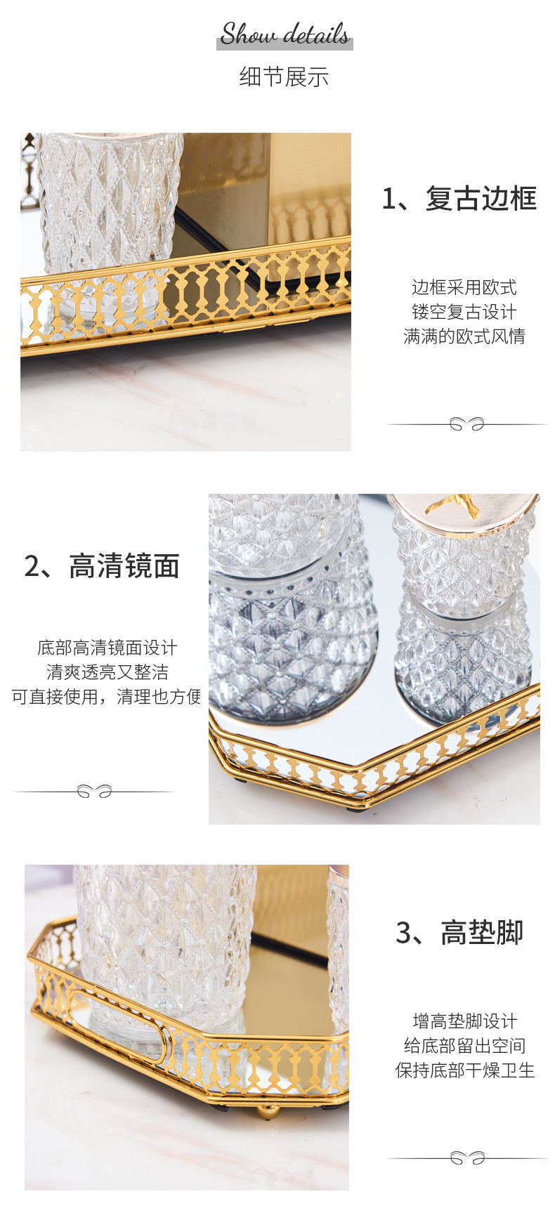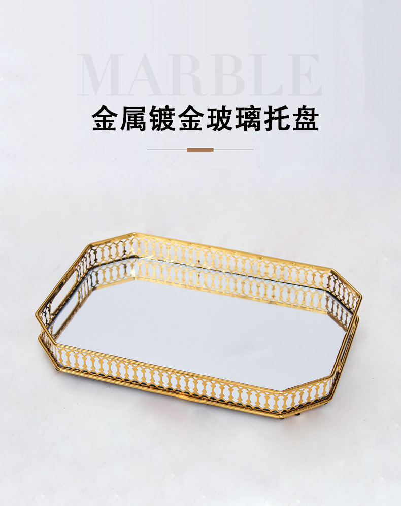 欧式轻奢镜面玻璃金属托盘客厅茶几玄关收纳盘水杯茶盘摆件装饰品