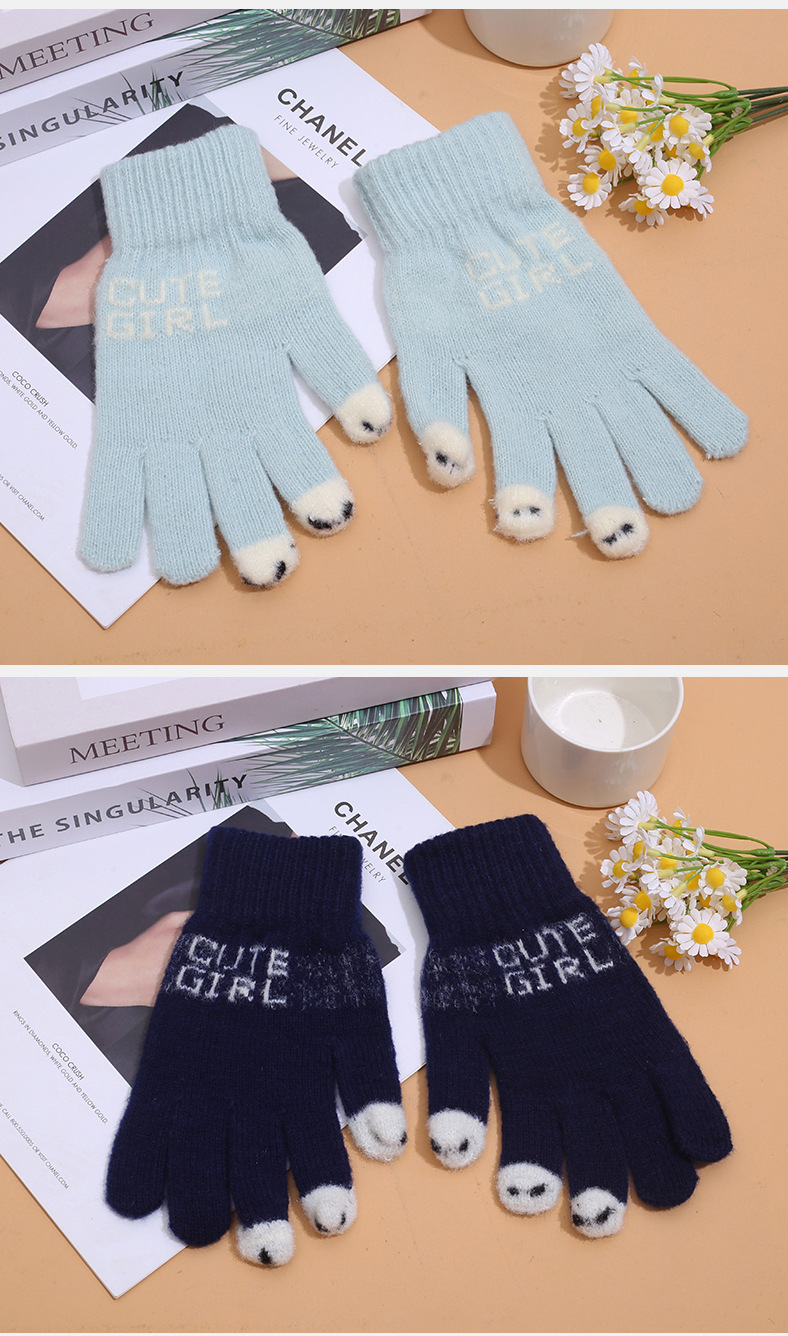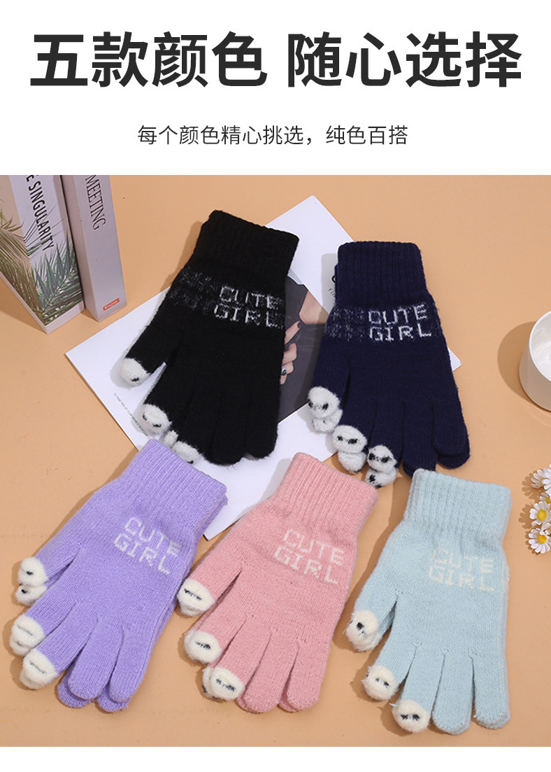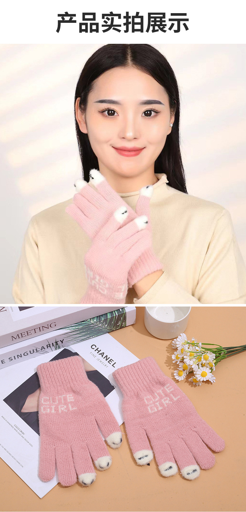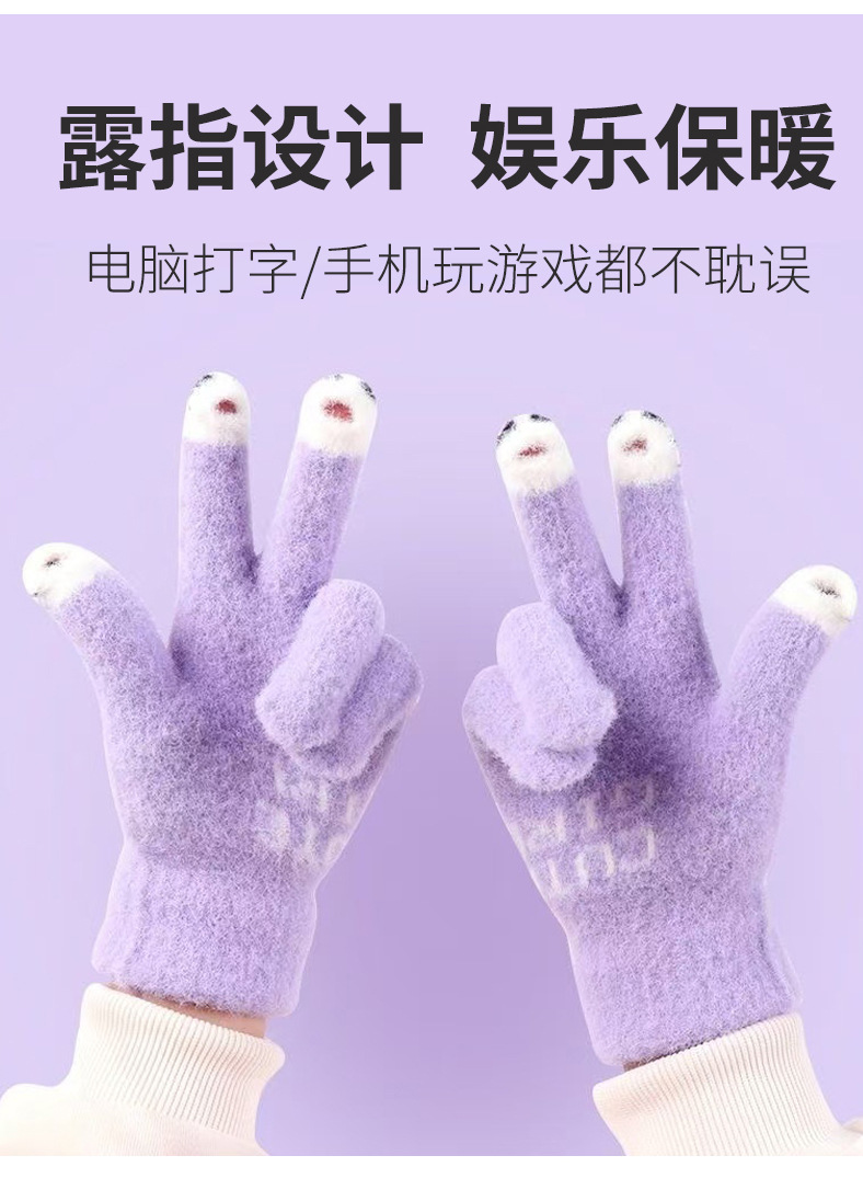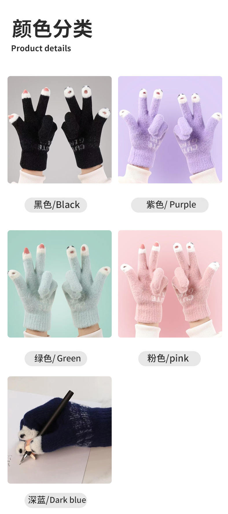 2023新款冬季露指保暖写字豆豆鱼手套凤凰绒可爱卡通抗起球