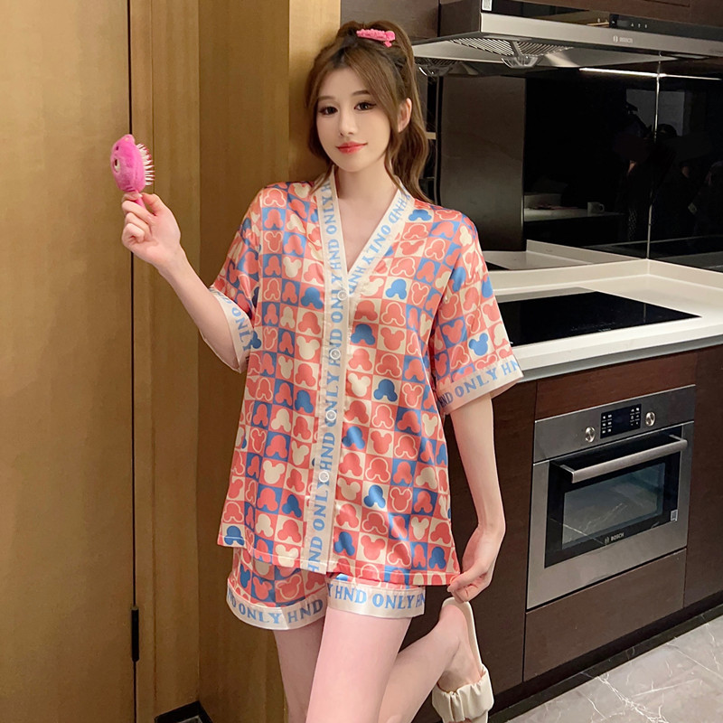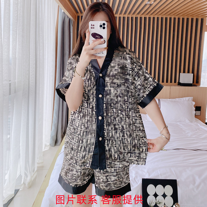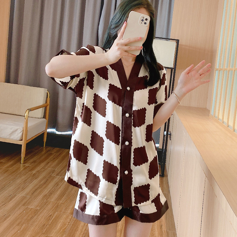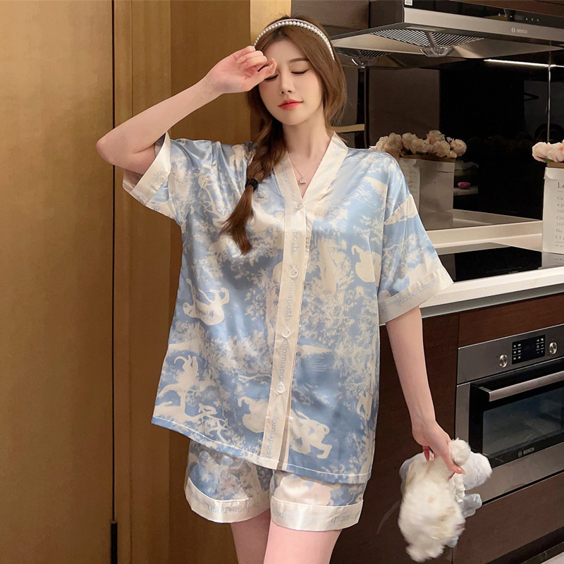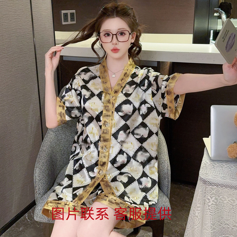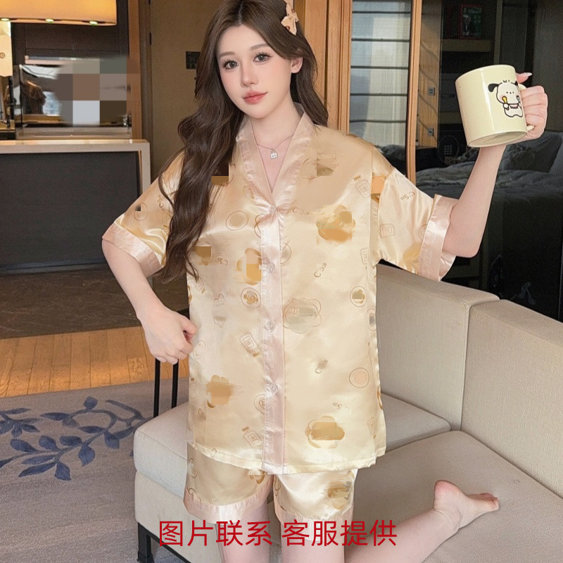 亚马逊外贸跨境热销冰丝睡衣夏短袖短裤女薄款家居服套装量大优惠