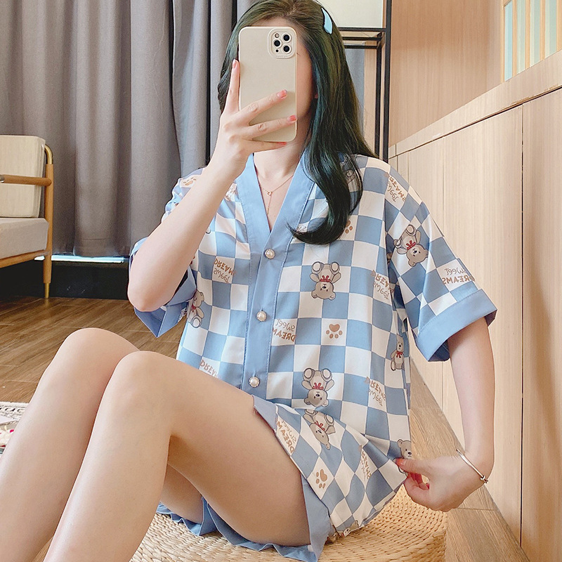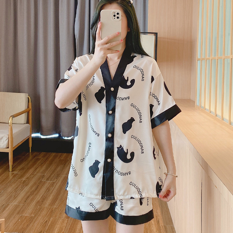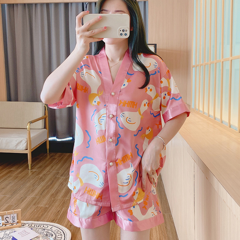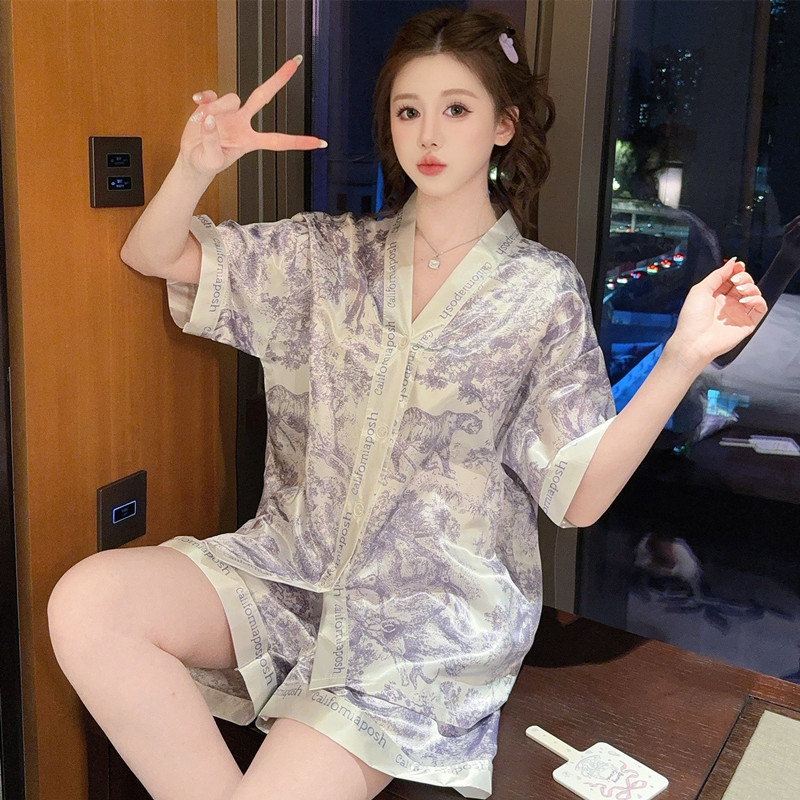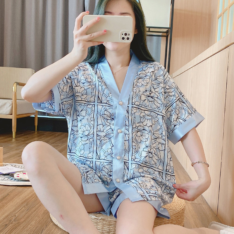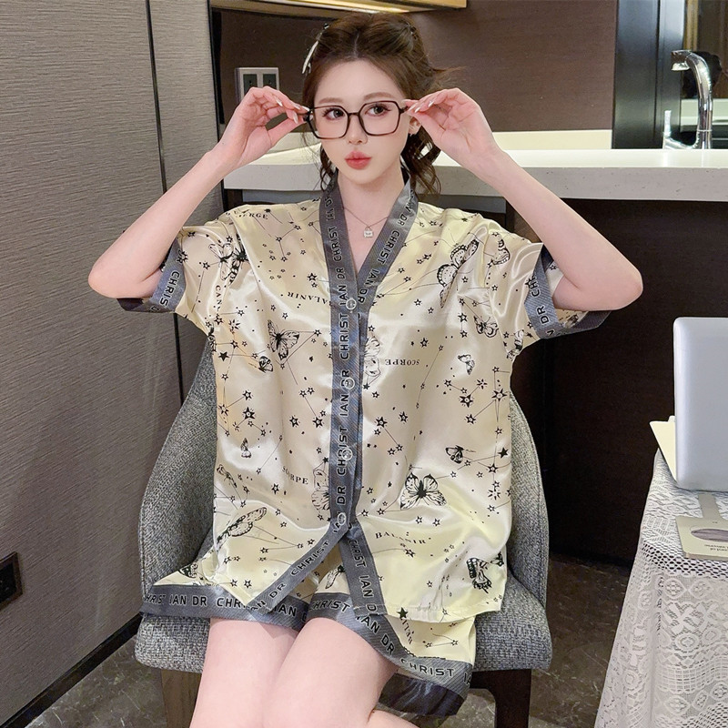 亚马逊外贸跨境热销冰丝睡衣夏短袖短裤女薄款家居服套装量大优惠