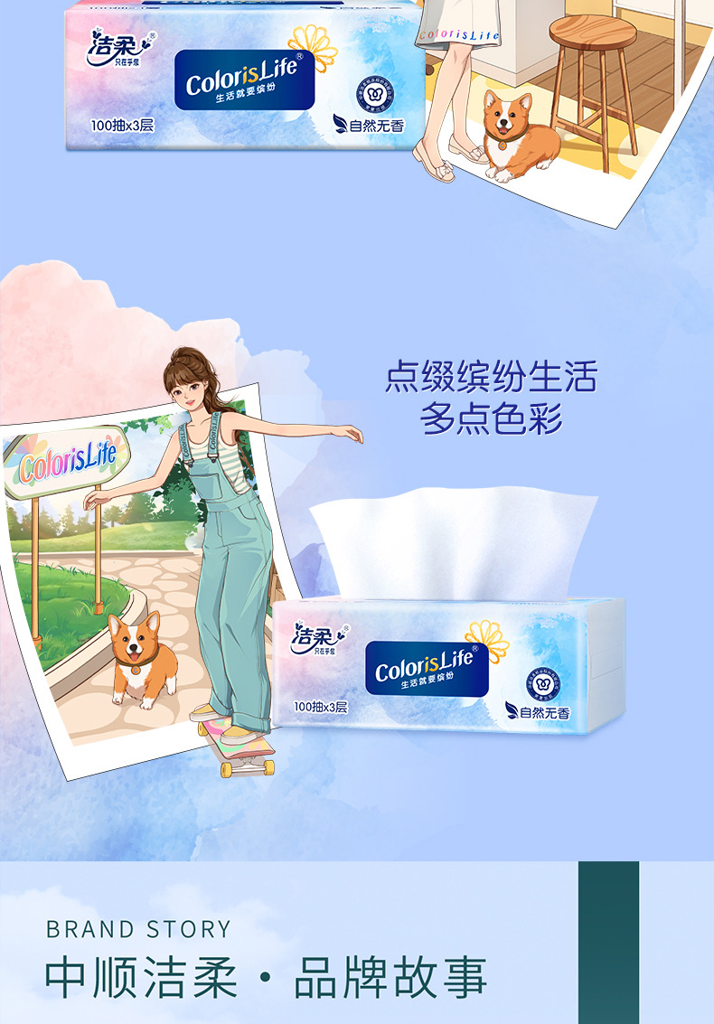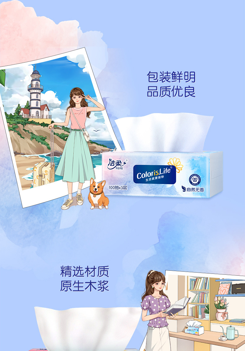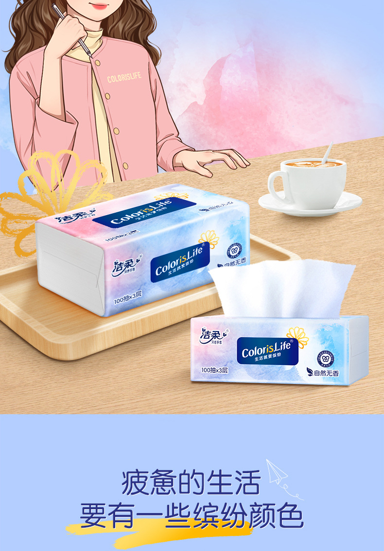 洁柔缤纷无香抽纸20包整箱餐巾纸可湿水纸抽3层100抽纸面巾纸批发