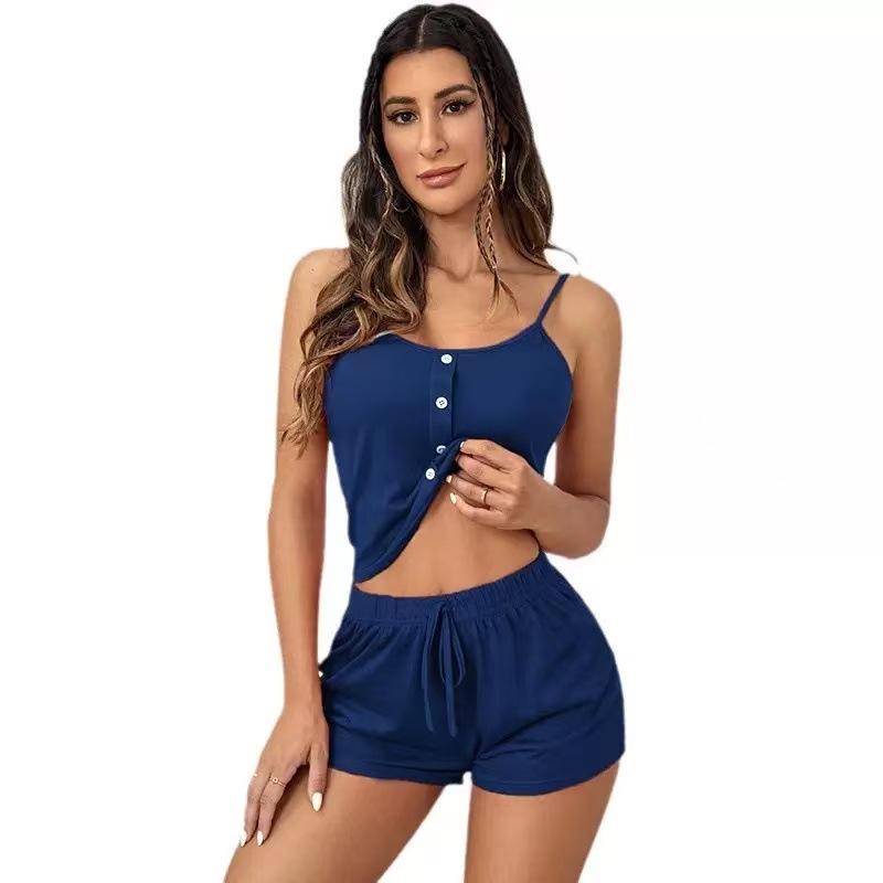 跨境新款欧美性感吊带套装睡衣女假纽扣背心短裤可外穿女士家居服