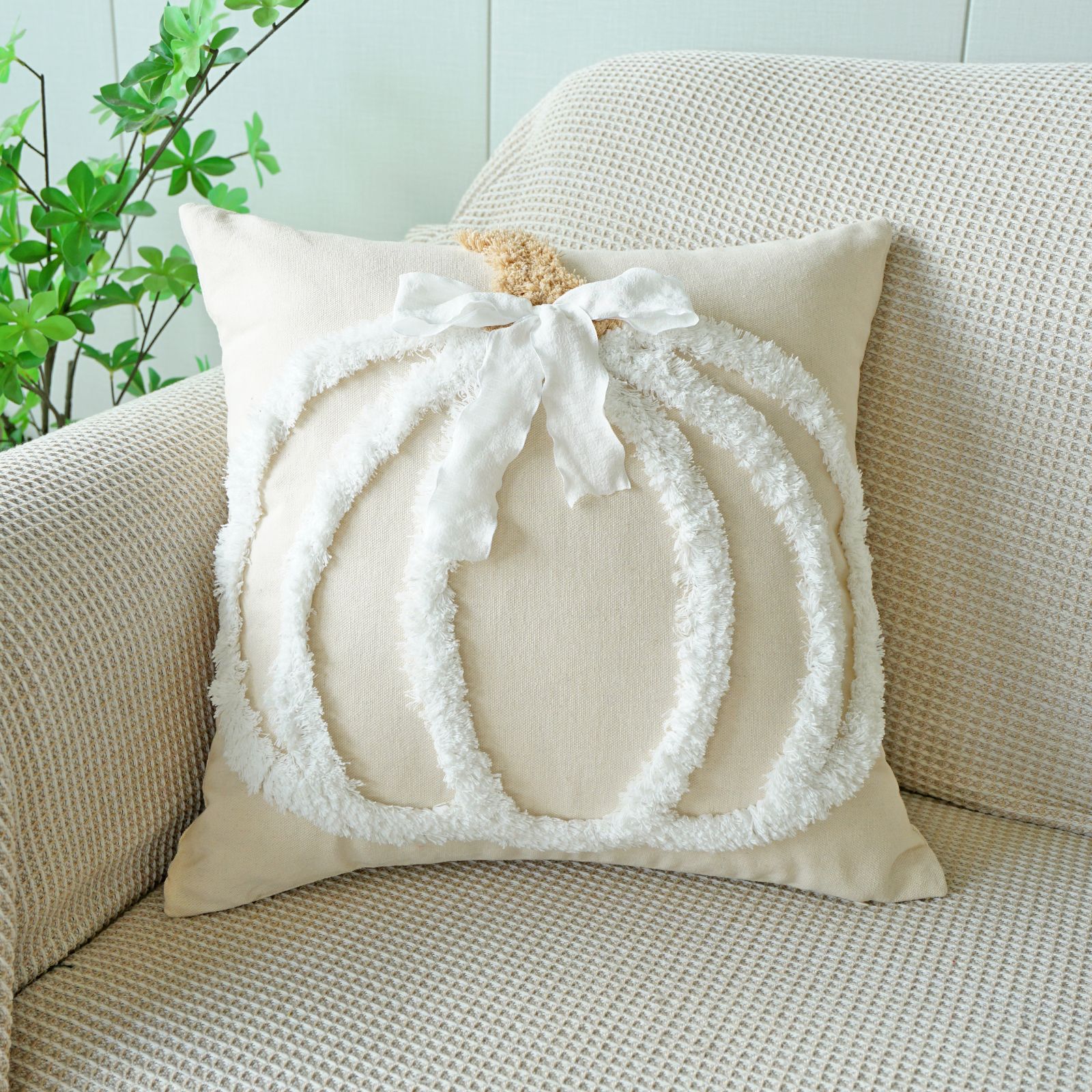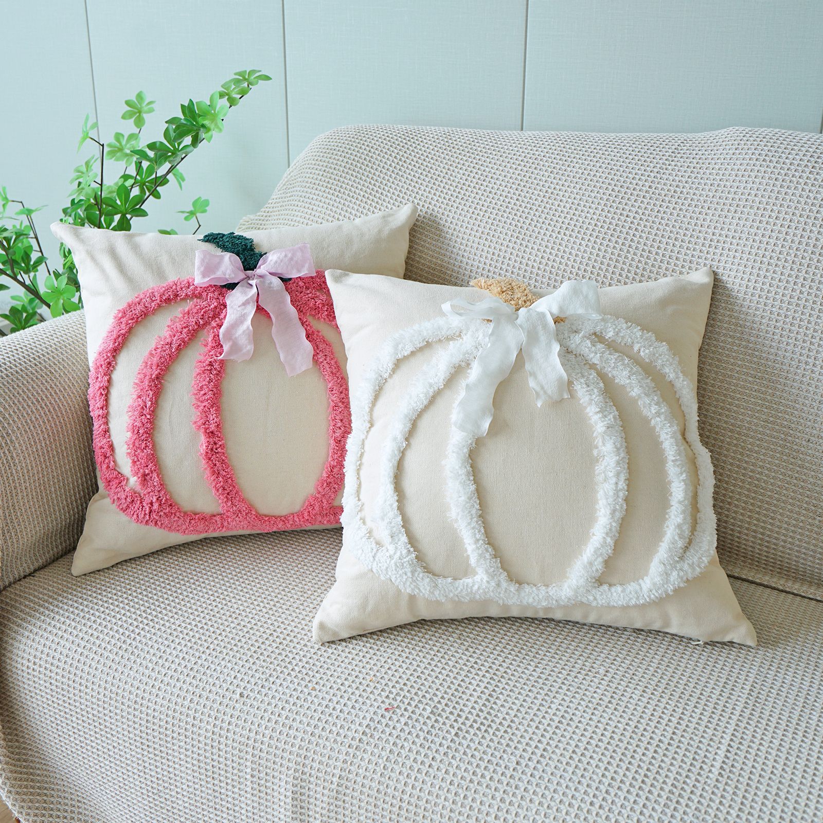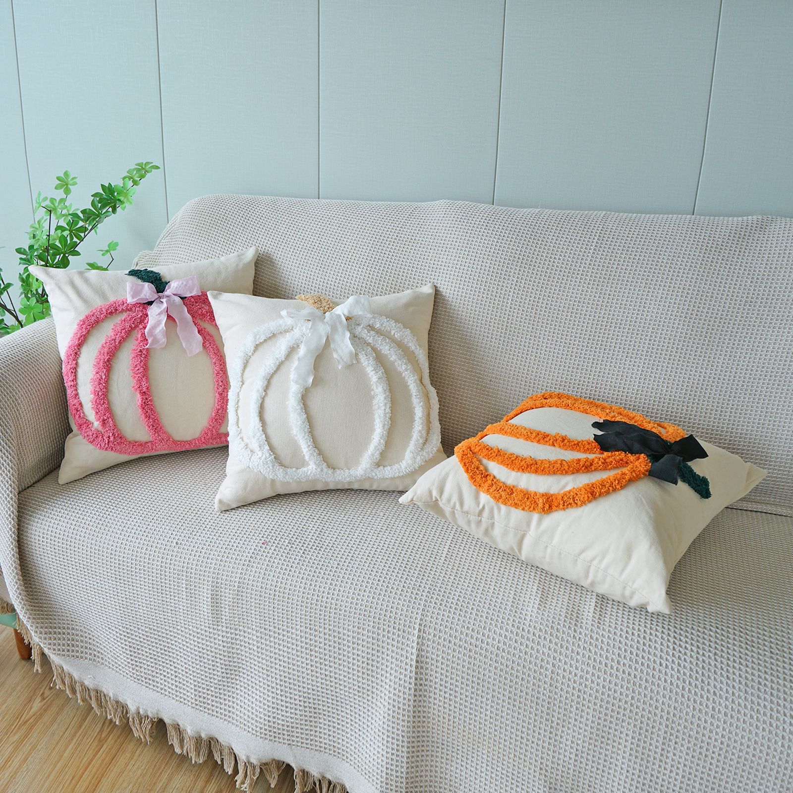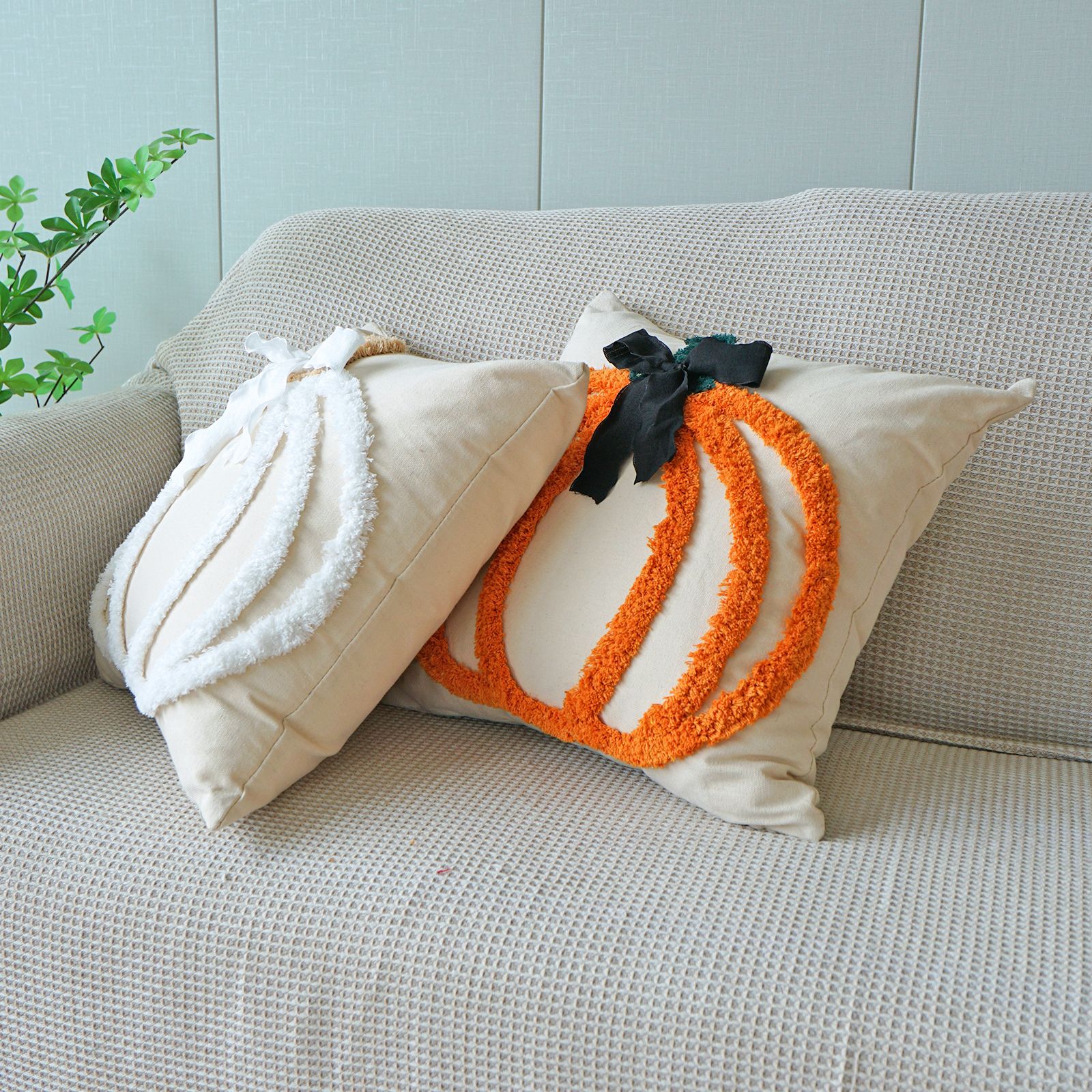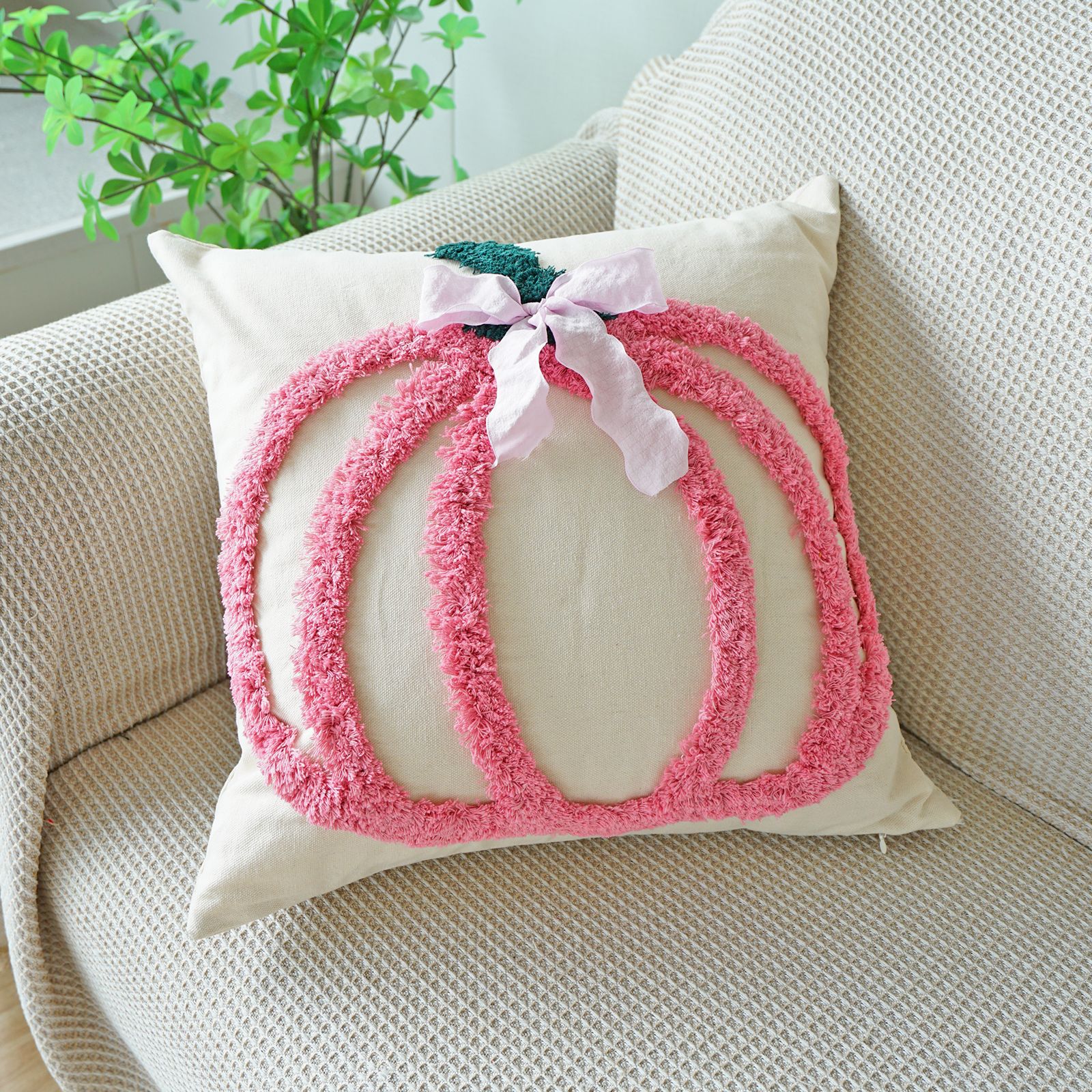 万圣节簇绒绣南瓜抱枕套客厅沙发节日氛围蝴蝶结装饰感恩节靠垫套