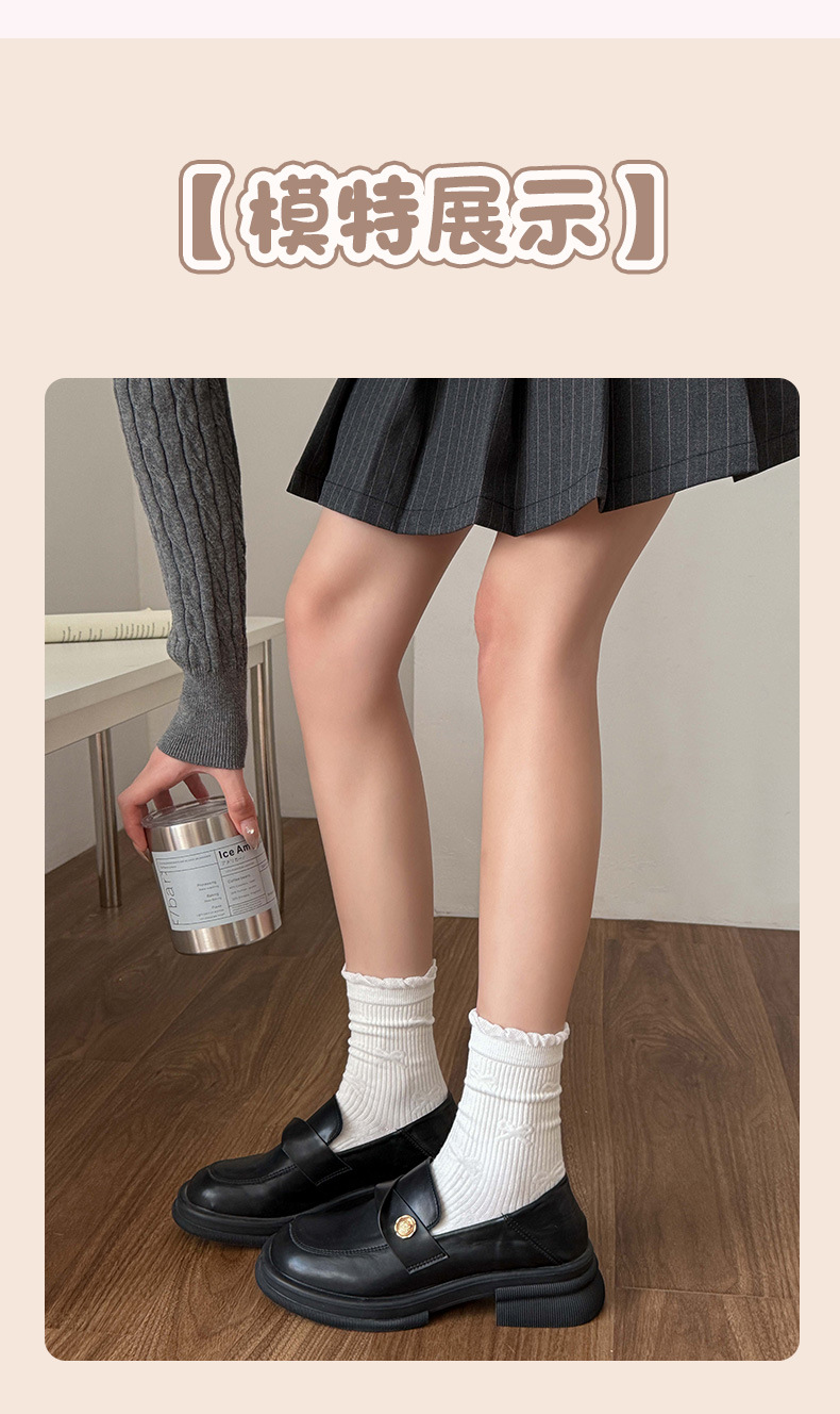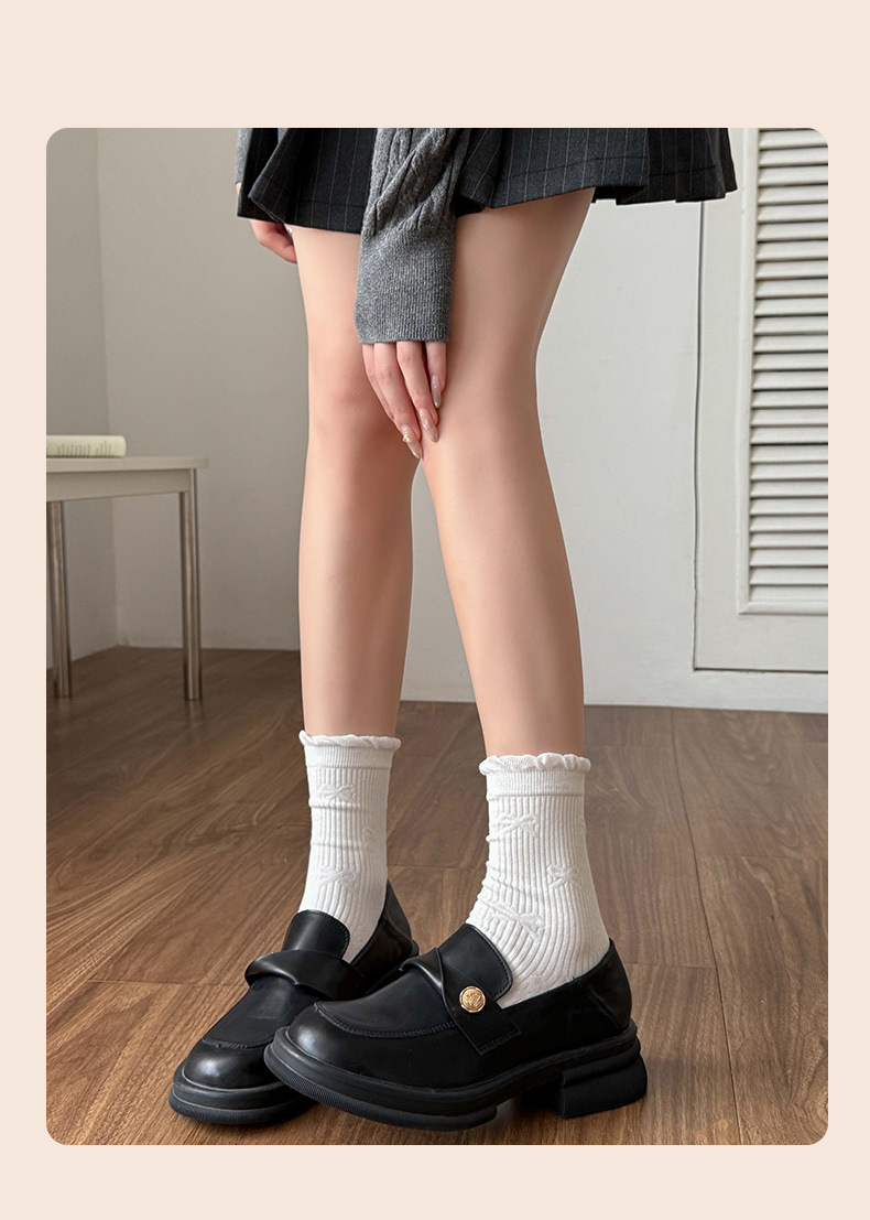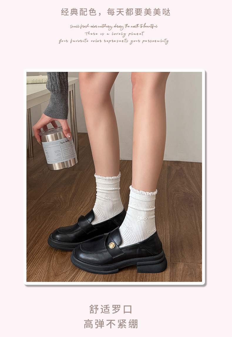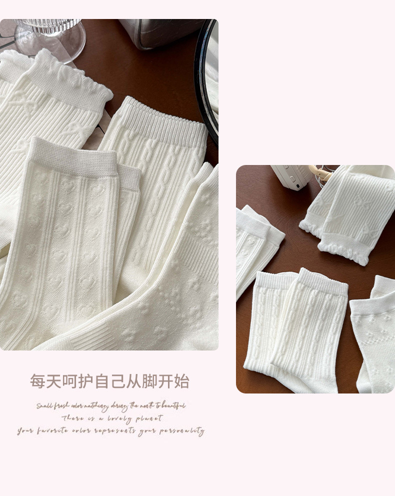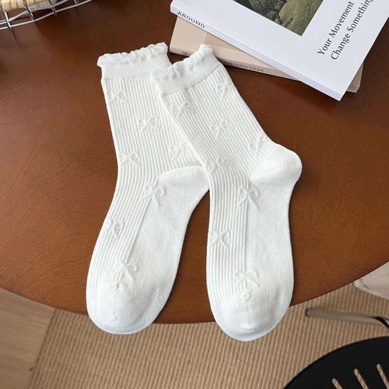 小白袜秋季新款暗纹蝴蝶结中筒袜微压无骨堆堆袜简约白色袜子