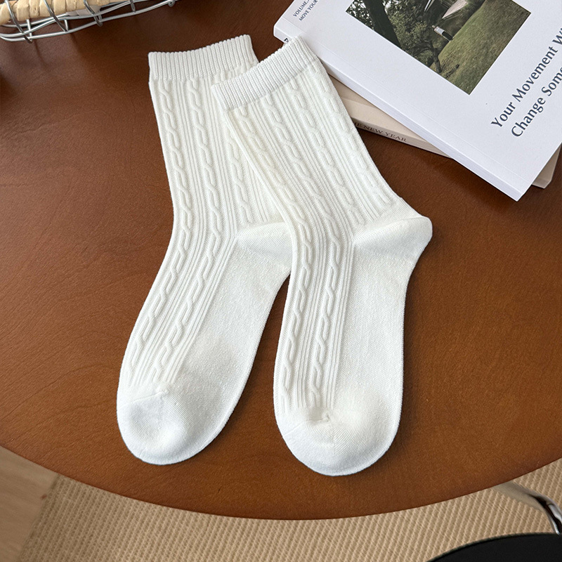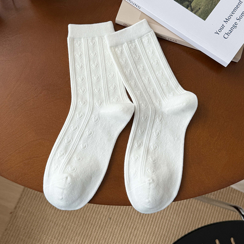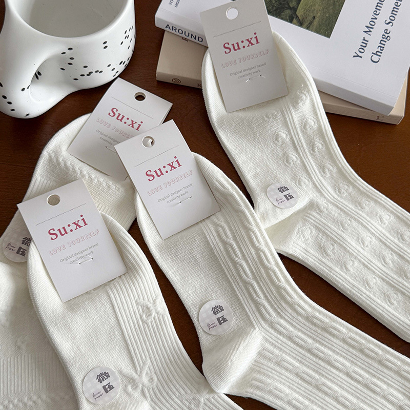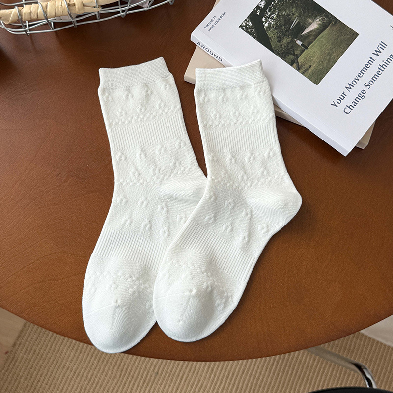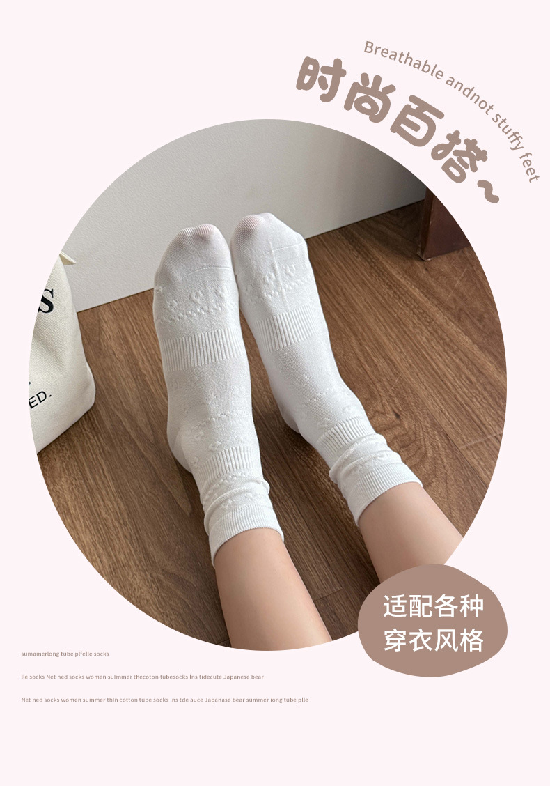 小白袜秋季新款暗纹蝴蝶结中筒袜微压无骨堆堆袜简约白色袜子