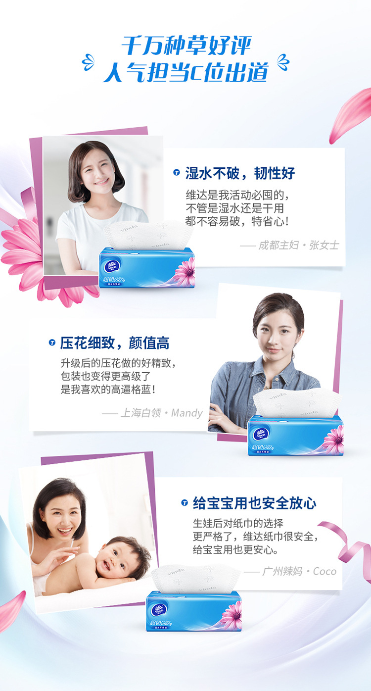 维达超韧抽纸3层100抽软抽面巾纸湿水家庭装卫生纸巾