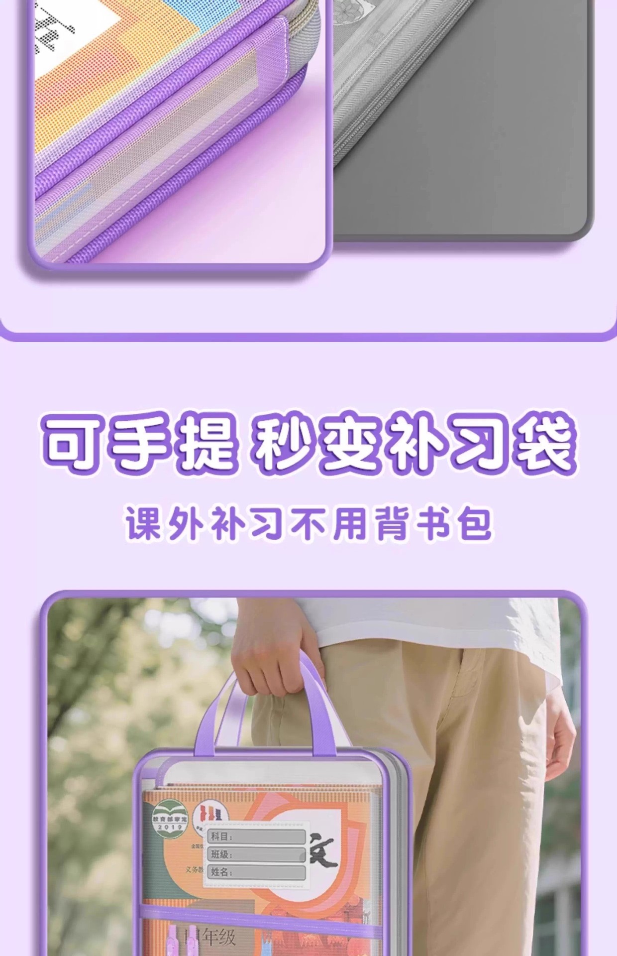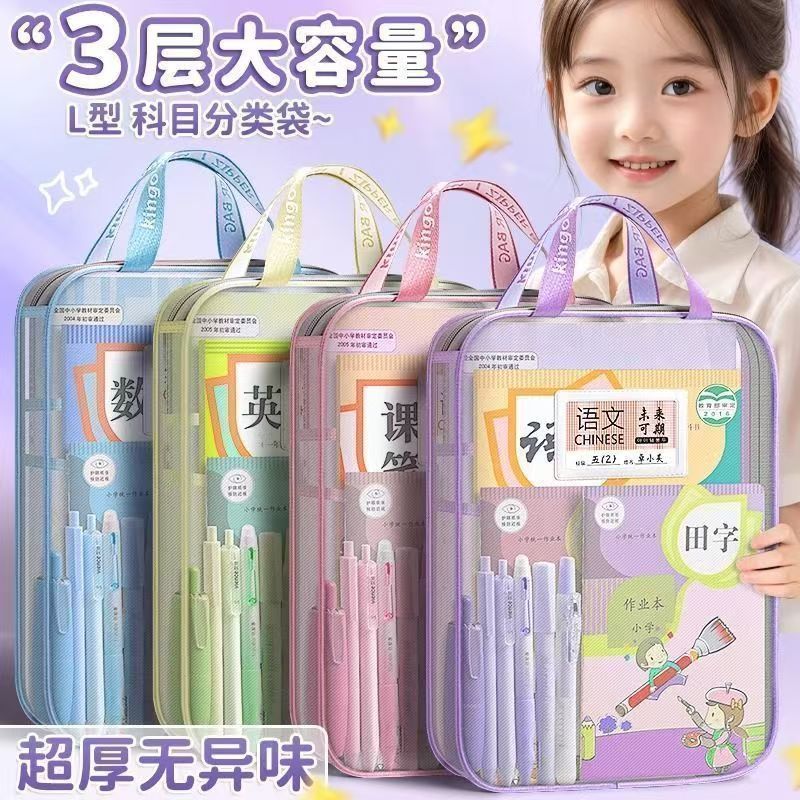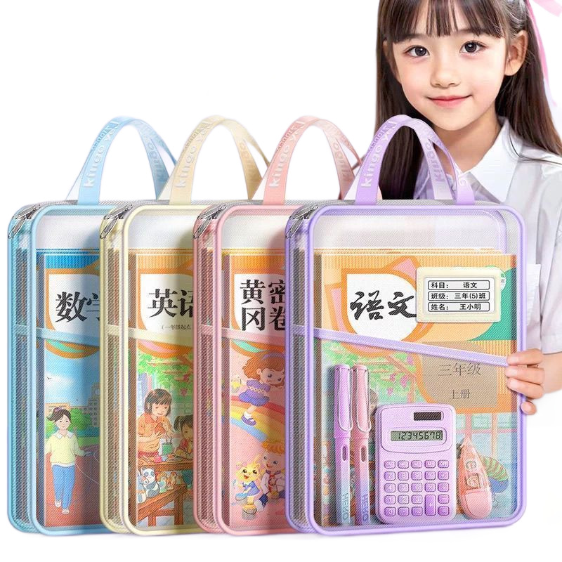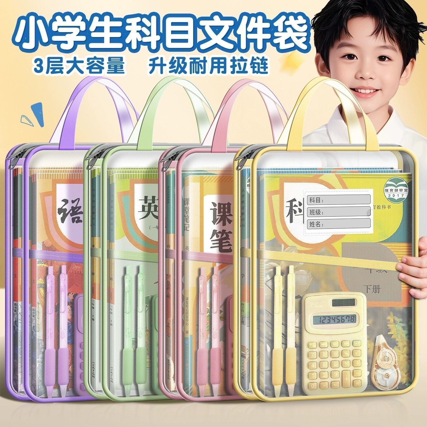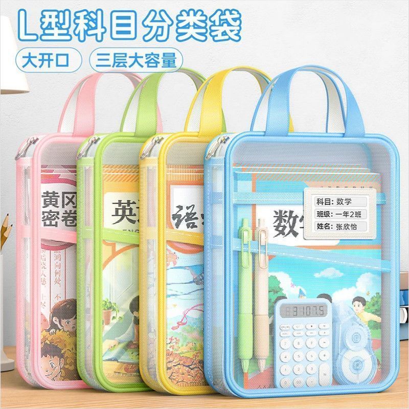 型科目分类袋手提透明文件袋拉链式网纱大开口学生拎书袋考试袋初