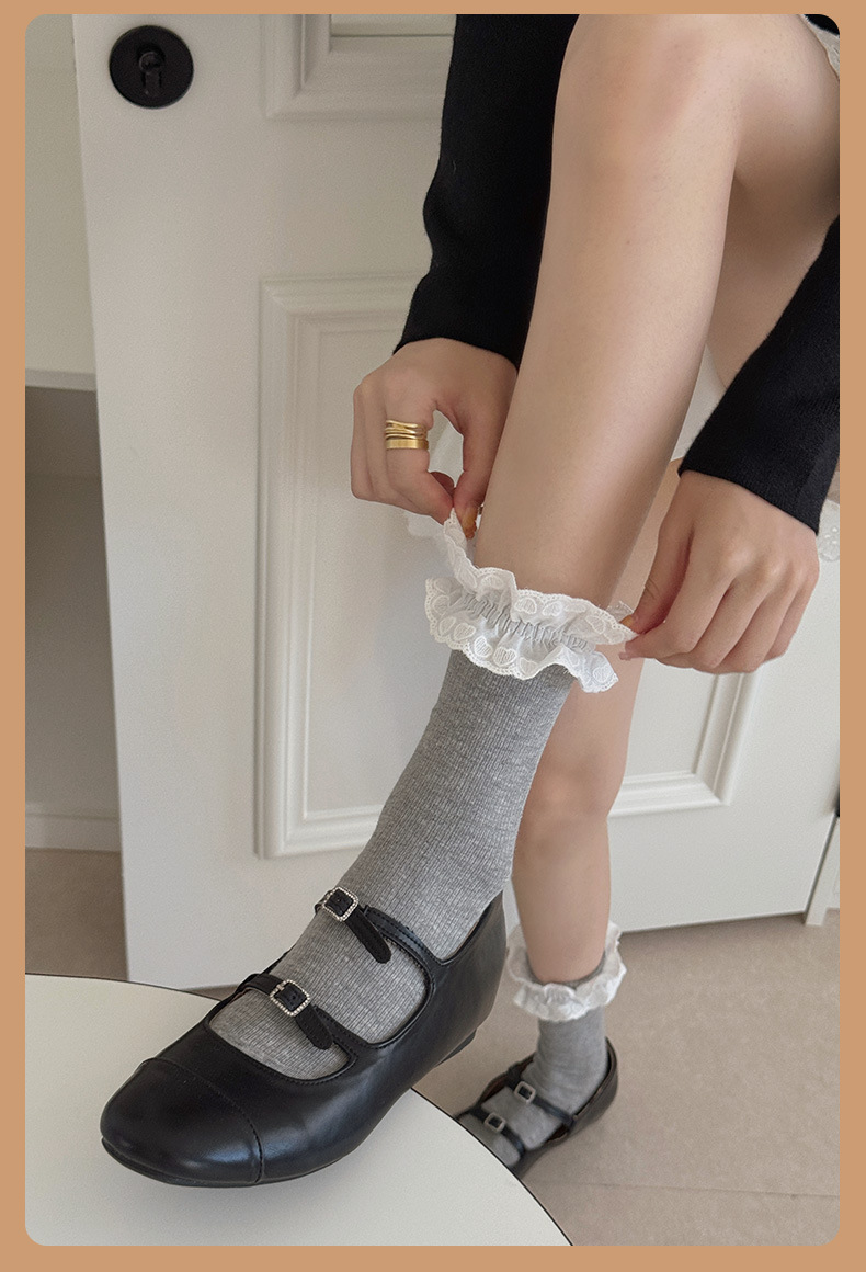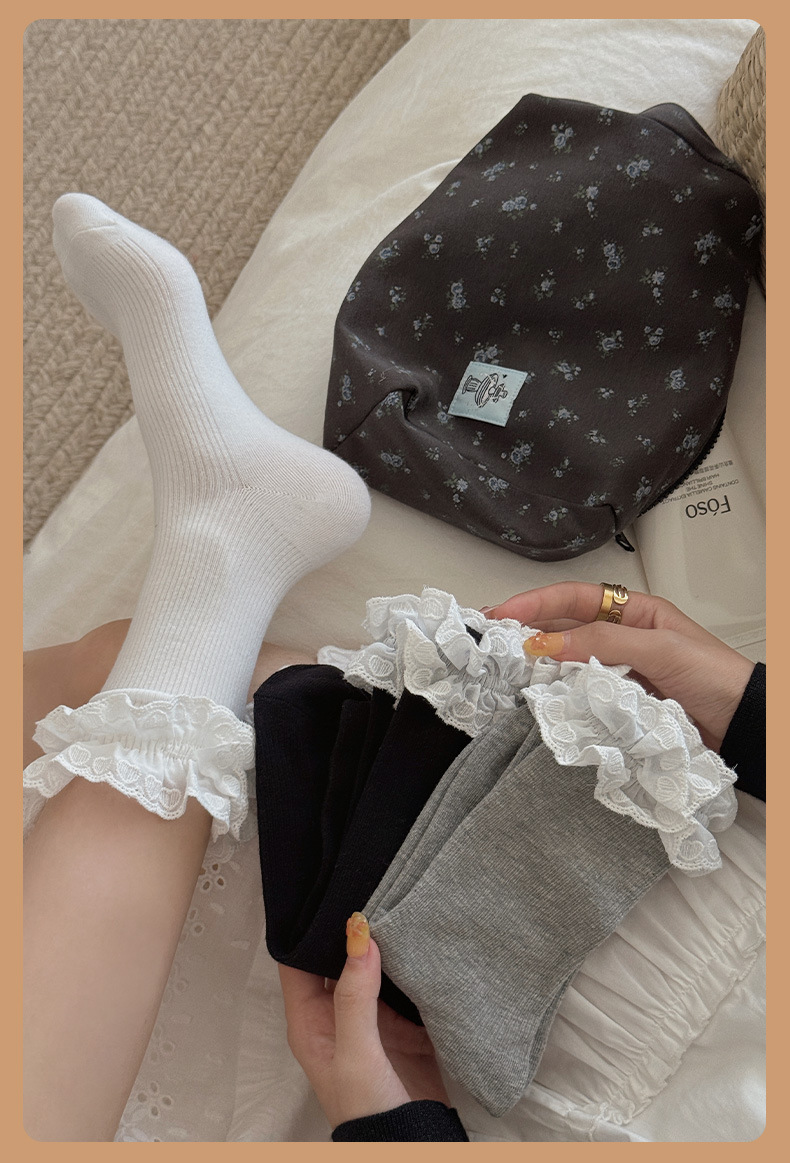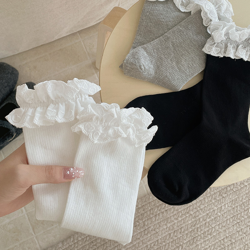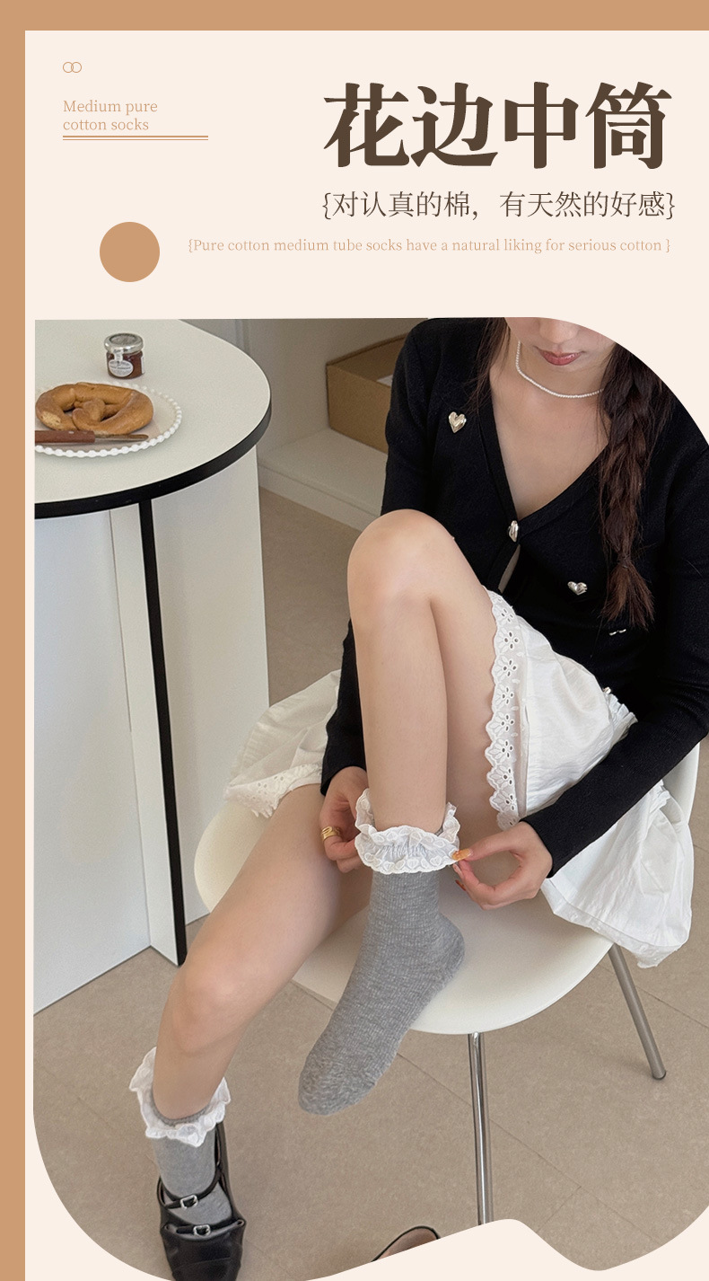 蕾丝花边袜子女秋季新款纯色中筒袜甜美洛丽塔袜子jk堆堆袜女